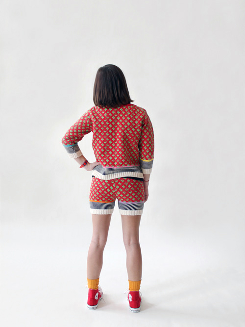 The color combination is amazing, clashing different possibilities but not contradict. And with all kinds of geometry combination to create interesting pattern. Every knitwear from her is unique, because every pieces was produced and design by her.