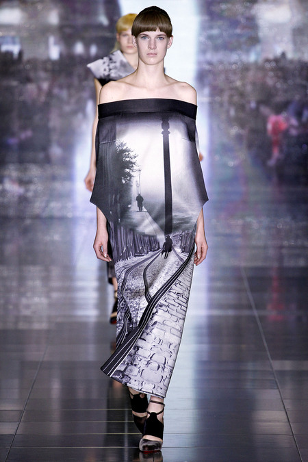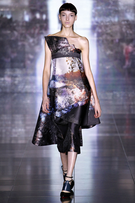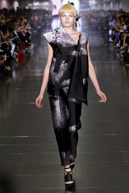 Mary Katrantzou FW13 collection jump out off their signature style – colour palette; she chose black and white as the main colour. As we can see she use monochrome photograph which inspired photographer – Edward Steichens; create a glamour pattern with mysterious atmosphere of waterfall, foggy road with street light or unknown passer on the bridge. By using the simple colour, vibrant colour won’t steal all the spotlight and the shape and silhouette can shine. In this season, there are lots of folding and layer; most of it is influence by Japan Origami fold and kimono. From the material use, Katrantzou is always pushing herself to another challenge. Embellish with metallic thread on asymmetric dress or leather embossed with print shows the sophisticate craft technique she got.