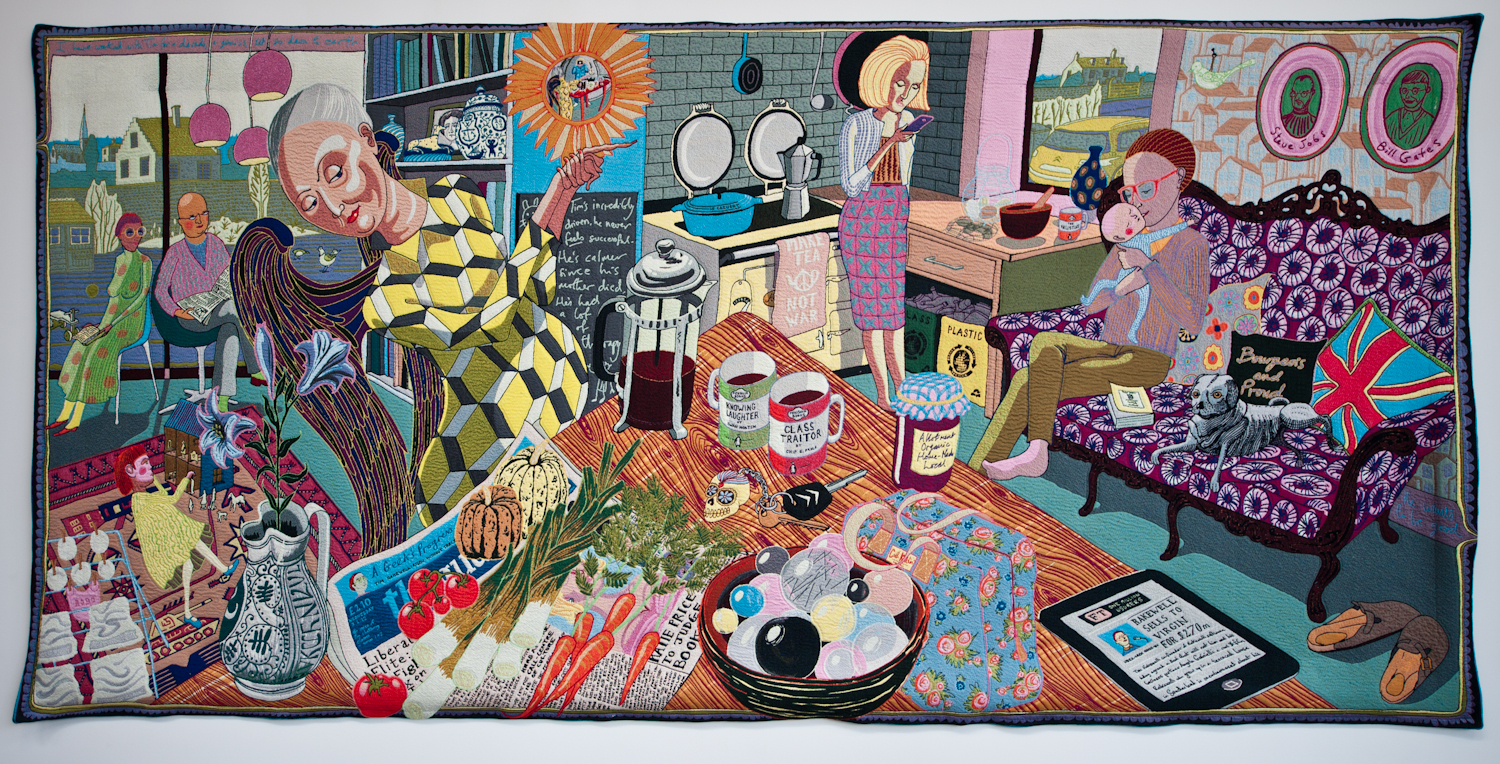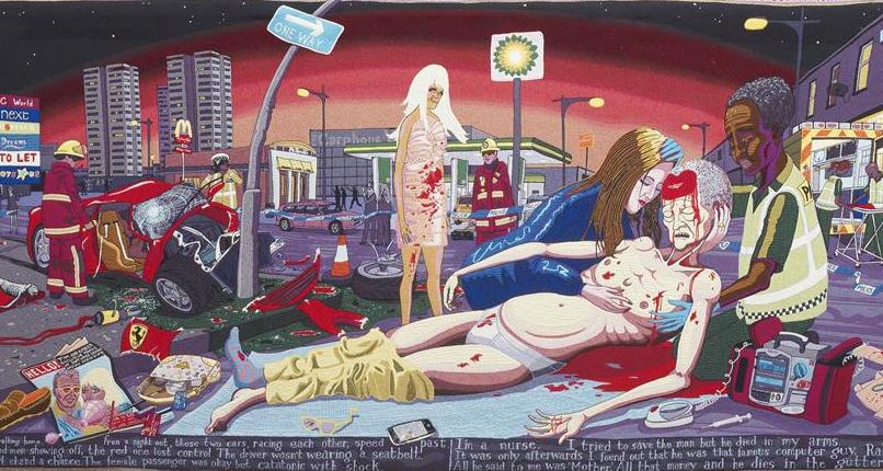 After the exploration through various classes, he came up with six tapestries. The tapestries are a modern retelling of Hogarth’s Rake’s progress. It tells the story of Tim Rakewell, he born from poverty, and then he earn a fortune to move his social status upward. Unfortunately, he dies after crashing his Ferrari simply because not wearing the sear belt. The final tapestry state “ Taste doesn’t matter, it argue, when you leave the world naked.”