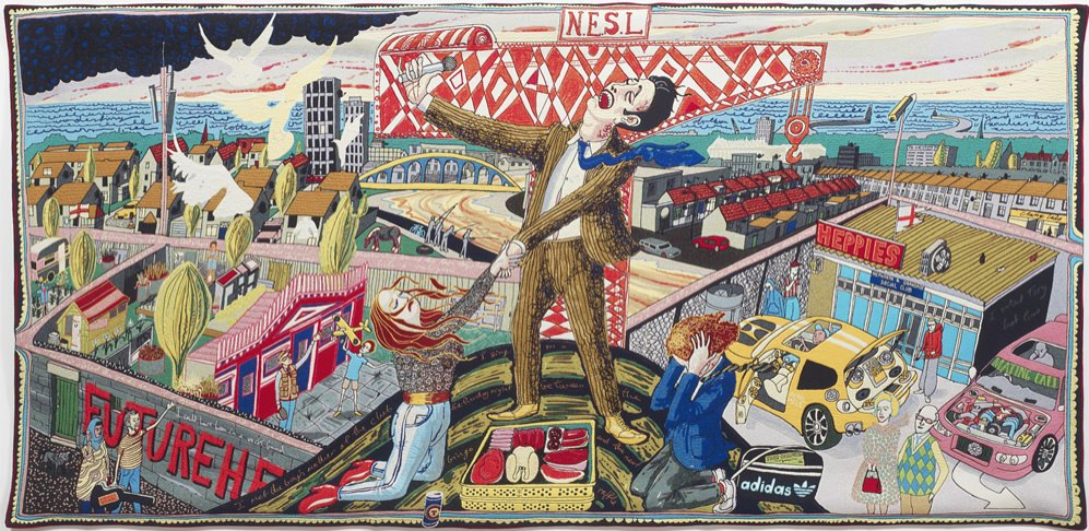 Grayson Perry, he was invited to created a documentary about the class and taste for channel 4; at the end, he presented his work according to field research and created six tapestries to represented taste based on classes. In order to get inspiration, he experiences the life from working class, middle class to upper class. So then he traveled from Sunderland to get ideas for his working class work and the British middle class Tunbridge Wells and Kings Hill; Moreover, he explored the upper class in Gloucestershire, Cotswolds. Through traveled in different places, he indulged himself to the local society and mimic the way they look to get the right interpretation.