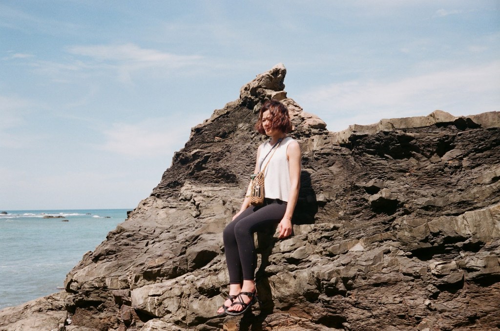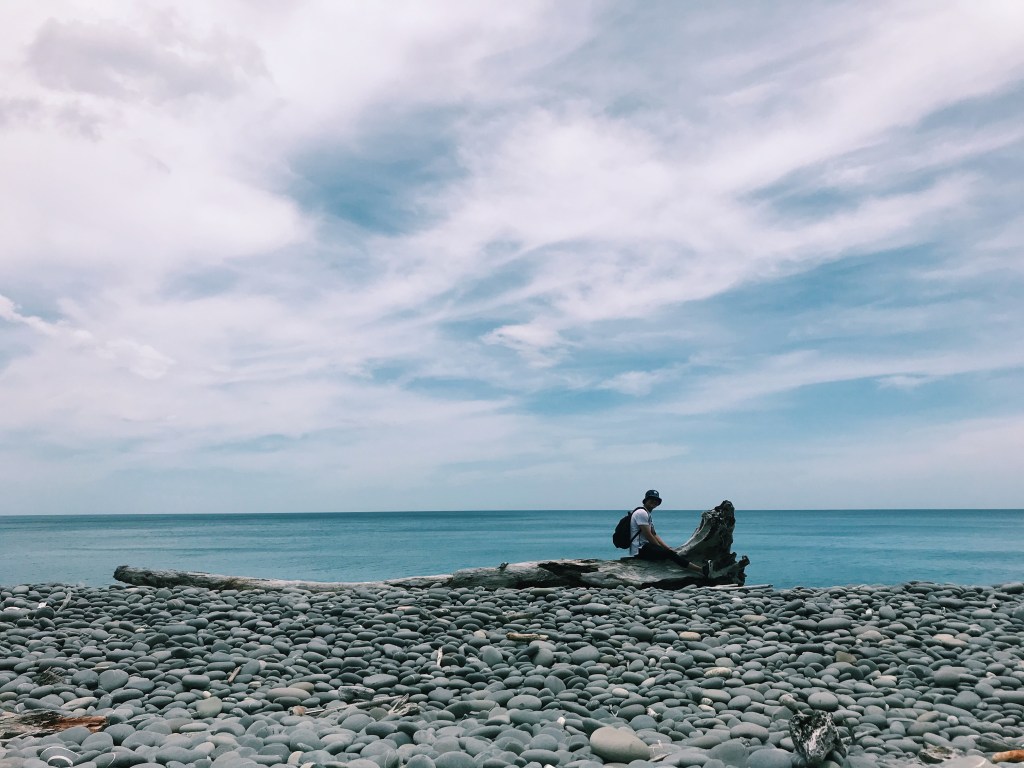 枯木在礫灘上呈現最天然的裝飾,海浪的風陣陣的吹來.走在礫灘上隨著石頭跳動著,這時候嚮導拿起了一個椰子,看起來像是留著狂野頭髮的臉,說這個Wilson(Wilson是電影浩劫重生,男主角用排球畫一個臉當作自己在荒島的朋友).每次嚮導都可以認出有趣的植物和動物, 我們拿著那顆椰子玩的不亦樂乎,還用竹子和石頭組成頭重腳輕的下半身. 走一個南田礫灘讓我們一直有新發現. 經過海浪的推打所製造的聲響像是鞭炮聲一樣,那時候在遠方的時候還真的以為是鞭炮,原來是石頭推擠的聲音. 接下來要穿越觀音鼻山,會是一段陡坡,在行走之前在礫灘休息聽著海浪與石頭的的協奏曲.