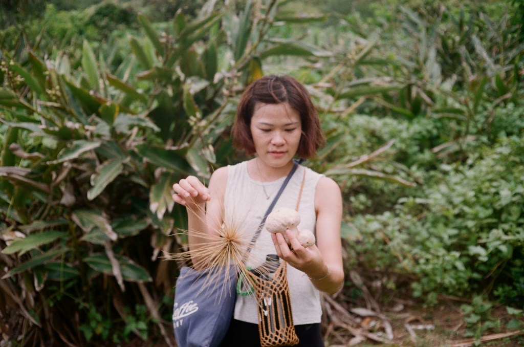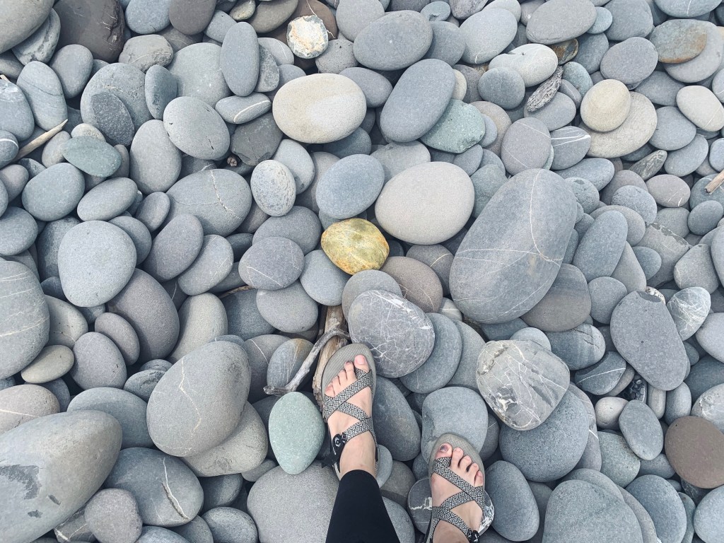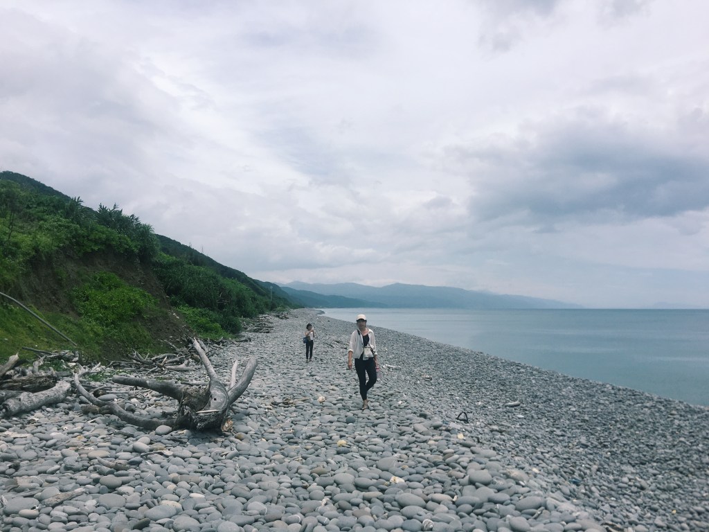 下了車我們在補充了一下防曬,準備要啟程了. 看到旁邊的海就很興奮,要記得把證件帶著,他們會檢查身分才能通行歐.從海岸邊的道路我們要下切到海邊, 行經兩旁都是樹叢的小徑,偶有小狗出來探頭好奇我們這些訪客. 黑藍色的蝴蝶棲息在地上,嚮導拿起一個造型刺刺的果實,放在地上隨著風到處滾動很可愛,這個叫做濱刺麥. 路邊還有飽滿的菇類,圓滾滾的好像一顆大饅頭. 阿朗壹古道分為四段不同景觀所組成,一路上都讓我們驚喜連連. 逐漸的我們走在長礫石灘上,散落著扁又圓潤的鵝卵石. 走在上面石頭之間摩擦發出框框的聲音,細看每顆石頭自己都有不同的外衣.