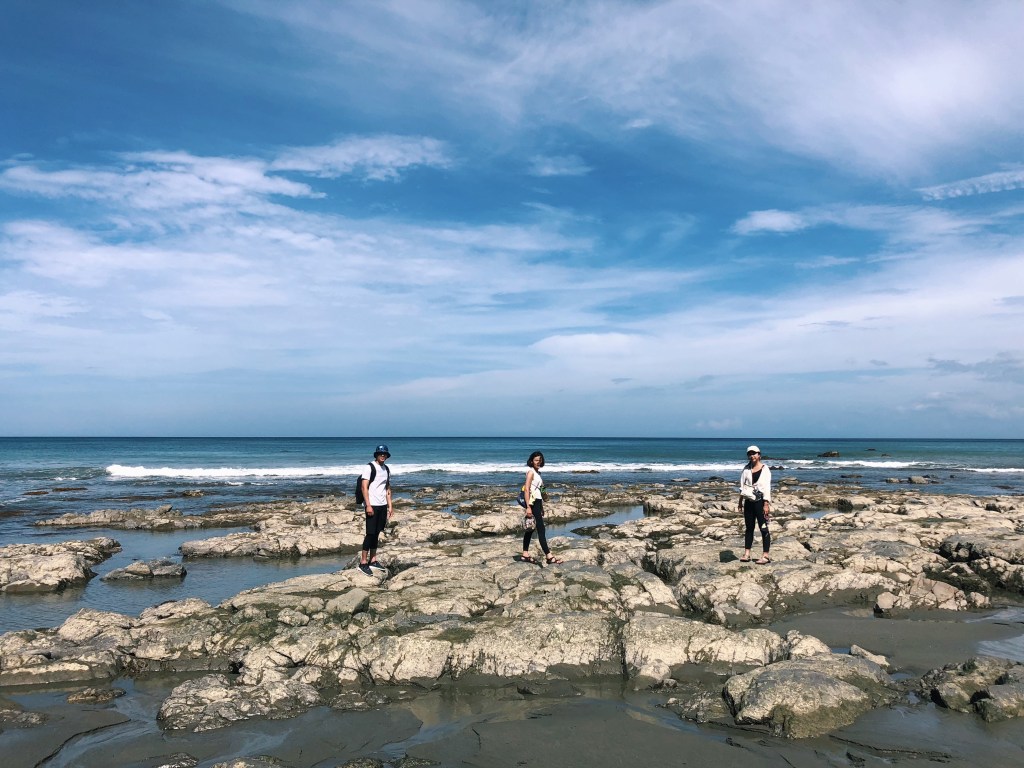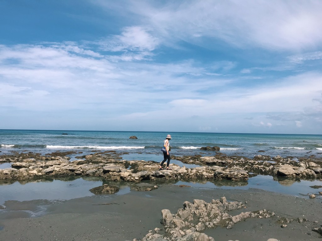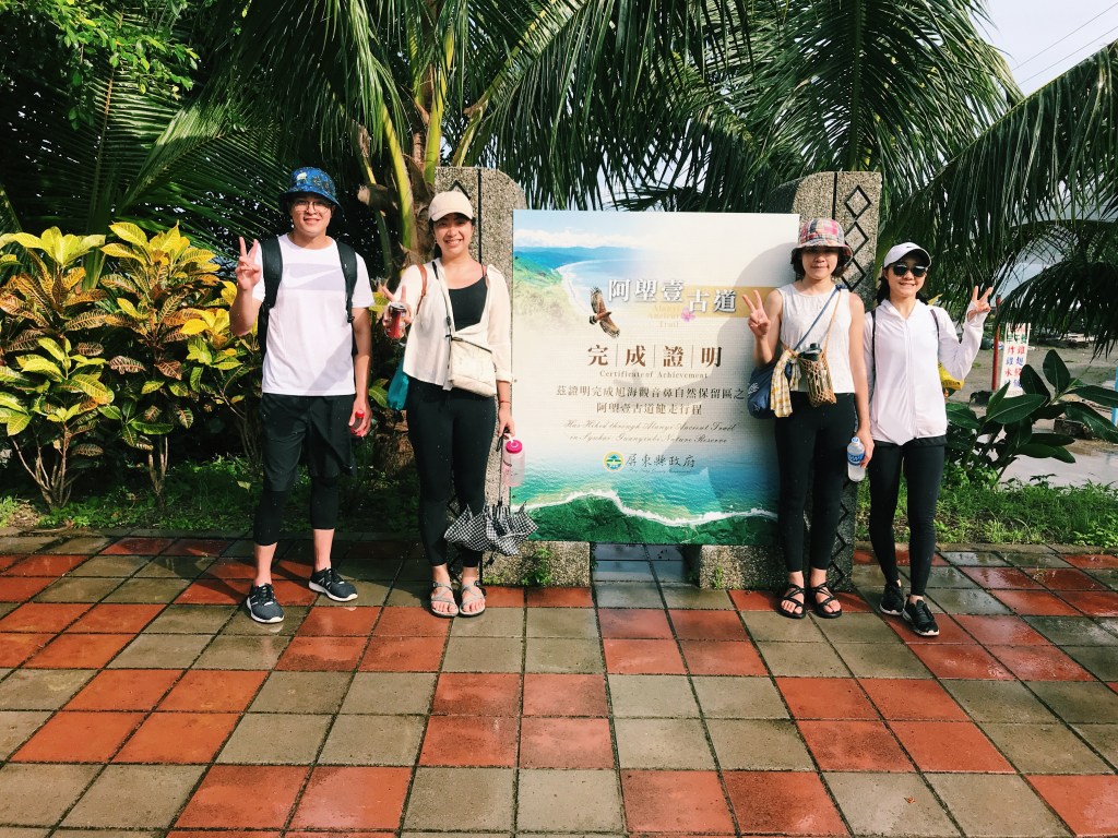 經過大岩塊地區之後就進入平坦的沙灘,這段古道也快到了尾聲. 海水灌注在沙灘外的礁岩上,我們在礁岩跳耀著,在沙灘上看著小螃蟹快速的跑到沙子底下. 在次回望著海岸線覺得舒爽. 這一路生態景觀極為多元,有礫灘,岩壁,森林和沙灘,處處都是驚喜,有山有海的路線. 回到車子的路上,有個無人商店,立即買一罐汽水來喝,真的是太沁涼了! 最後東方足跡還每個人發一張完成證書好可愛,恆春另外還有浸水營古道,那個是走在山林裡面的,如果要走那個真的要等天氣沒那麼熱的時候了! 今天吸收了太陽,山和海滿滿的能量,真的很開心能完成一直嚮往要走的阿朗壹古道.