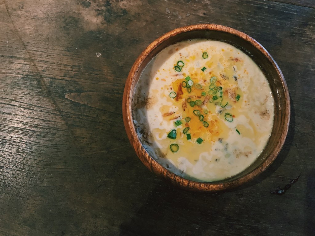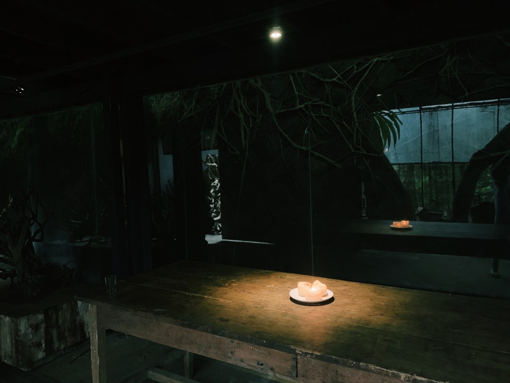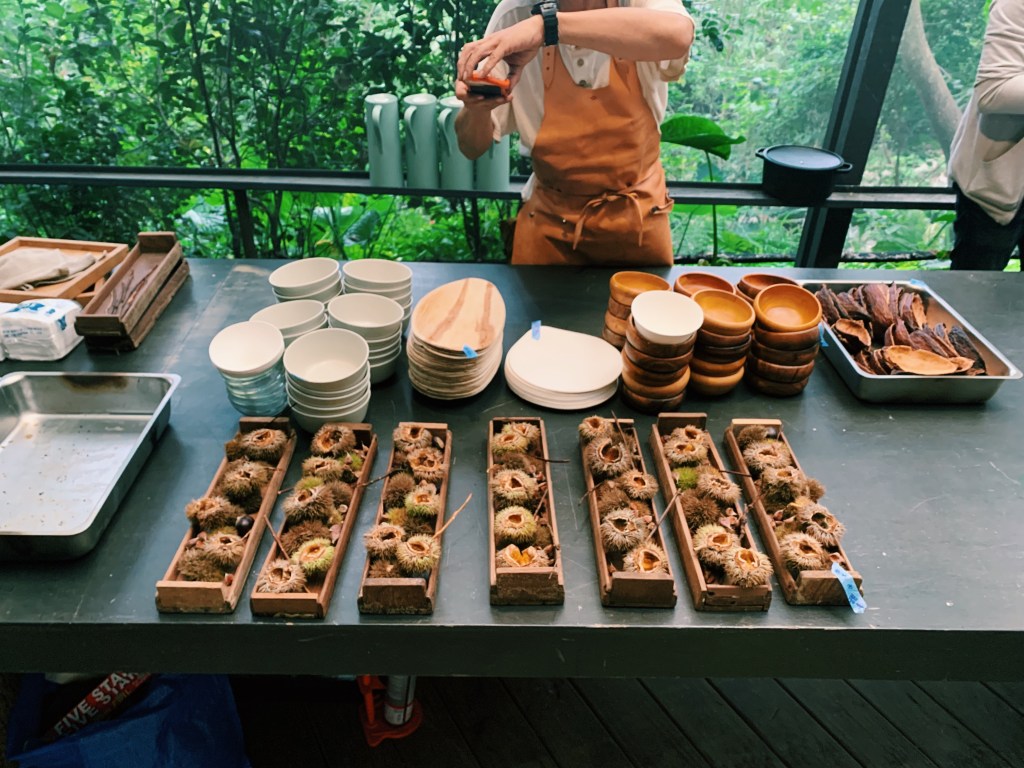 製作完竹筷之後就是讓人期待的餐會時間,我們在抵達時就有看到掛在木頭上煙燻的培根,在前一天就開始煙燻了好幾個小時.讓我無比期待料理的呈現,我們坐在透著玻璃可以看到充滿樹木的氣根旁邊,跟我們同桌的有Camp de Amigo的主辦人,還有厲害的壁畫家Gravityfree (PariPari門外的那兩隻老虎就是他們畫的). 在每道料理上來的同時好福食研的Wes和長野先生會輪流講解每一道菜色的靈感與組成,在品味的時候更能了解他們在食材選用的用心. 第一道上來的是「漬山蔬」,利用可可的殼去盛裝,從下往上層疊了樹豆和木鱉果,上方佐了青醬(是由野菜,橄欖油和核桃製成),最上方的黑色條狀是春天的野菜:蜂斗菜並用日本製作長備菜的一種方式”伽羅煮”所製作出來. 吃起來就彷彿置身在春季清爽的氣候中.