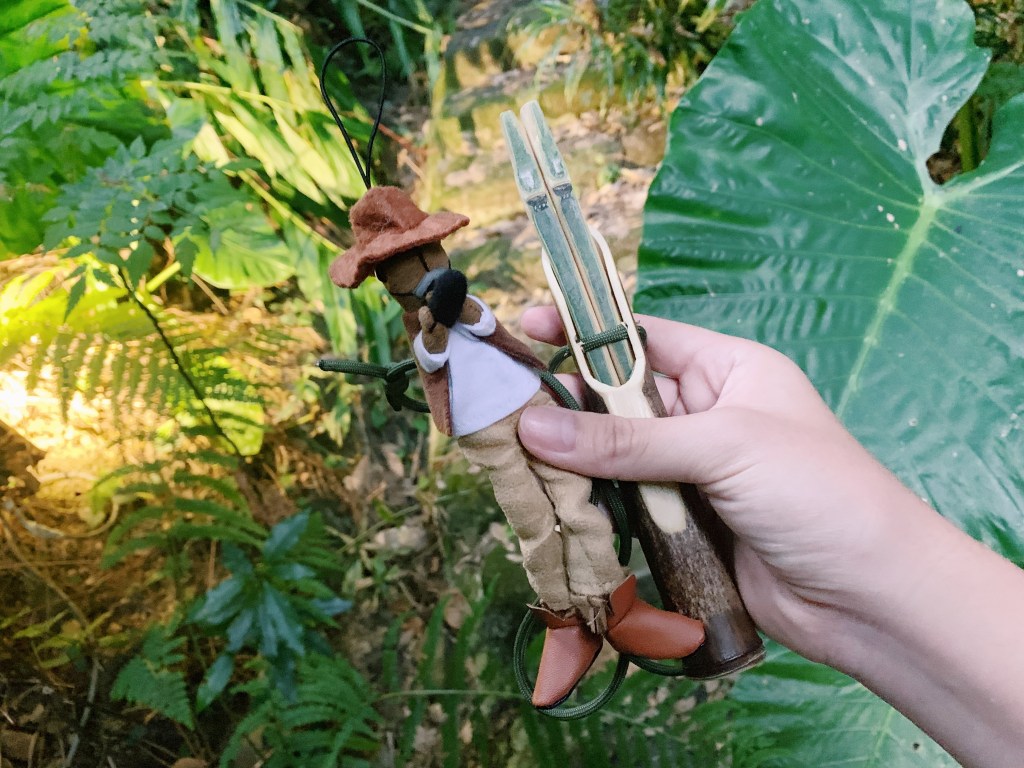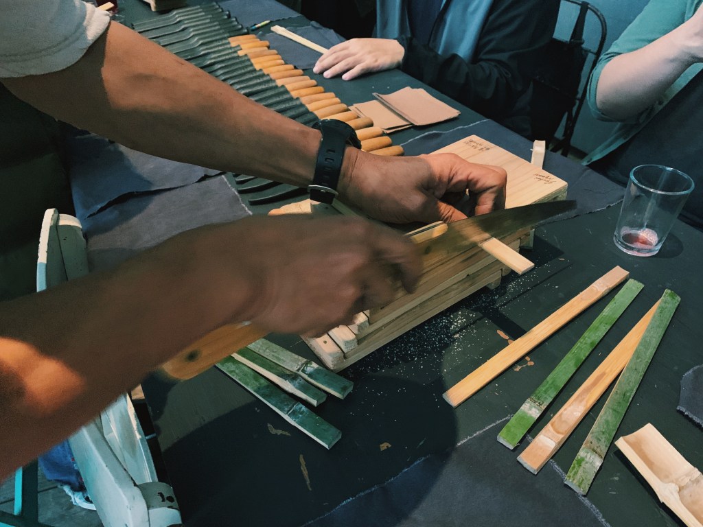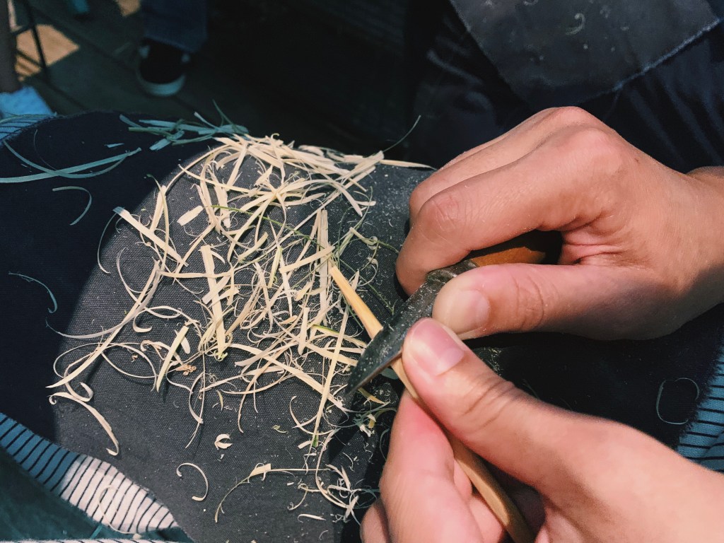 長野修平的生活就像是夢幻野外界的一日三餐,擅長戶外料理,並能用大自然的素材做出生活道具. 能感受出長野先生對於生活的熱愛,言談之中的幽默與親切感是如此的真實. 首先長野先生要帶領我們製作竹筷, 每個人發了一片竹片,此竹片是由長野先生從日本帶來的孟宗竹,本身散發出淡淡的清香. 日本人對於筷子的選用是非常的講究,根據手的大小會選擇不同長度的筷子. 測量方式是用拇指和食指比個七,大約會是比七後的拇指與食指長度的1.5倍. 長野先生示範了如何利用他提供的道具去裁切竹子,在長野先生指導下可以活用道具與了解竹片的特性將竹片輕而易舉的切成兩半. 接下來就很需要耐心去慢慢磨將筷子的尖端磨成細膩的大小,左手拿著竹子扣在大腿上並利用右手的短刀去磨. 在磨到需要的形狀與大小後就要用磨砂紙好好的將粗糙處磨平,這樣在食用時才比較安全. 我們大家全神貫注的在製作自己的筷子,完成之後長野先生特別幫我們準備放置筷子的家,找到最適合的大小後綁上繩子就可以背在身上,隨時都可以開動啦!