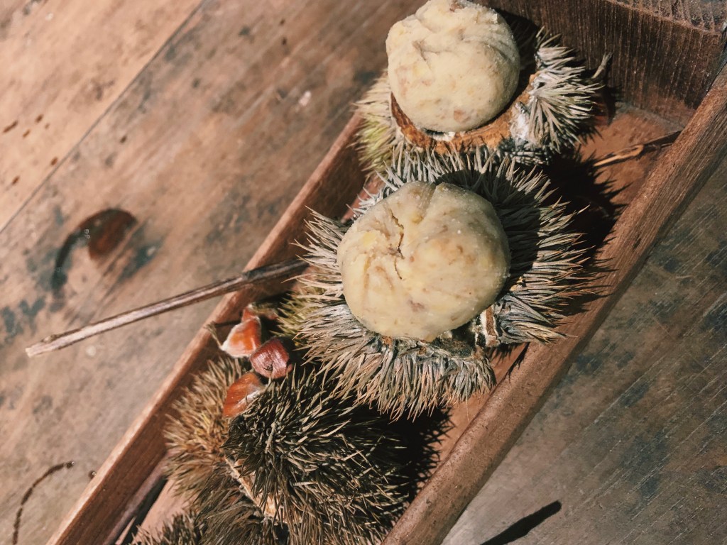 為何要把茶泡飯放在最後一道的原因是,在日本茶泡飯通常都是在居酒屋喝酒後最後要吃的一個收尾.用來飽足和解油膩. 最上面還放上長野先生私藏的米糠醃漬魚乾,是他朋友醃漬長達14年的寶貴魚乾竟然大方的帶來台灣讓我們享用. 最後的甜點是長野先生所設計的 – 栗茶巾絞, 這個名字的來由是在日本傳統茶道中,在喝茶之前都會有一種白布來擦茶碗,然而現在不會用擦的而是形成一個動作.所以長野先生套用了這個概念,把栗子等這道甜點的材料放進茶巾內扭轉而形成一個圓球狀. 放在真實的栗子殼內. 在品嘗甜點的同時,搭上台灣的品牌-三玉號野草茶,讓口中的甜味餘韻留長.