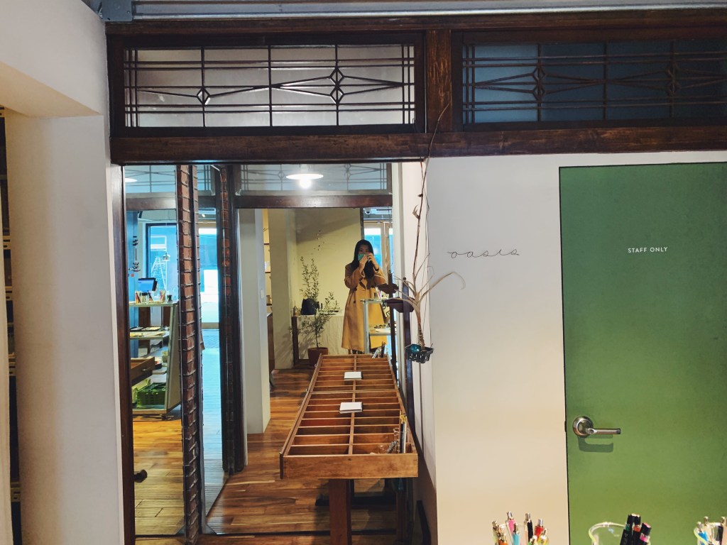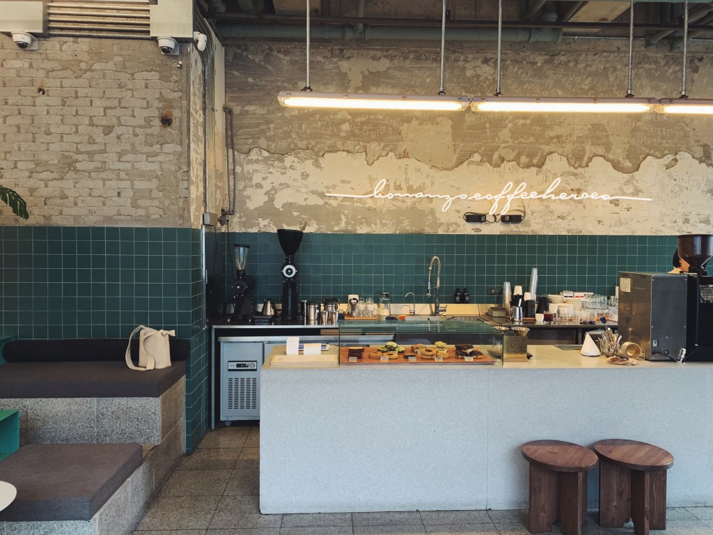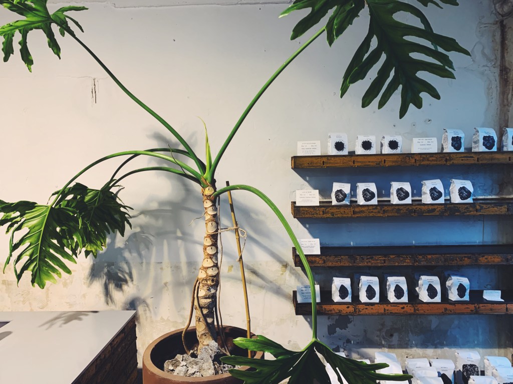 真的是一大早裡面都還沒有任何客人,我獨享這個空間. 吧檯後方留著斑駁的牆面上掛著霓虹燈,下方綠色的磁磚與懸吊的植物盆栽讓視覺感大加分. 而且旁邊有個選物空間,在沒有任何人群打擾下慢慢欣賞和享受咖啡.