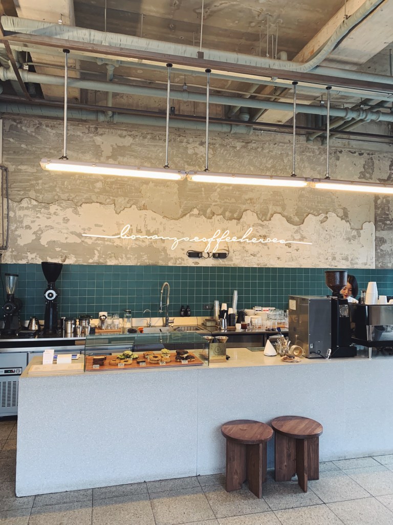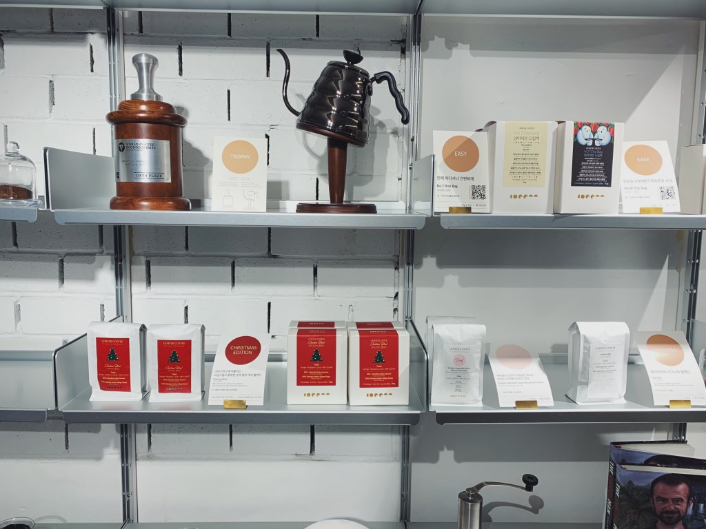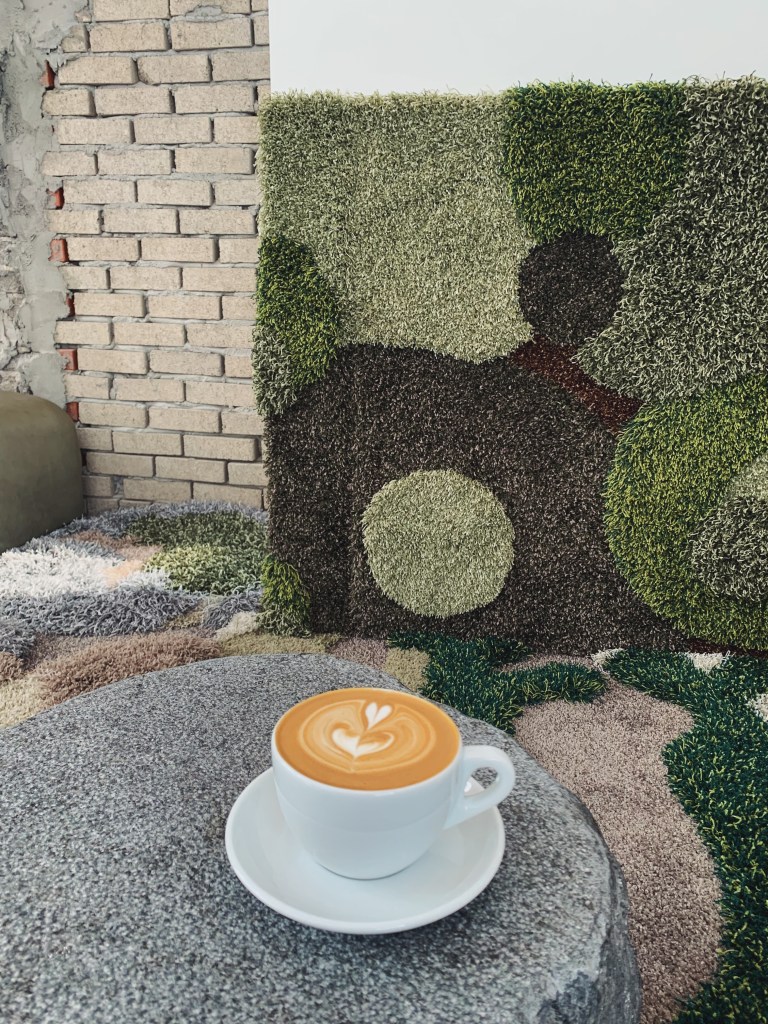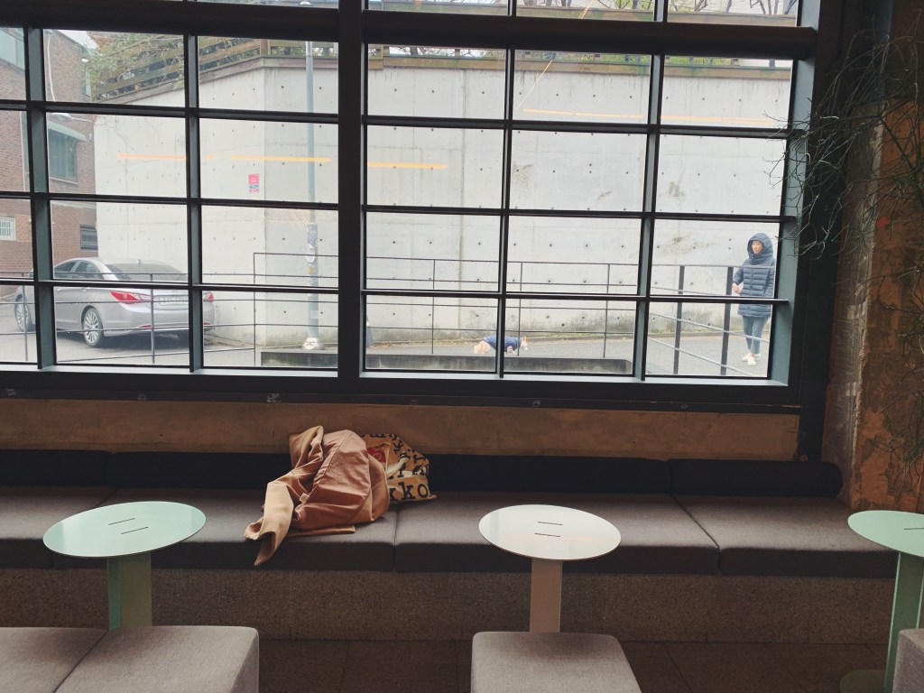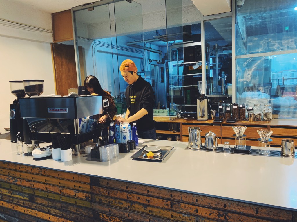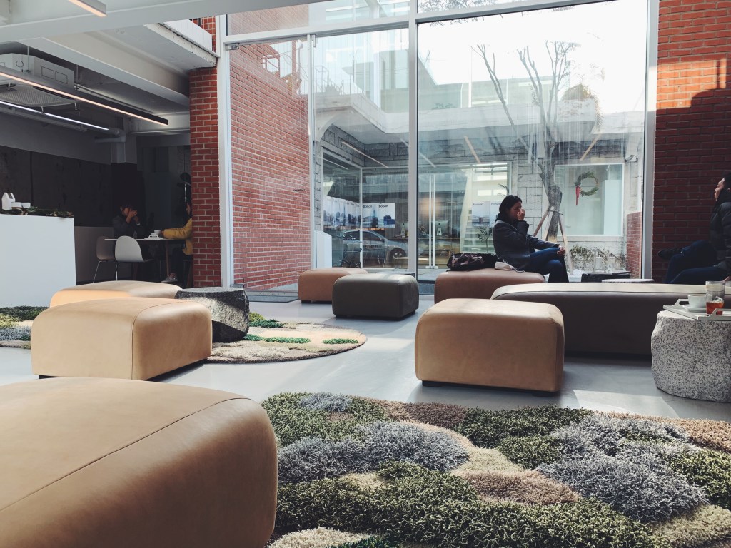 他們的咖啡是用Werk和Hytte Roastery的咖啡豆,這兩個都是釜山的咖啡品牌. 邊桌像是草地上的石頭,還有淺咖系的皮革沙發,端著咖啡的時候一直很小心深怕咖啡會灑到美麗的地毯上.