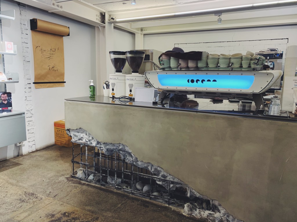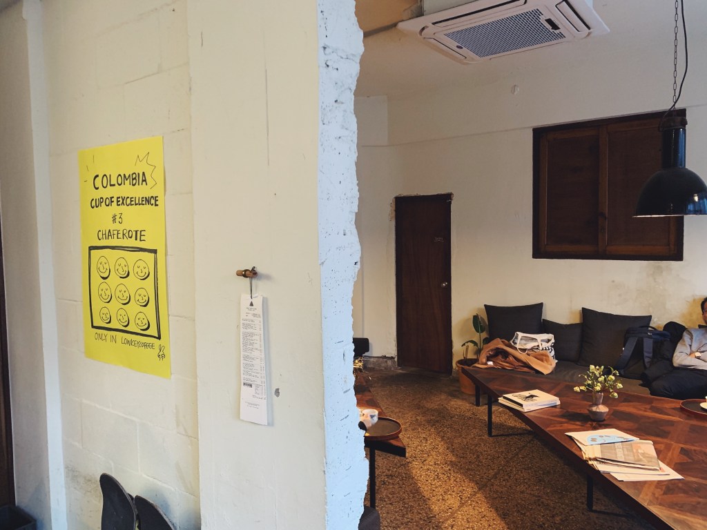 我去的是位在黎泰院的分店,位在大馬路旁邊的一棟低調的水泥工業風建築,外觀有點像是廢棄建築. 就猶如他們品牌的特質一樣目的是將猶如廢棄的空間再生為咖啡工廠. 一樓長條吧檯,後方為甜點製作區. 等候區坐著有型的年輕男女聊著天.