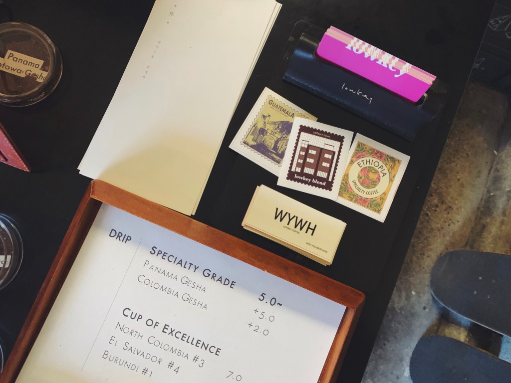 皮革製的托盤上有金色的Lowkey logo,最喜歡他們在這些細節上的用心.他們的咖啡豆包裝很有創意,製作成像是一個信封樣式,上面的郵票代表著不同的咖啡豆品項非常用心. 我也買了兩包咖啡豆回去沖煮,真的是很好喝.