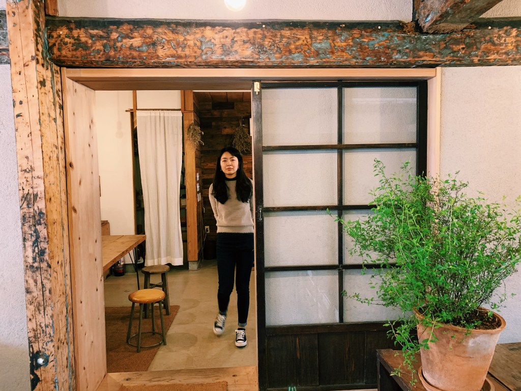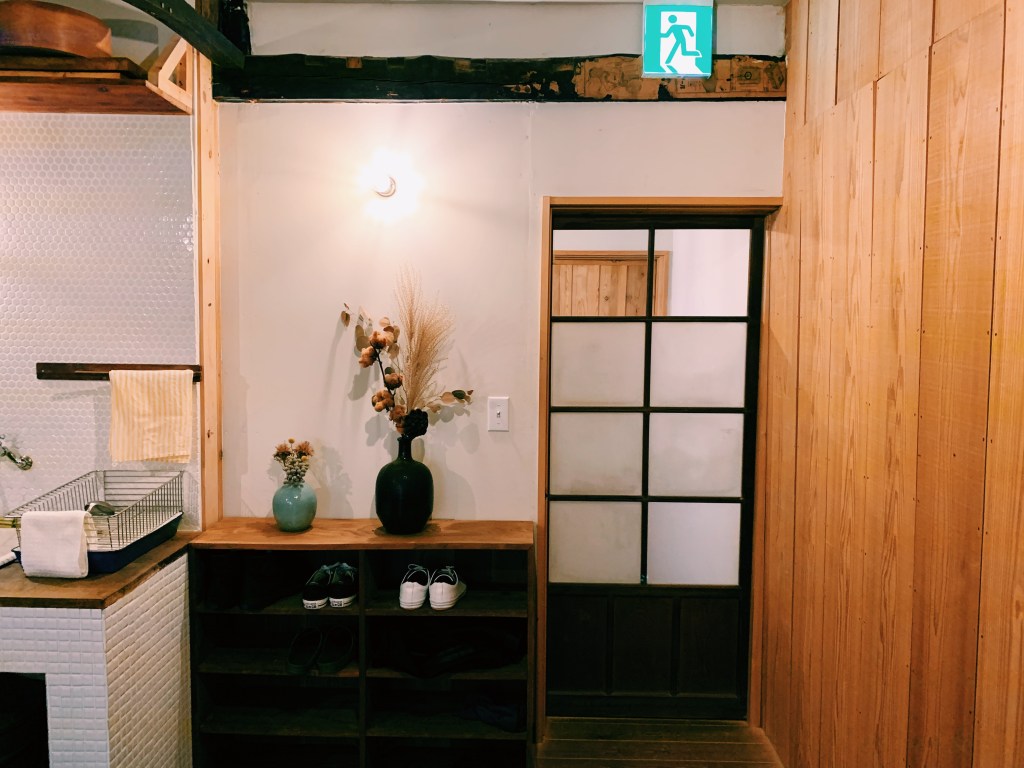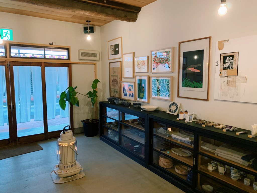 我們在下午抵達Hostel Saruya,由於我們車太大台,開不進去他們住宿後方的空地,還好斜對面就有一個停車場,而且停車費也很便宜,所以建議如果車太大或駕駛技術不好的話還是停停車場比較方便! 從遠方就可以看到門口的白色門簾,完全保有原本木造建築的模樣, 撥開門簾的拉門的玻璃上有個古錐的猴子logo印在上方. 進入室內後感受到溫暖的地爐所散發出來的熱氣,員工也熱情的招呼,裡面的氛圍真的超級溫馨. 入內前方是設計選物,陶藝插畫或生活用品等,有兩個方和圓個共用餐桌,旁邊有個大型木頭櫃內放著各種鍋碗瓢盆供住客使用. 開放式廚房的格局空間感很舒服.