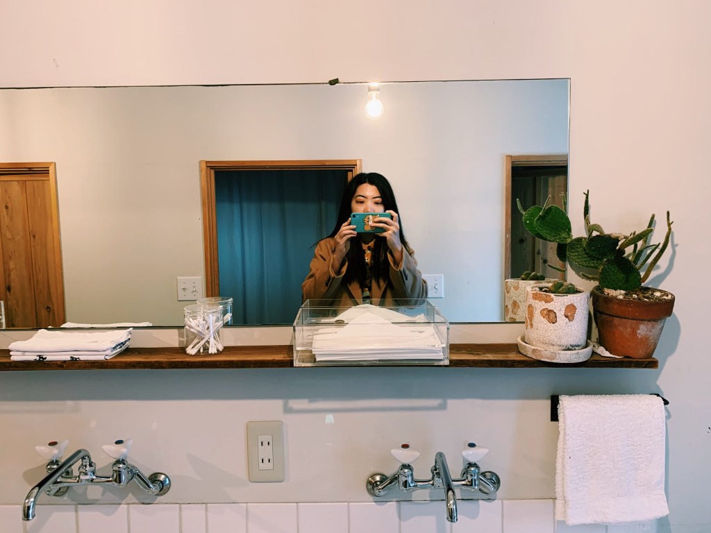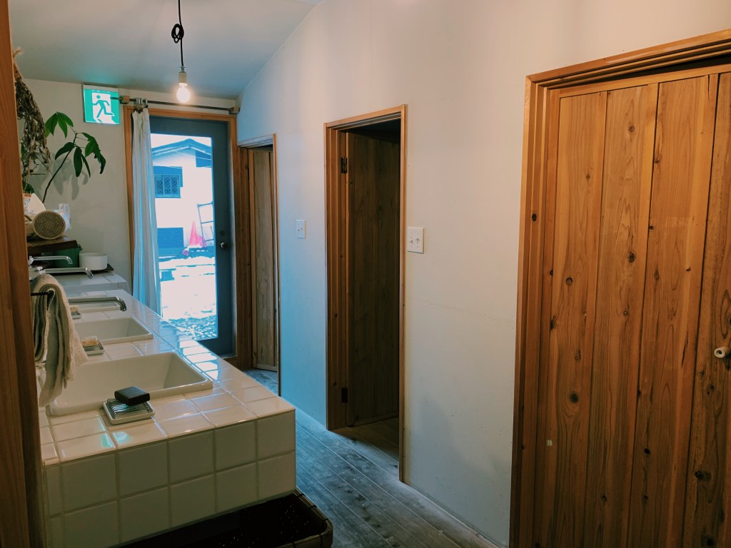 在員工的引導下帶我們了解住宿的格局,廚房後方就是洗手間,換上拖鞋踏上木板上,地板暖暖的我很喜歡洗手間的設計,全木頭的色調,廁所和淋浴間是分開的, 一大面的鏡子與純白的洗手台,每個角落都很乾淨.洗手台上面備有擦手的毛巾,棉花棒,吹風機等,整個空間散發出很好聞的精油香氣,淋浴間也有提供沐浴乳和洗髮精,而且是松山油脂河口湖廠的「LEAF&BOTANICS」,主打純植物天然的精油. 洗手間旁有個小門,可以通往後方,若晚上過了正門鎖門的間可以從後方的門輸入密碼進出.
