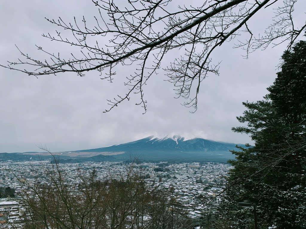 在附近有一個可以挑望富士山推薦景點 – 新倉富士淺間神社, 我們在停車場就可以看到富士山了! 沿著樓梯走到鳥居入口,慢慢的往上走,走到上面的忠靈塔要398段,走上去時別忘了隨時回頭望富士山景,也當作休息一下的獎賞. 從忠靈塔眺望台那景致真的很美,可以看到全景還可以鳥瞰城鎮. 這裡也種了許多櫻花,春天時可以賞櫻,秋天賞楓. 我看那個案內圖的路徑還可以一路走到新倉山的山頂. 這種近距離彷彿與富士山平行的角度欣賞感受真的很值得!