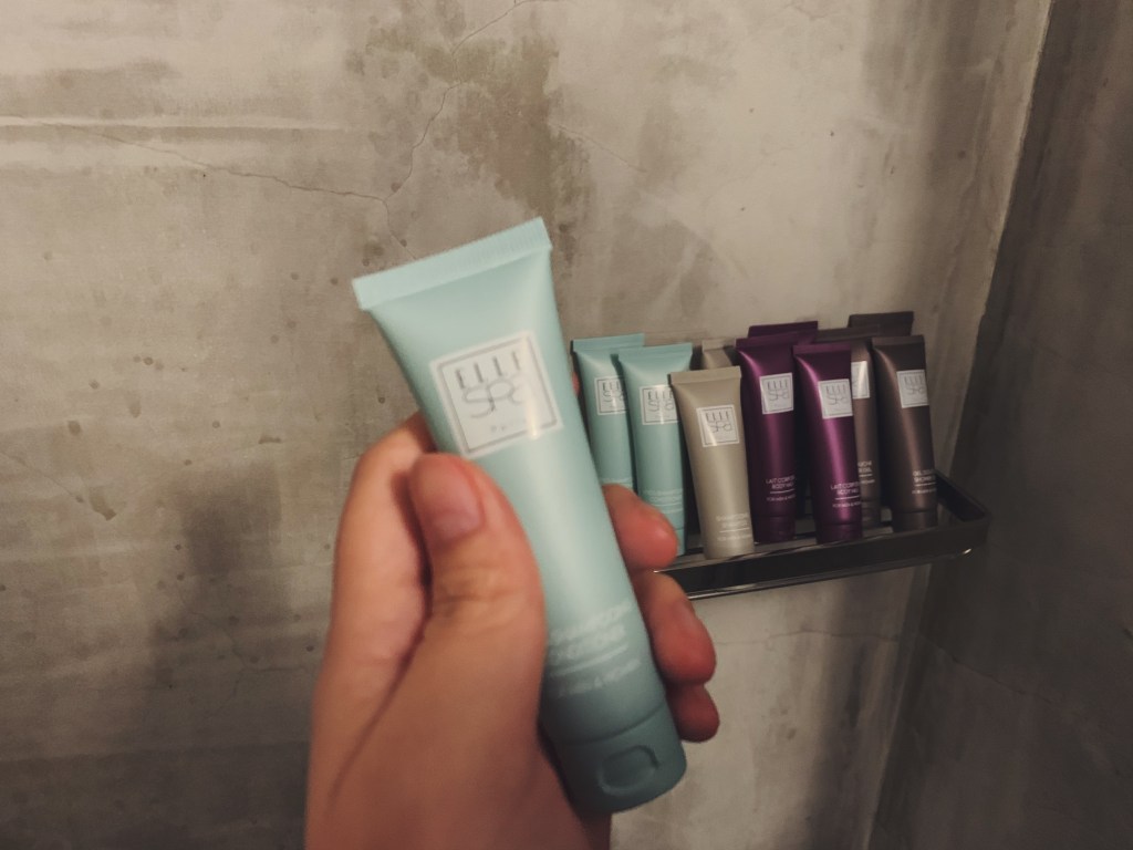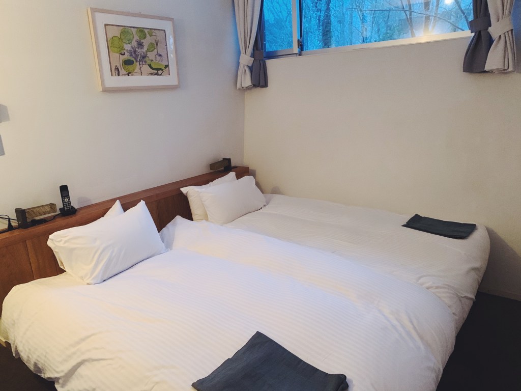 Lobby的正對面是咖啡廳,面對著小小的湖. 沿著木頭棧板走道,往上走到房間的建築,純白色的門,進入後是一個寬廣的沙發空間,旁邊的小吧檯上有沖煮咖啡的完整配備,沖煮壺,杯子,手搖磨豆機還有咖啡豆. 桌下有個冰箱內有各種飲料像是可樂,雪碧,啤酒和水等都無限量供應. 屋內的裝潢並沒有過度虛華,放置著一些簡約有設計感的裝飾品. 大面落地的玻璃帷幕,外面的樹林彷彿沒有隔閡的坐落在旁邊. 拉門打開的房間內有兩張大床,上面擺放著可以換穿去泡湯的衣服. 洗手間是清水泥的牆壁,被有整組的ELLE SPA系列的衛浴用品.