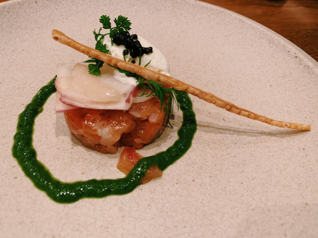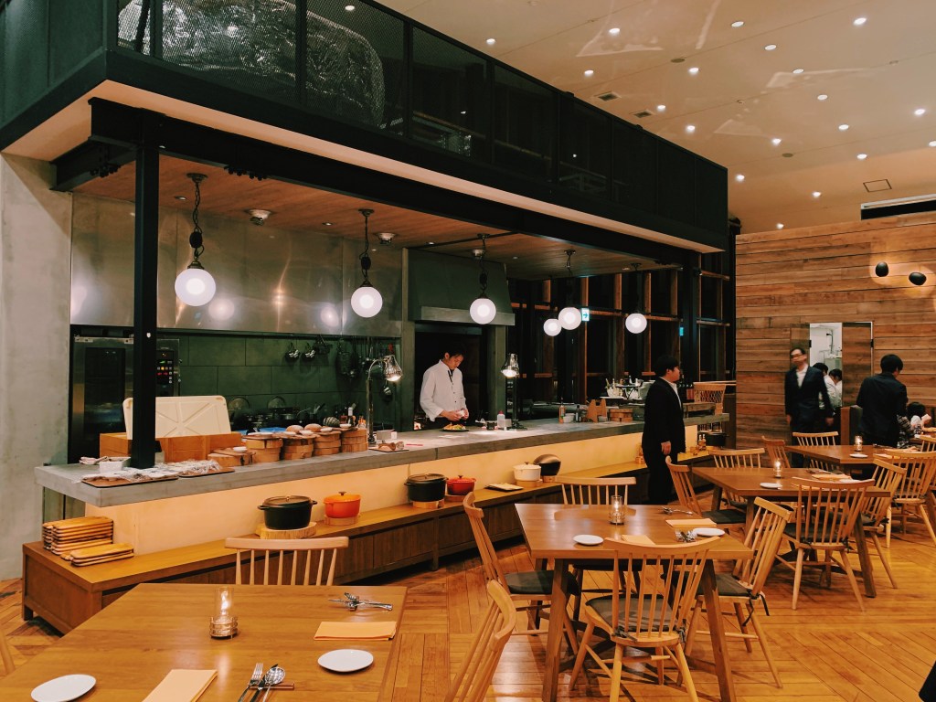 若有來住這裡我會大力推薦一定要加上他們的晚餐和早餐,真的很值得! 他們的餐廳叫WOODSIDE,就在Lobby那一棟內,餐點以法式創意料理為主軸,由來自知名銀座知名餐廳“L’ecrin Ginza”的主廚 – Inoue所料理, 這裡也提供非住客的人預約. 晚餐有分兩個時段,在check-in時他們就會跟你確認要什麼時候用餐. 晚上那棟餐廳更顯得非常明亮, 餐廳內開放式的廚房可以看到主廚親自料理的過程. 服務人員立即來帶位並提供給我們今日的menu,若有對某些食材過敏也可以向他們提出,他們會進行調整. 從前菜,麵包,湯品,主菜和甜點都是如此的美味,從擺盤到食材和調味在品嘗的時候都能感受到主廚的用心.