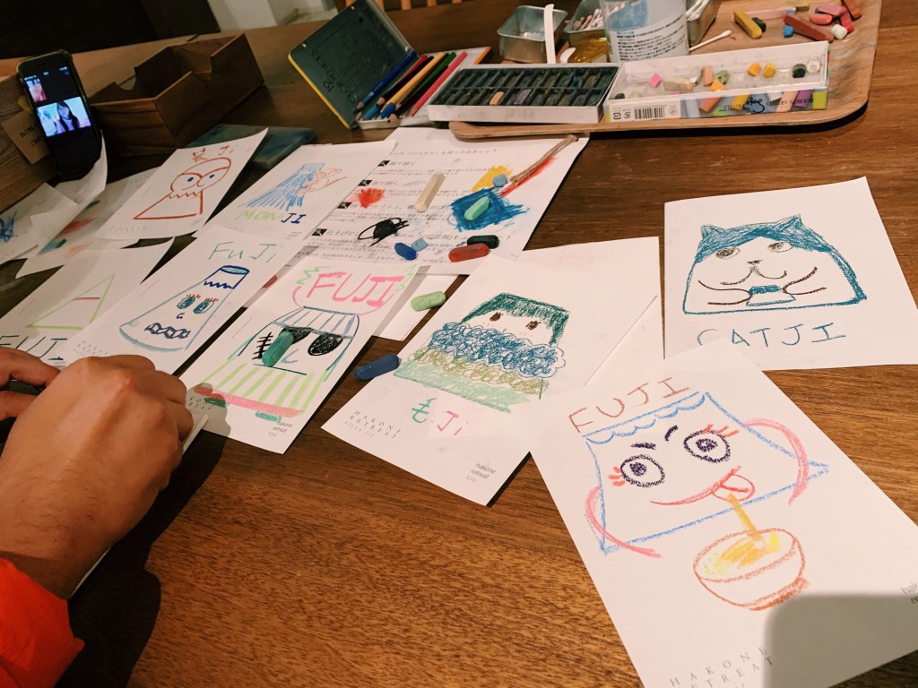 享用完令人滿足的一餐後,在房間稍作休息後就要來去使用他們的泡湯設施.泡湯那一棟在最後方,會走在木頭小徑上,周圍也是林蔭, 感覺很像是要走入森林內秘密的小木屋泡湯. 泡湯池有內湯和一個小巧的外湯,泡起來皮膚都有古溜的感覺.在泡湯後我們去Free Bird的空間,這裡很有溫馨感,有桌遊,望遠鏡,畫畫的筆讓大家可以玩或使用. 我們帶著餅乾和飲料來這裡悠閒的畫各種富士山的樣貌,起源是因為我們搭了富士山特快,上面各種搞笑的富士山. 換我們來發揮我們的想像力來個富士山插畫大賞.