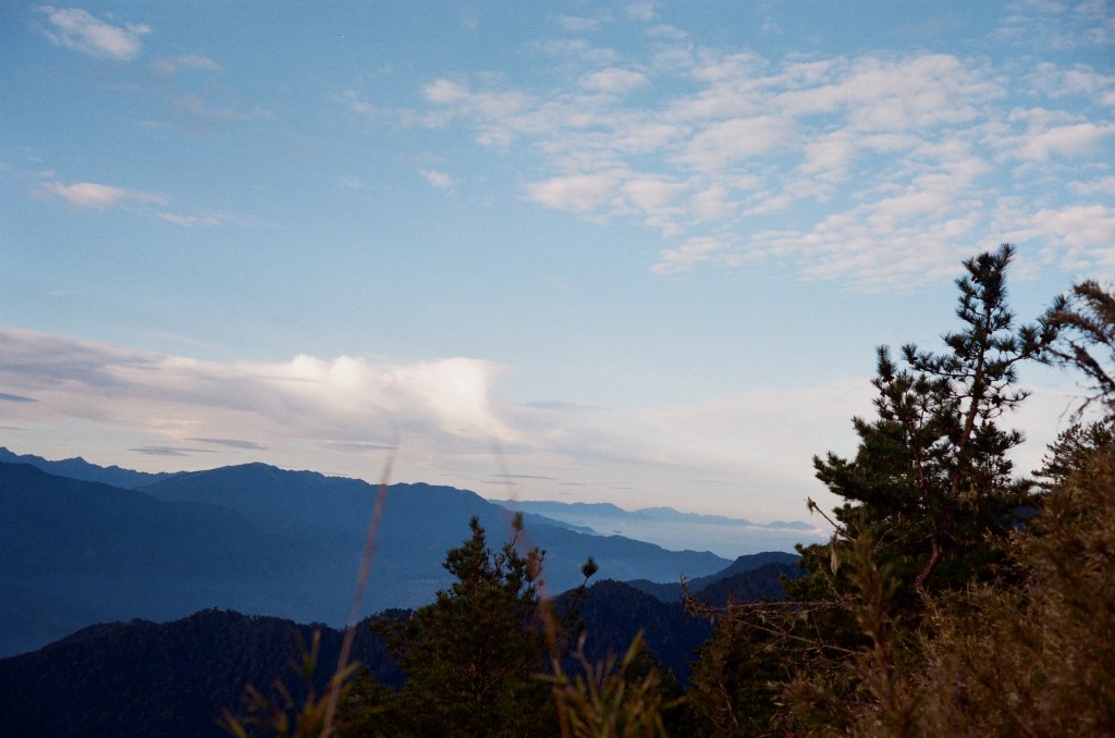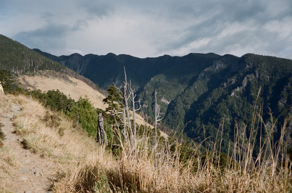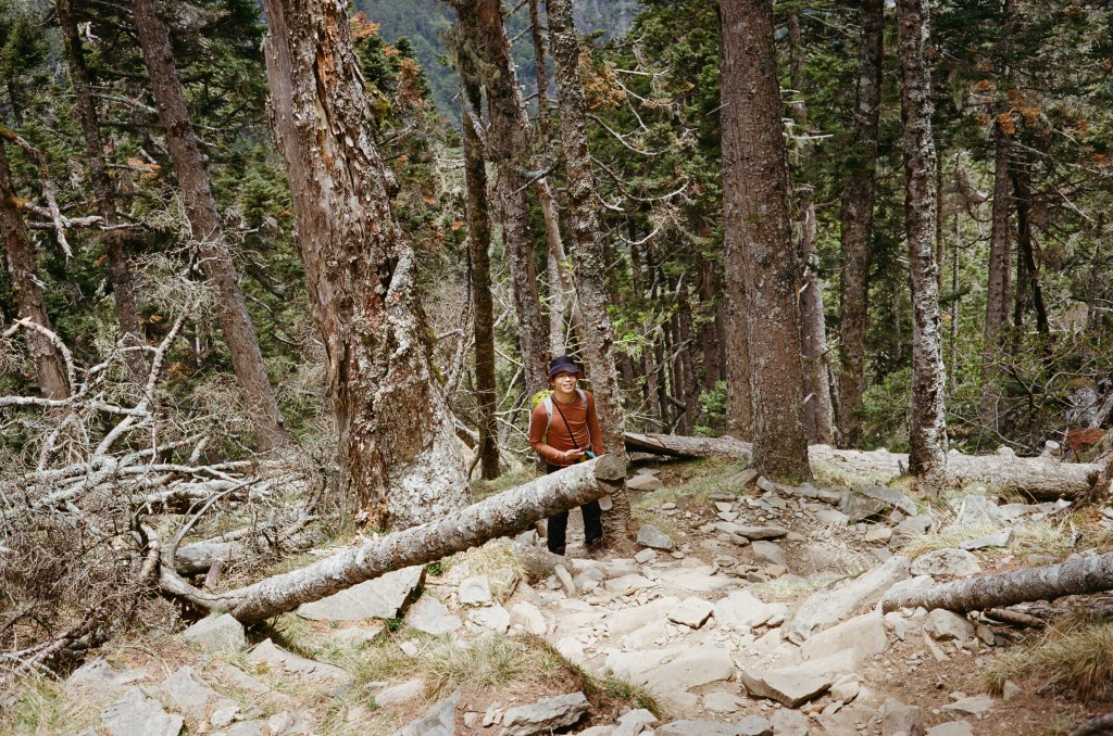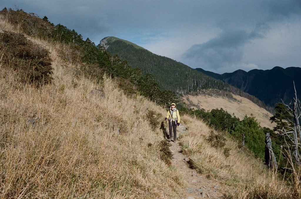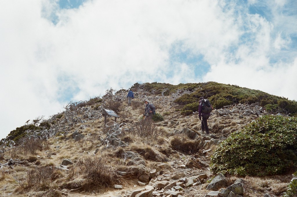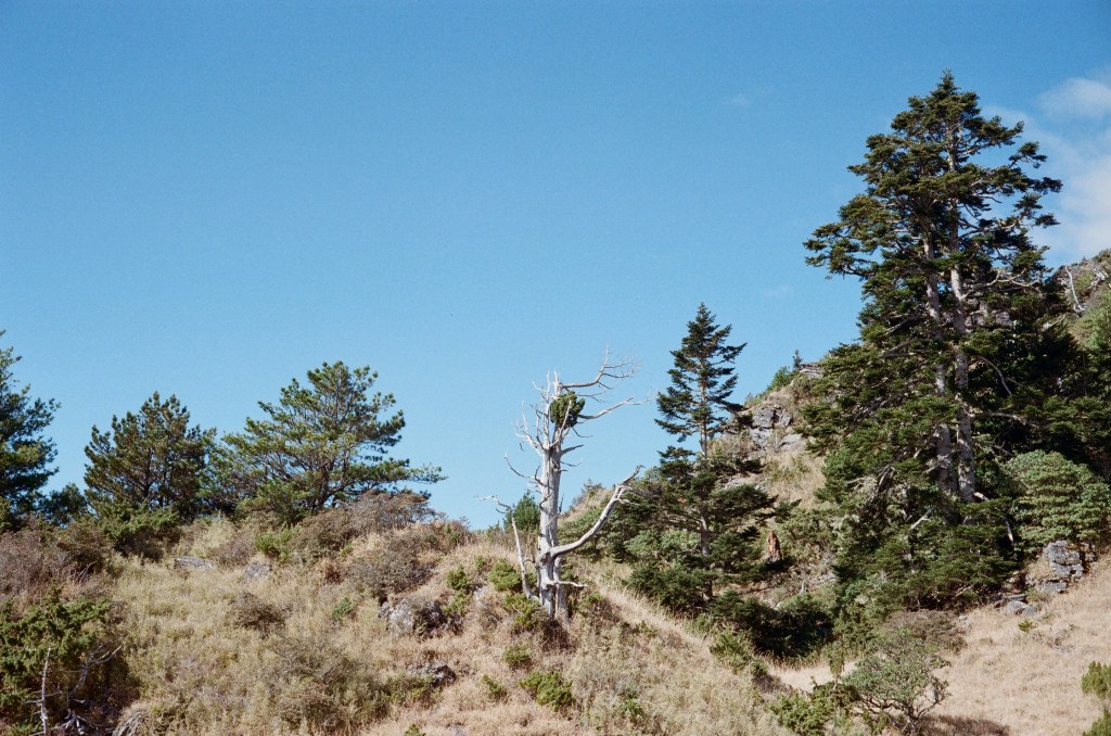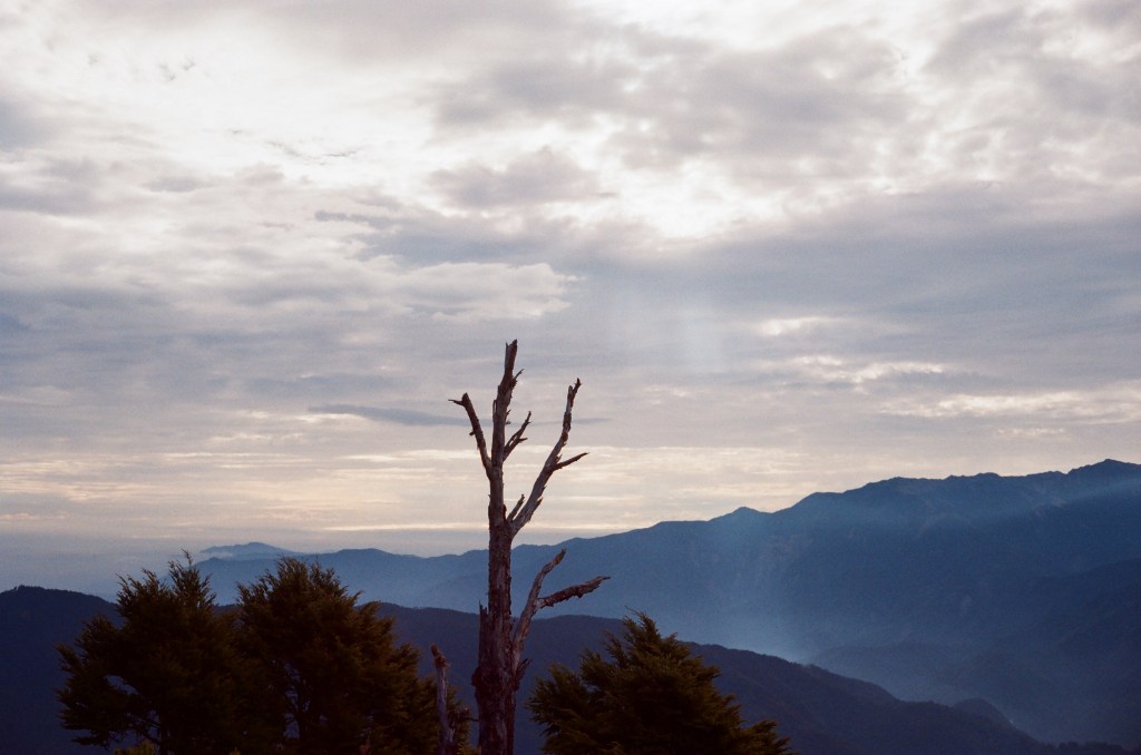 踏實地往上走到哭坡的頂端,這時候視野更是寬廣,可以用完全沒有遮蔽的角度放眼群山,一道光束剛好落在矗立在山坡上的枯木,在這一段讓我用底片機拍得非常過癮. 踩踏著穩固的石頭我們朝著雪山東峰前進,也是一路的上下坡,時不時的停下來欣賞美景.