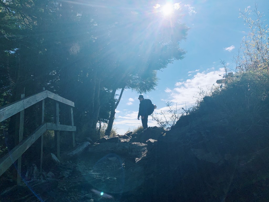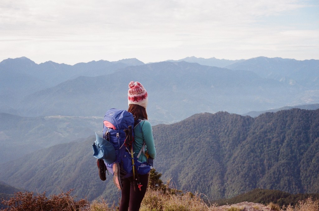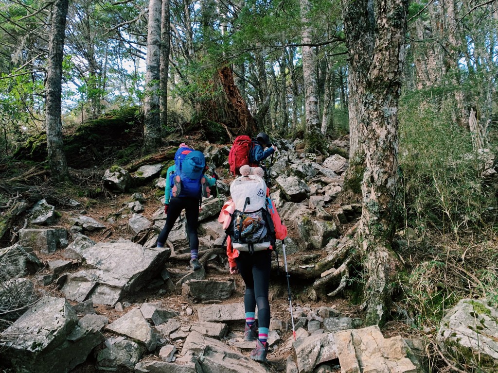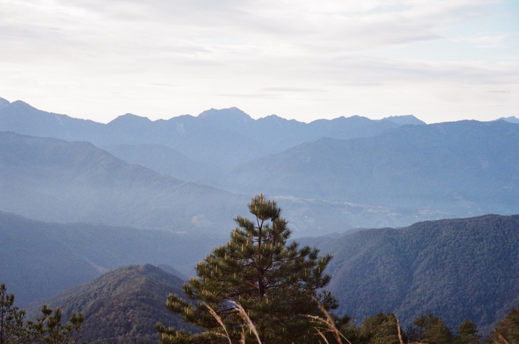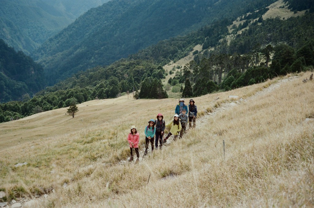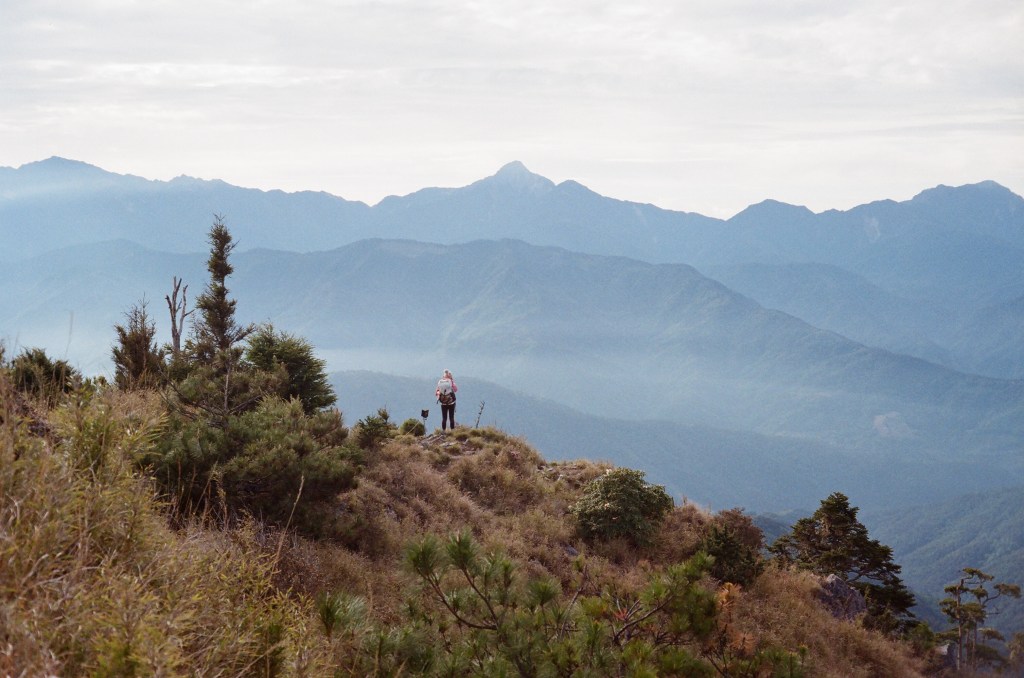 踏實地往上走到哭坡的頂端,這時候視野更是寬廣,可以用完全沒有遮蔽的角度放眼群山,一道光束剛好落在矗立在山坡上的枯木,在這一段讓我用底片機拍得非常過癮. 踩踏著穩固的石頭我們朝著雪山東峰前進,也是一路的上下坡,時不時的停下來欣賞美景.
