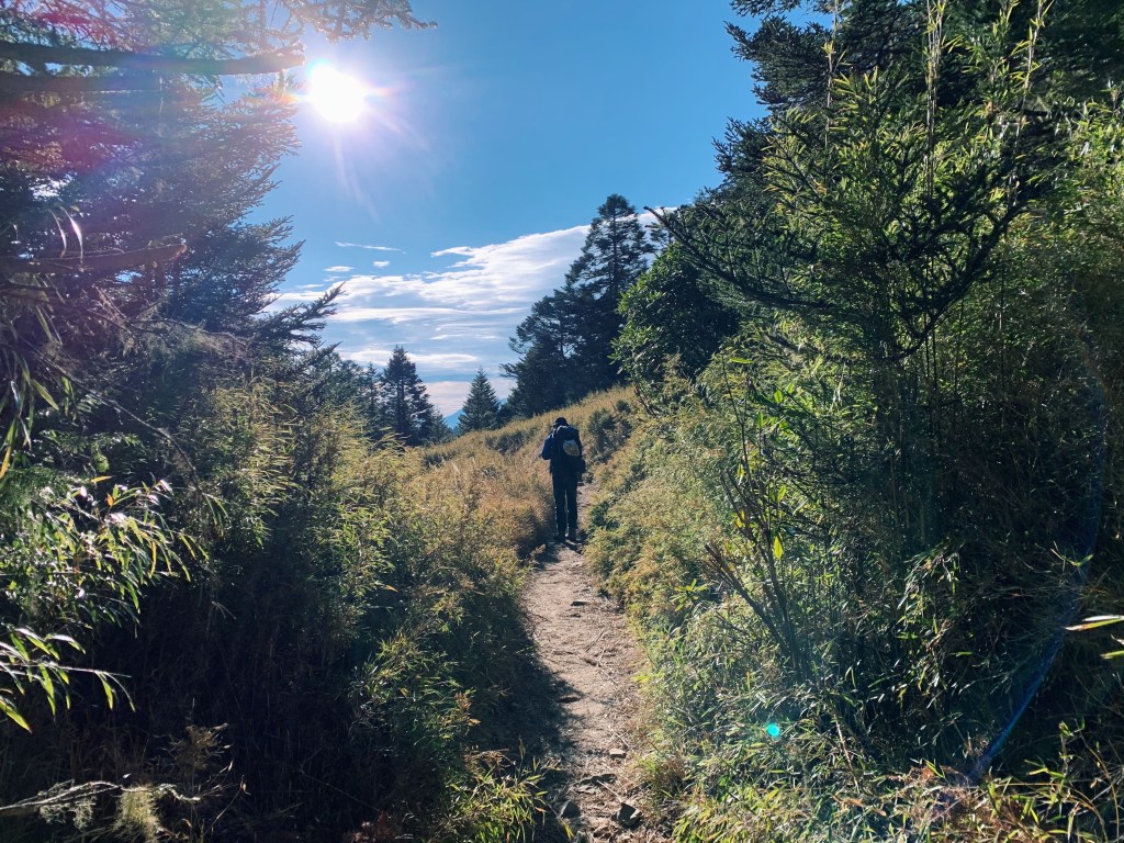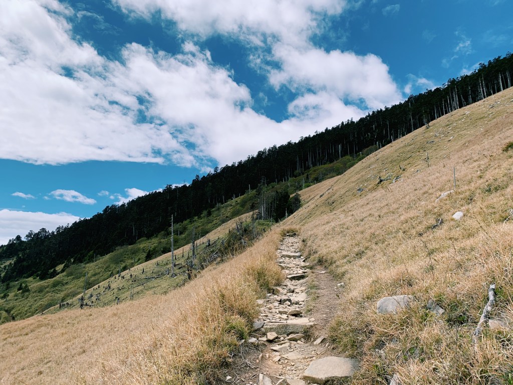從三六九山莊往上沿著草坡的路徑之字坡緩上,這一片白木林是1912年火災焚燒的台灣冷杉. 一片草原延伸往下深綠色的山谷,藍天白雲依舊. 接下來就要進入尋覓長鬃山羊的黑森林了!