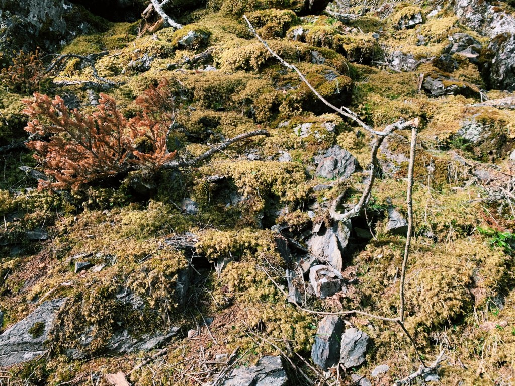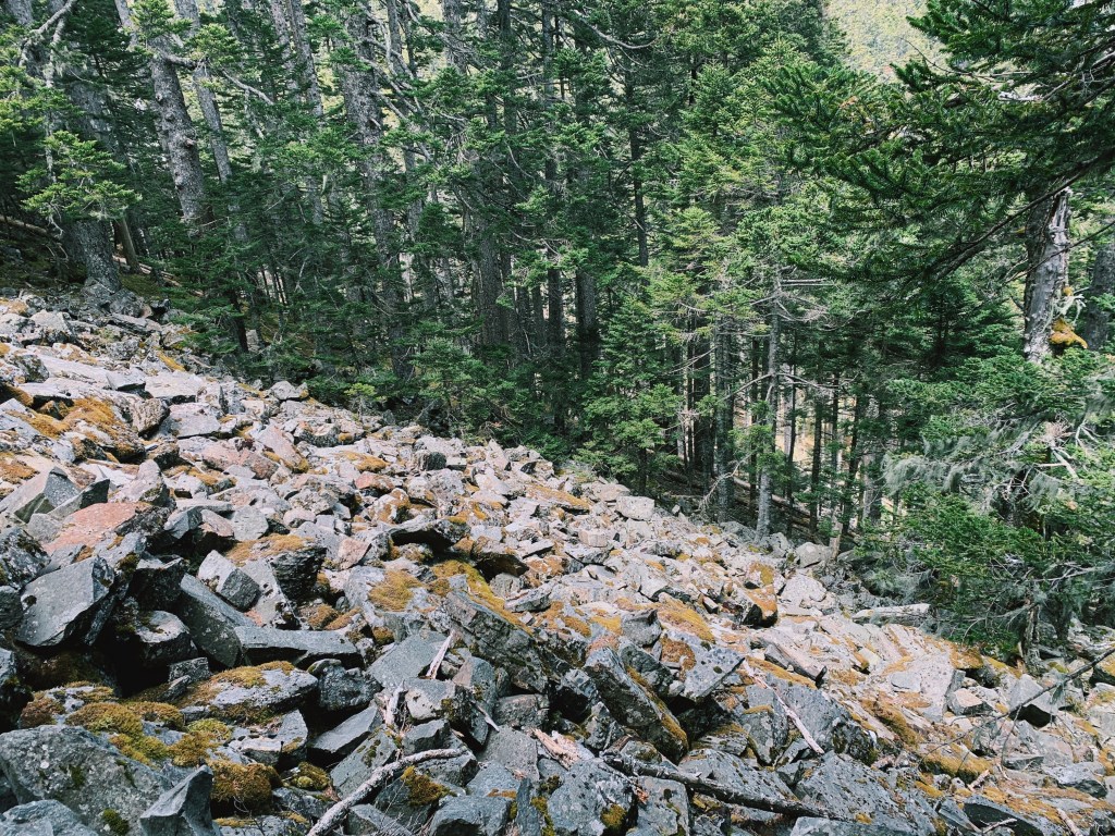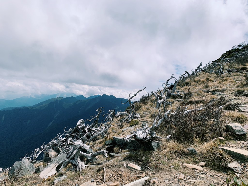 從雪山圈谷底部開始沿著碎石坡路徑陡上,隨著海拔上升,這段路真的是很喘,大概後段每走幾步就休息喘好幾下,累的時候不時停下來環顧周圍的山景. 接近雪山主峰的路段有整片的玉山圓柏枯幹,歷經大火讓這玉山圓柏成為永恆的標本般持續的盤踞在此,依然保有原本蒼勁的枝條,猶如高山的藝術品般美麗.