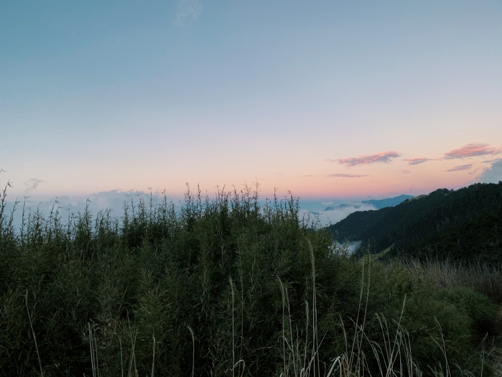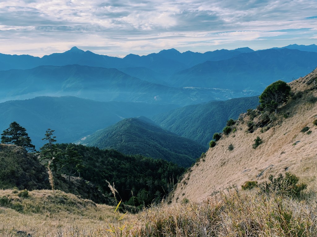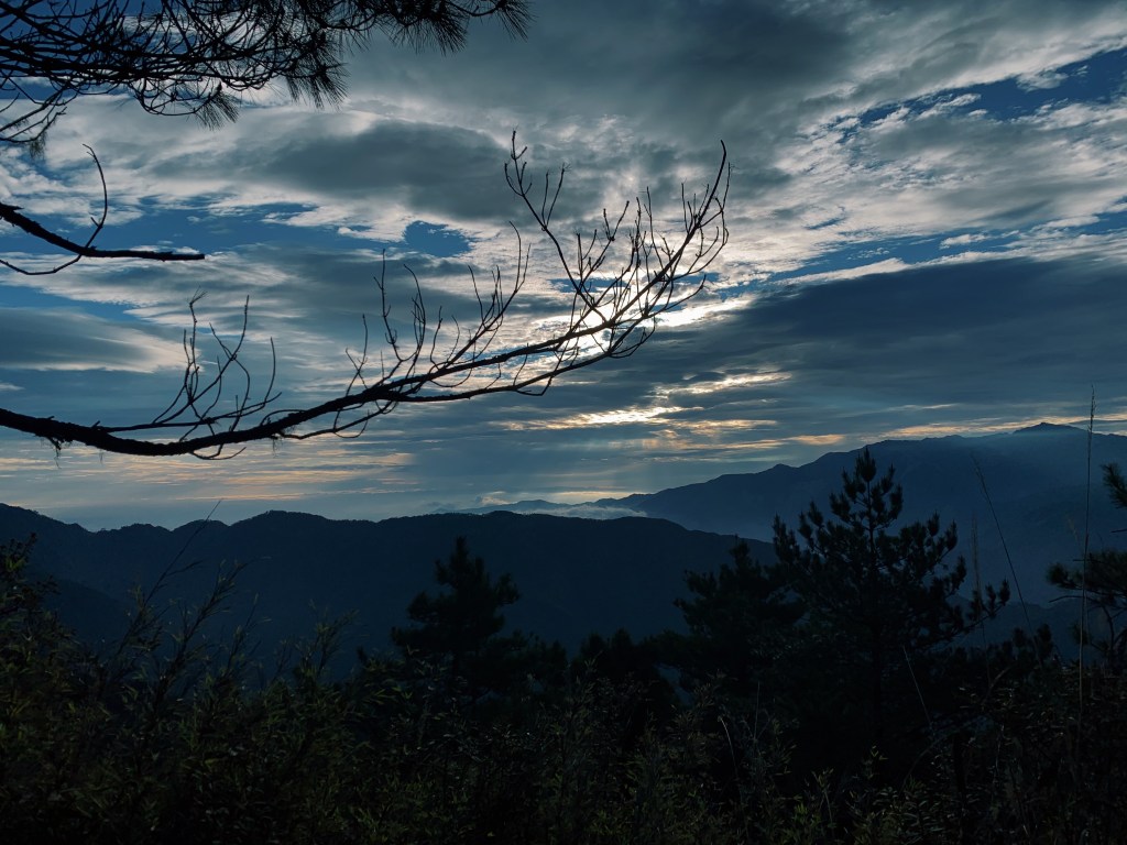 隨著太陽升起,天空的藍更為透亮,陽光照射在白雲上,顏色層層疊疊如此夢幻. 我們從山林中探出,溫暖的陽光盡情的撒在身上. 對面的山稜線條是如此的清晰,不時的停下來遠望這個美景. 天空中出現一大朵飛碟雲穿插在其中,我們努力地繼續向上走,這時天色已經完全亮起.