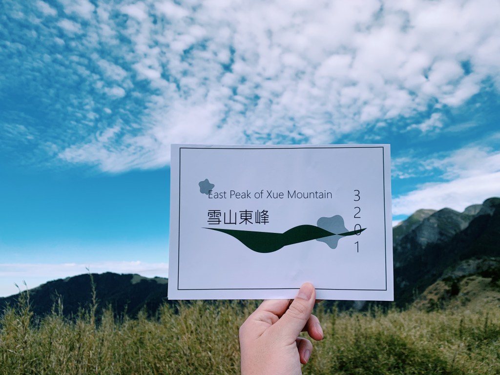 終於抵達雪山東峰下的叉路,只要走上翠綠色的草坡就可以登上雪山東峰啦! 雪山東峰,海拔3,201公尺,從這裡可以看到對面的武陵四秀的山頭 – 品田山,池有山,桃山和喀拉葉山.像是棉花糖的高積雲高掛在天空. 我看上面的牌子介紹說原本雪山東峰四周是茂密的森林,但因為歷經數次的森林大火,才轉變成現在的箭竹林草原的樣貌,如果之後的一兩百年沒有大火的話,雪山東峰有可能回到原本茂密的森林.