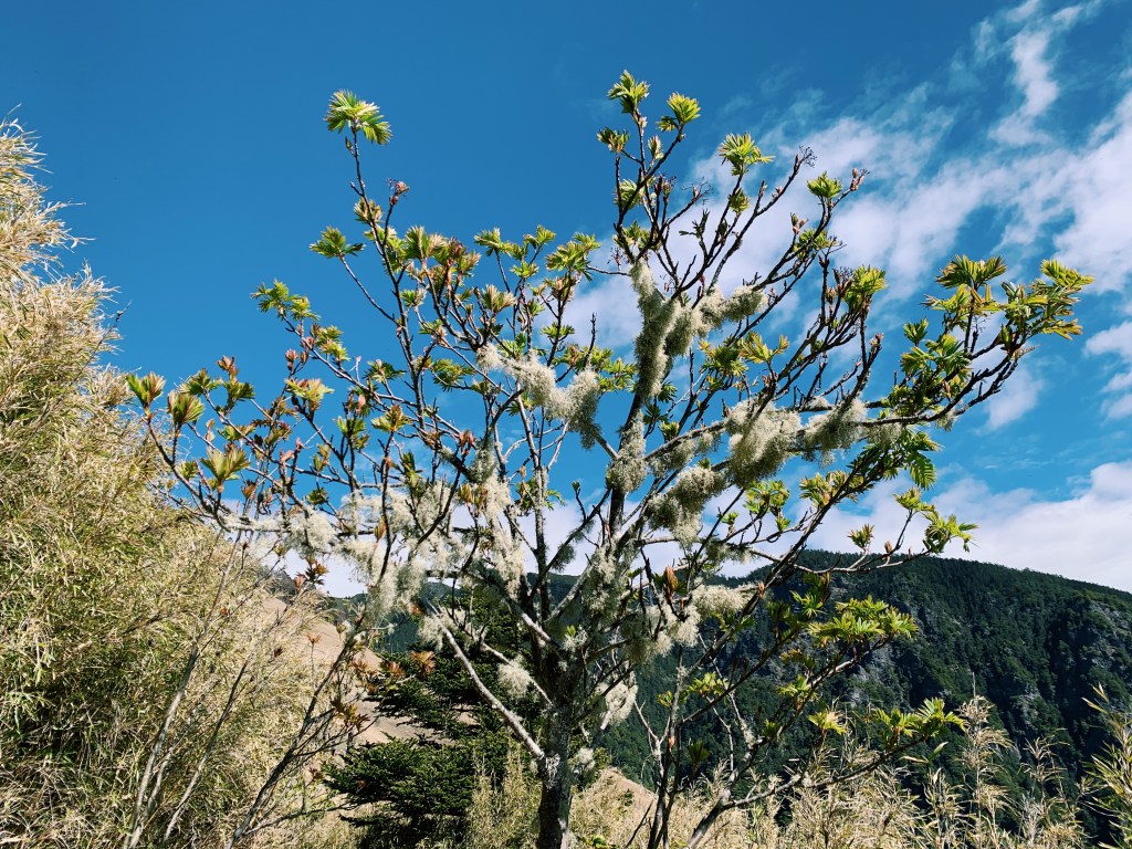 經過雪山東峰後,會看到一個直升機的停機坪,我們要朝著三六九山莊的方向前進. 天氣依舊非常的好,走到全身都熱起來. 整片的的黃綠色的箭竹草原上座落了屹立不搖的枯木,在路徑旁有個茂密的玉山圓柏,是台灣生長海拔最高的樹種,分布區域在海拔3200以上. 開闊的路徑偶爾又進入樹林之中穿梭,看到一棵樹上披著一株株垂墜的松蘿.
