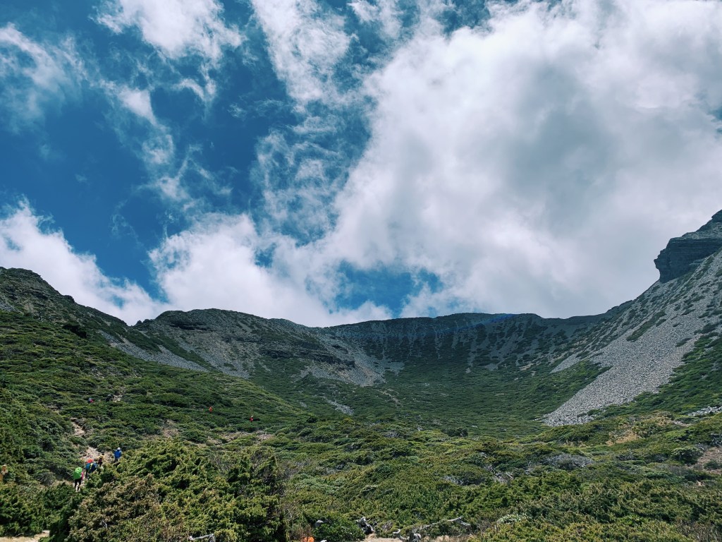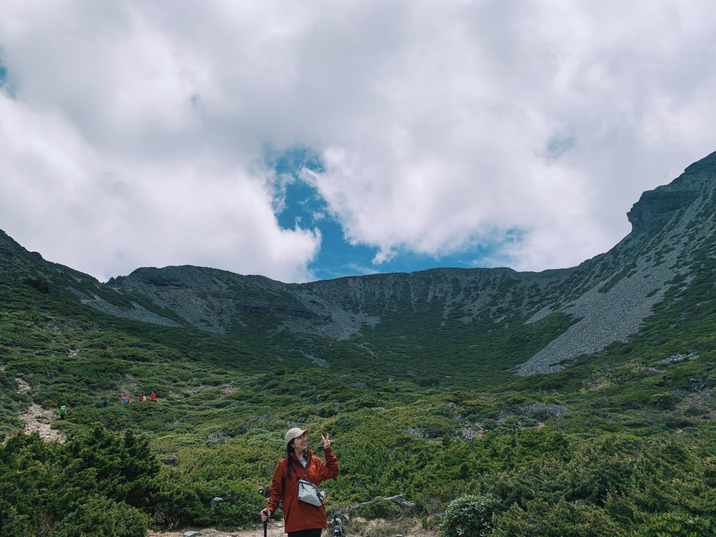 在快走出黑森林之前,煮了咖啡休息一下. 在一路辛苦向上後終於出黑森林,迎面而來的是壯闊的雪山圈谷,巨大的U型面像是華麗的舞台般讓人雀躍,飄動的白雲在後面隨之舞動. 這裡地形是曾經有冰河的證明,但對於這個論點也經過多年的爭論. 最早是由鹿野忠雄在1932年在〈臺灣高山地帶地形學之二三觀察〉報告所提出,但因為台灣緯度低溫度高所以不被認可.直到1990年代有學者提出更多證據證明才被採信. 被這個壯觀圈谷環繞著,無法自拔的在心裡感到震撼.