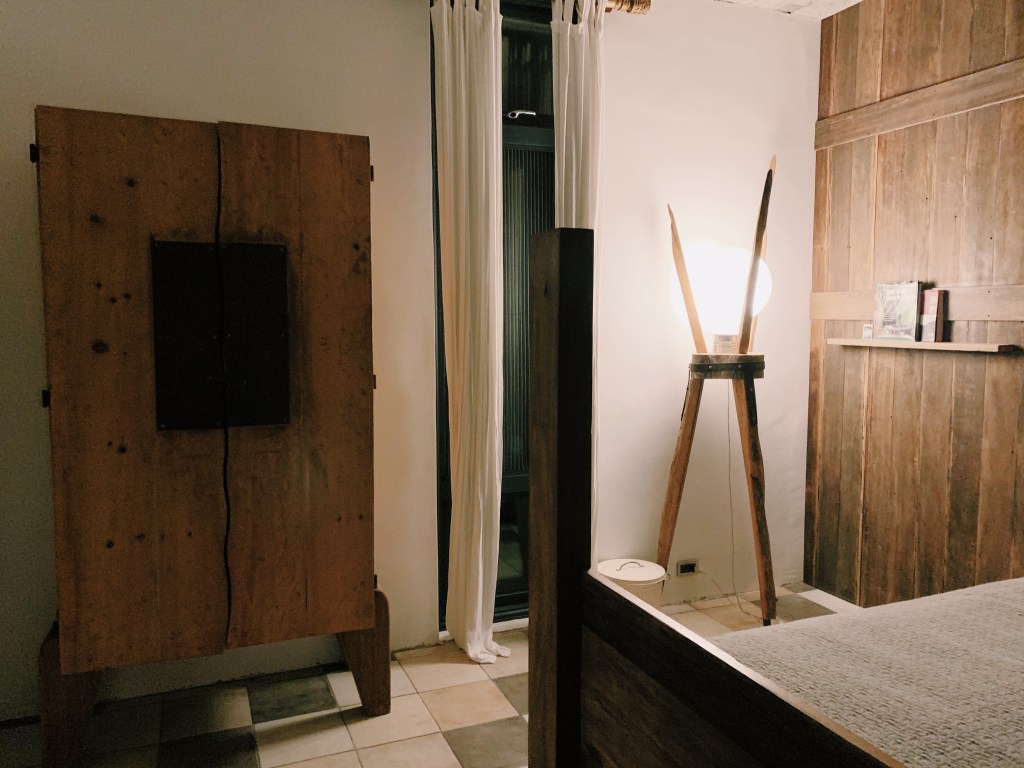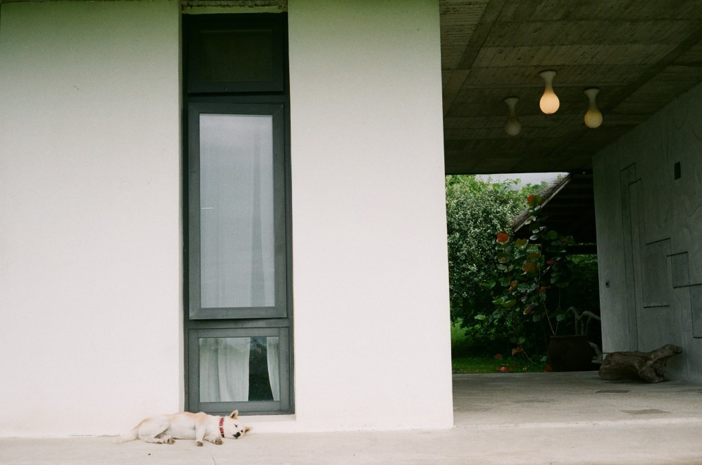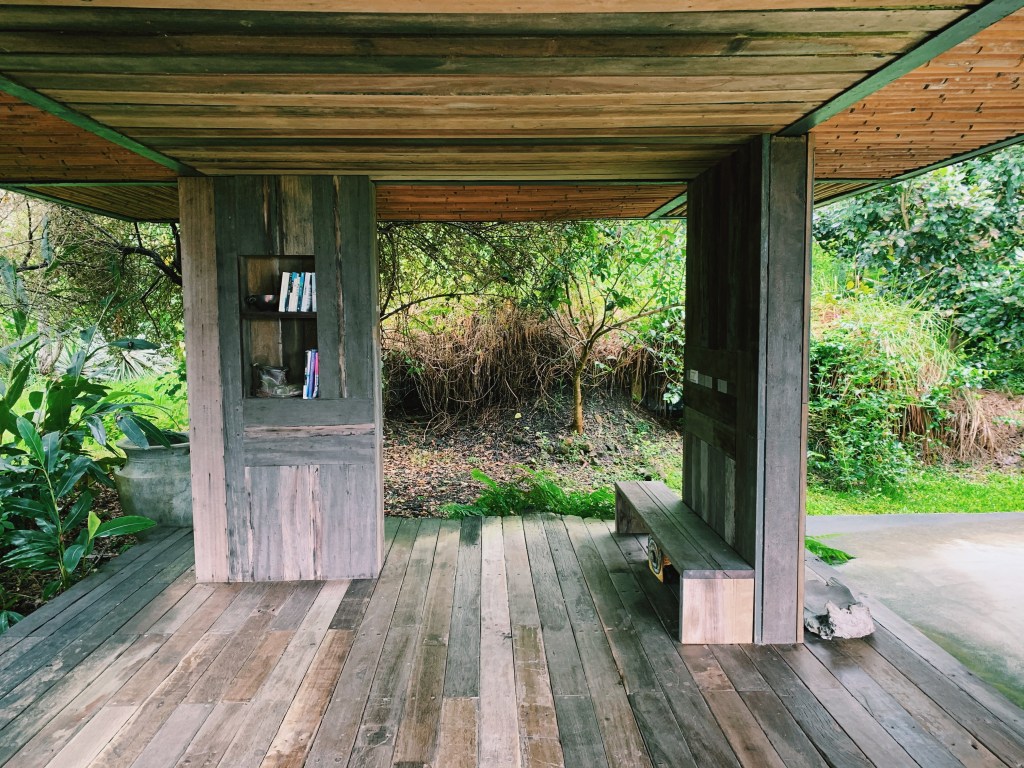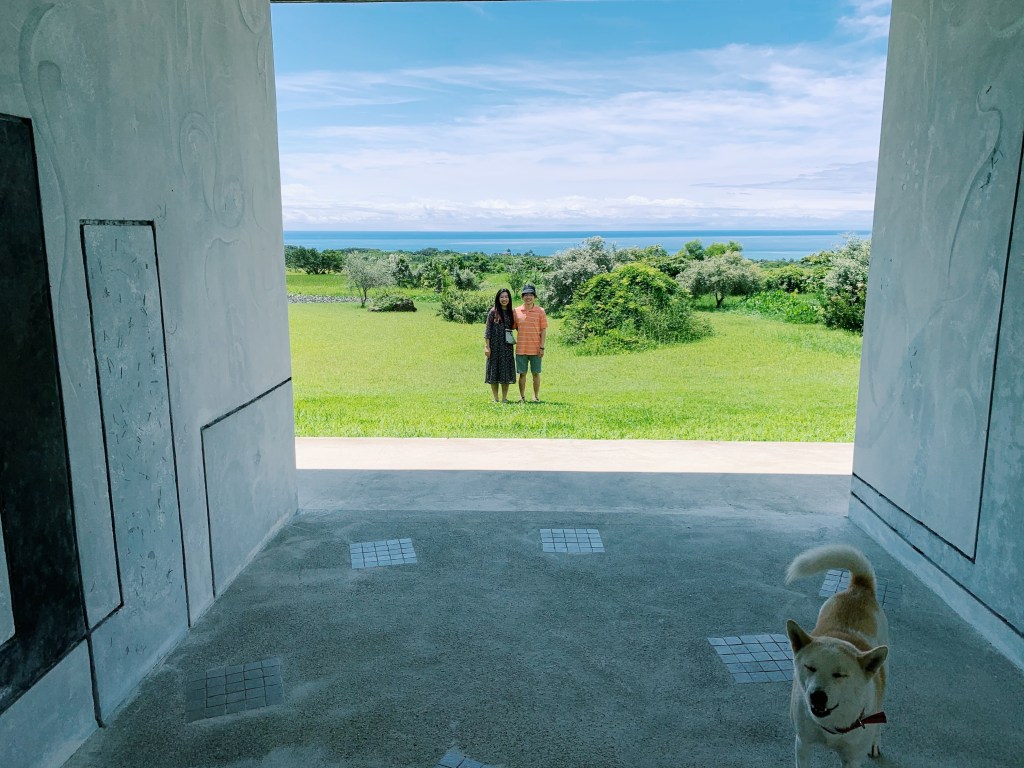 民宿的主人阿鎮和阿昆原本是在台北從事紀錄片導演的工作,來到這裡被這塊土地所吸引而移居於此. 這裡只有一間客房,所以每天只接待一組客人,所以在這裡可以不受打擾的享受整個空間. 來到這裡都會讓人放慢腳步,房間外有一個木頭搭成的「聽風亭」,架上有放書,平台上也放著靠枕. 我們坐在這裡放空吹著風,即便外面太陽很大坐在涼涼的木頭真的很舒服. 整個房子是簡單的白色正方建築,樸實的外觀與斑駁的木頭搭配很有味道. 一大朵的白雲襯托在民宿房子後方,從迴廊往草皮方向看,美的像一幅畫一般很不真實. 讓人無法不愛這個地方,也帶給我們記憶深刻的住宿體驗.