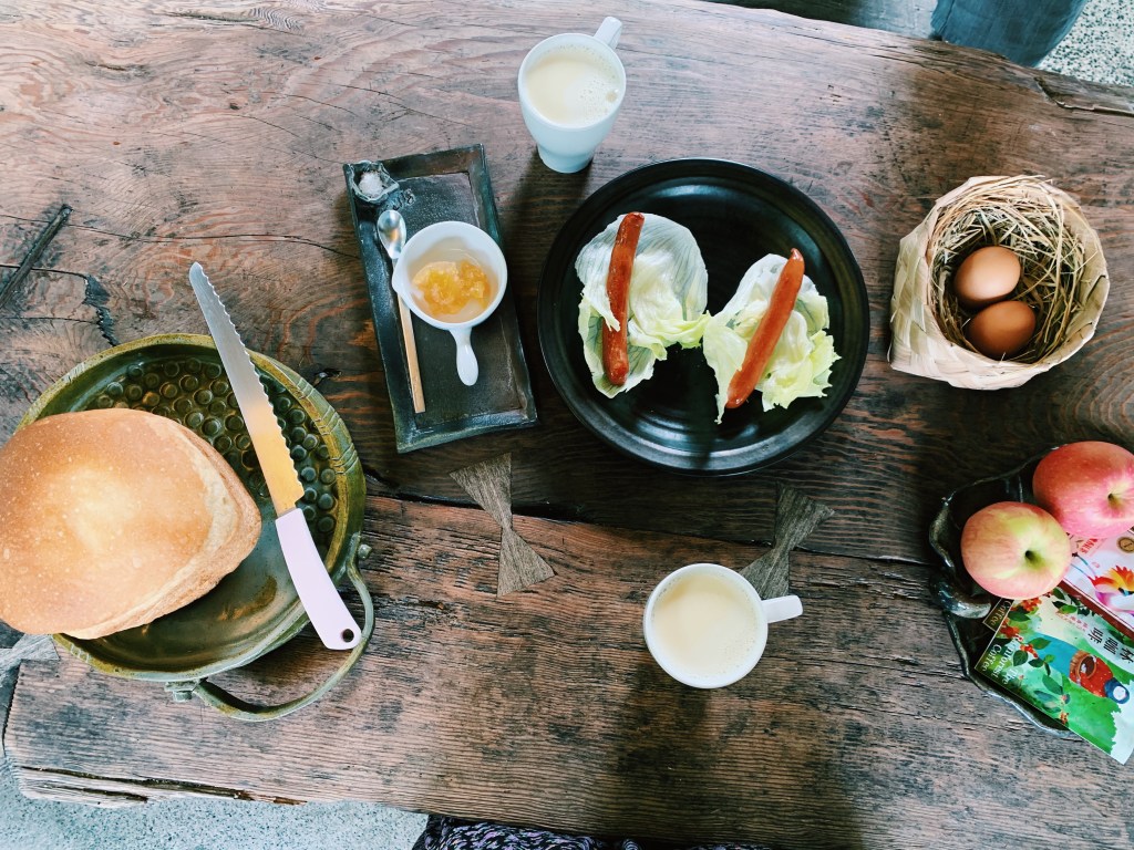 早上起來本來天空鋪滿了灰白色的雲,天色還很黯淡. 不過在吃完早餐之後,瞬間撥雲見日般,明亮的藍天和白雲,湛藍的海平面跟天空連在一起,太陽將房子前方綠油油的草皮照的如此亮眼. 由於我們正逢梅雨季節,在台東的前兩天都是陰天,結果在長濱的時候可以讓我有如此完美的天氣真的很幸運! 連民宿主人都說今天真的是這幾天難得的好天氣呀. 看著明朗的天空,心情整個大好! 民宿準備的早餐超級豐富,有一整顆自製吐司配上也是他們自己做的柚子醬,水煮蛋,生菜夾德國香腸,蘋果. 還有提供茶包和咖啡掛耳包給我們沖. 他們的狗狗布丁和貓咪悠哉地躺在陰涼處,看他們這樣好讓人羨慕.