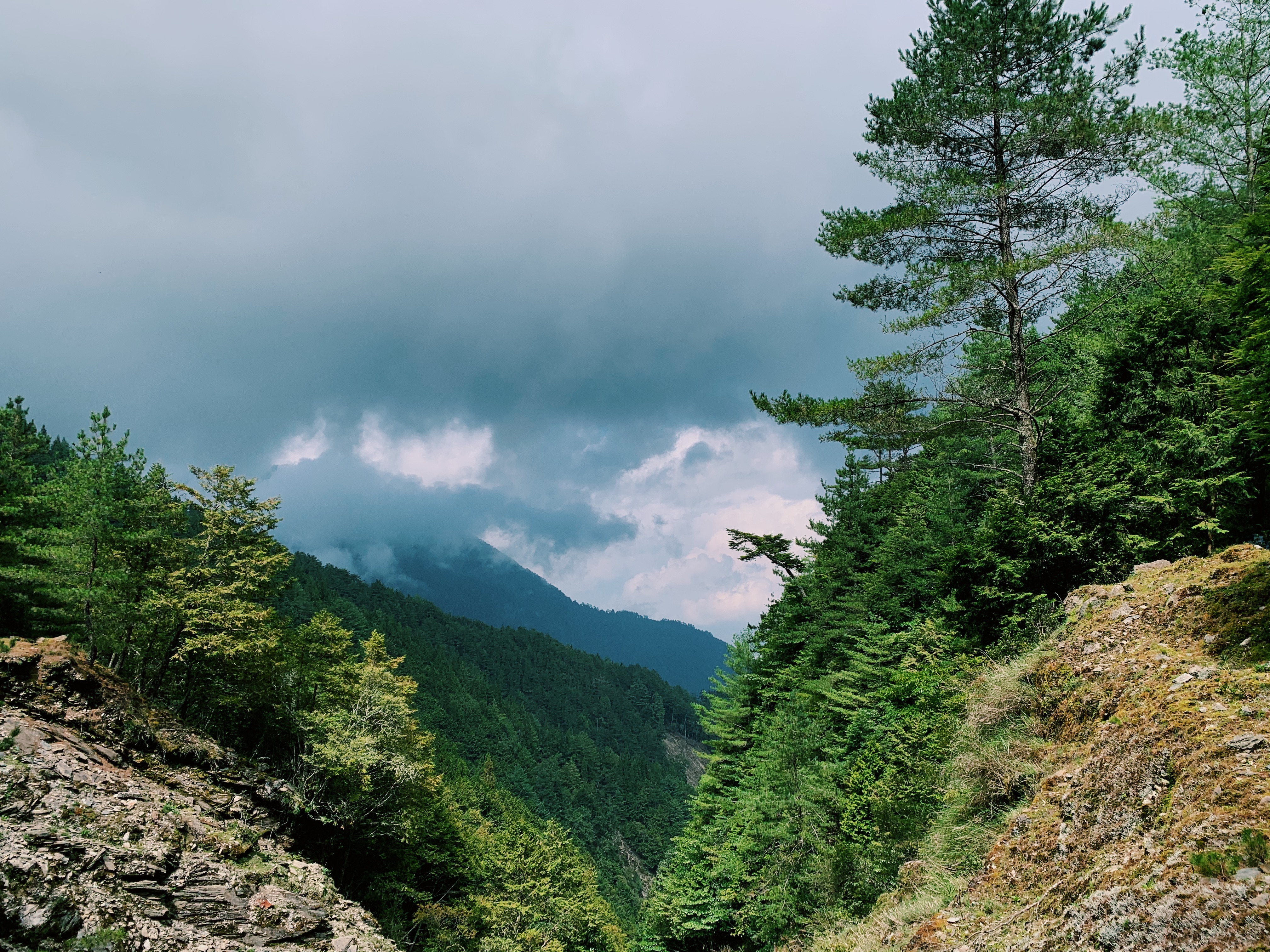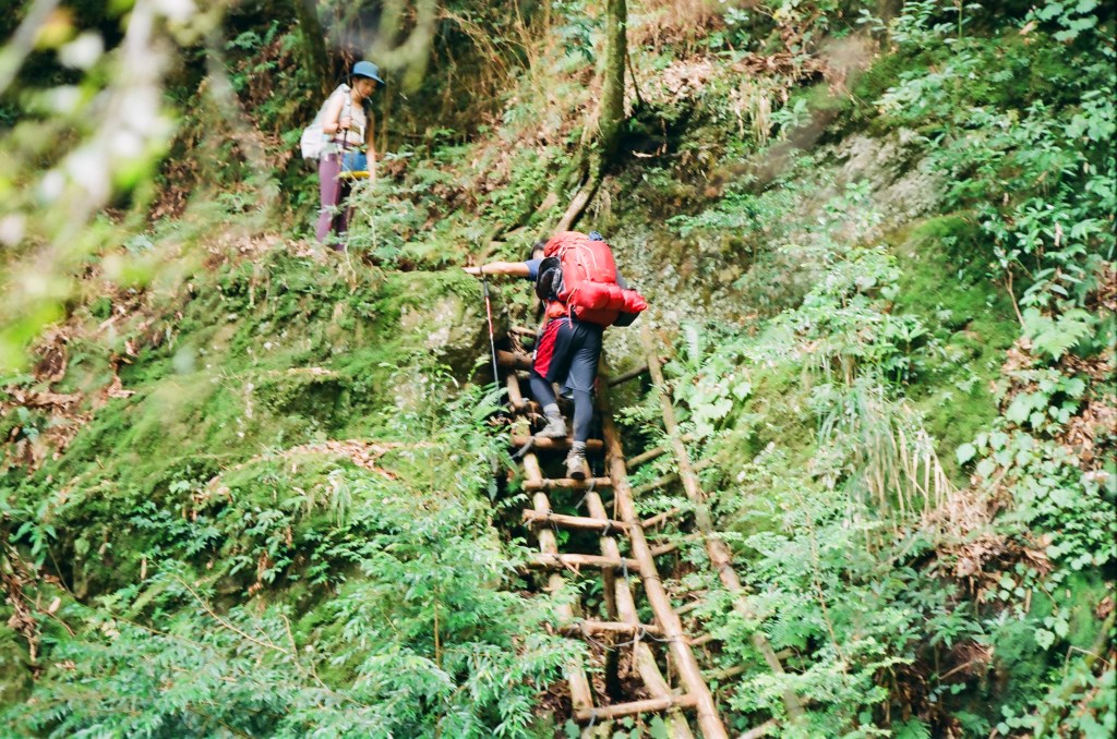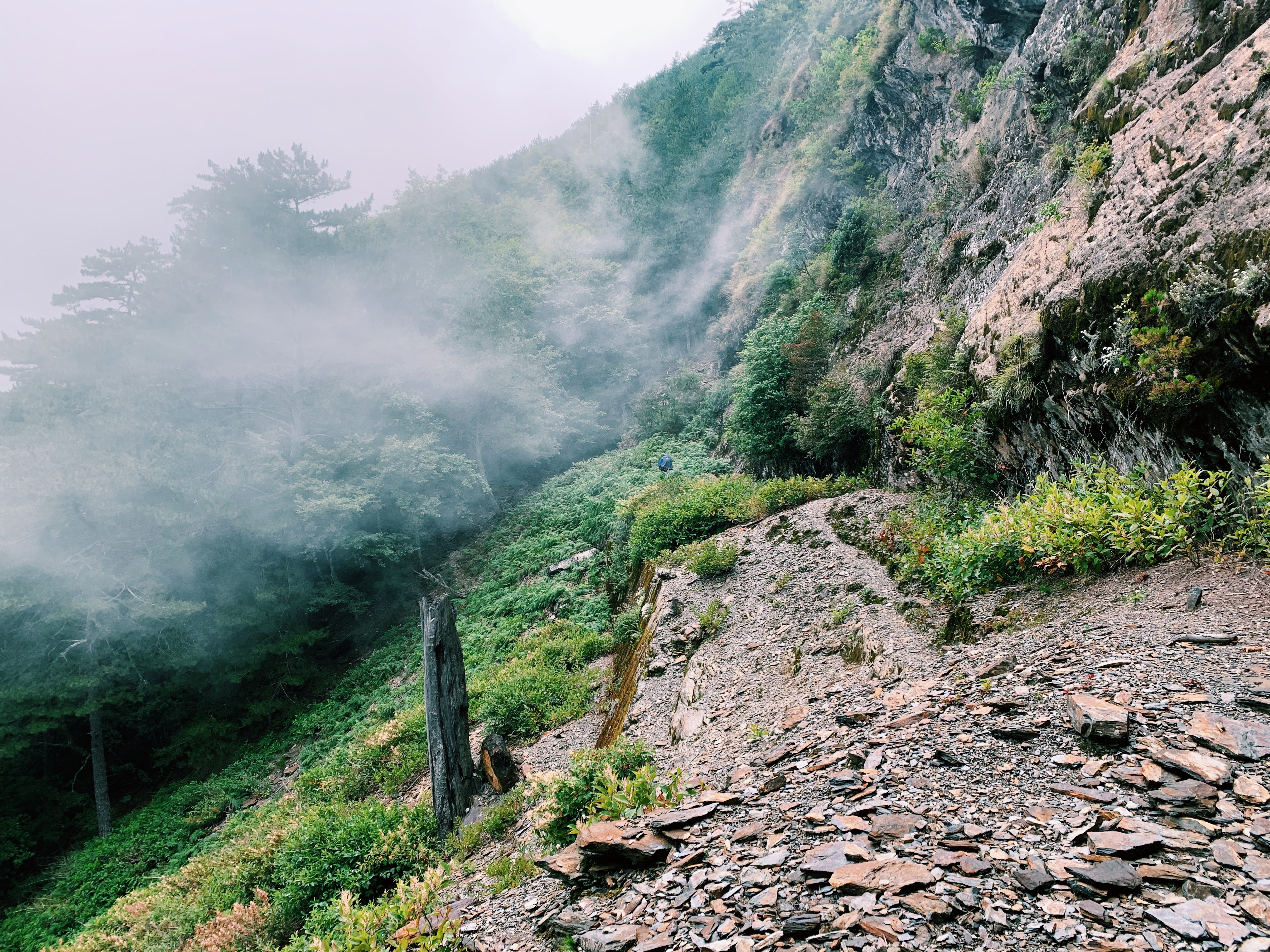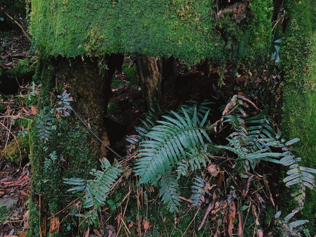 上到類林道後地勢趨於平坦,蔥鬱的樹林依舊讓我驚艷連連,雖然拍照可以記錄,但那個綠色的層次還是要親眼所見才能體會那個美. 漸漸的彷彿像是走到路的終點,山壁崩塌呈現了一個凹陷,對面的樹木成排的緊抓著土地,這個崩壁的路寬很大,往下沿著山壁穿越草叢即可抵達對面. 走在覆蓋著草綠色的地衣上,像是踩踏在柔軟的毛地毯上,時而踩著石頭往上攀爬. 來到一個落差較大的山壁,倚著用樹幹製成的梯子,不知道是誰製作的,真心感謝他們.