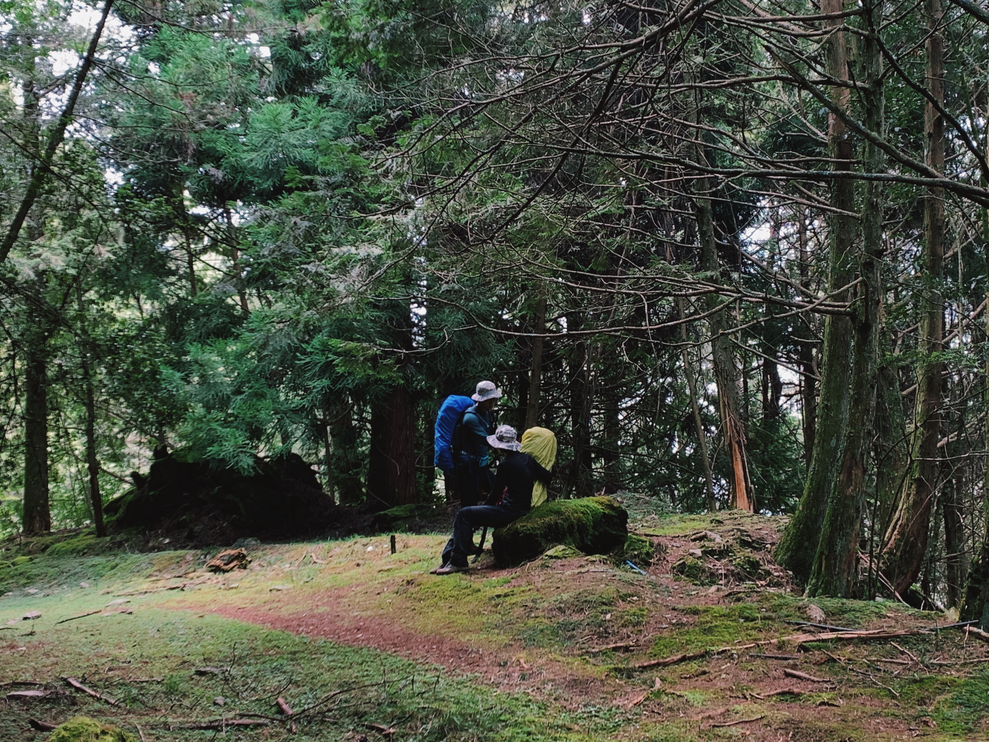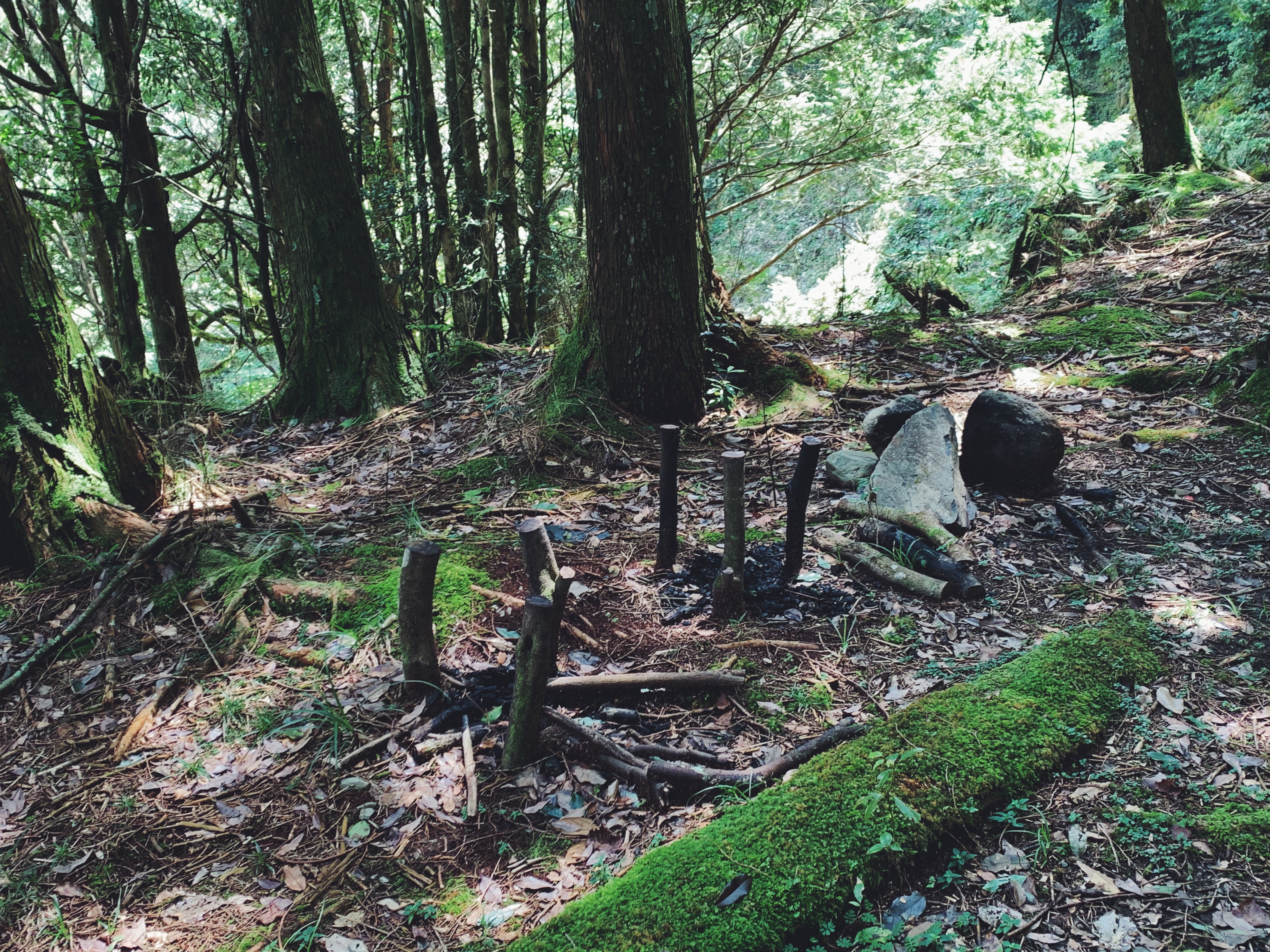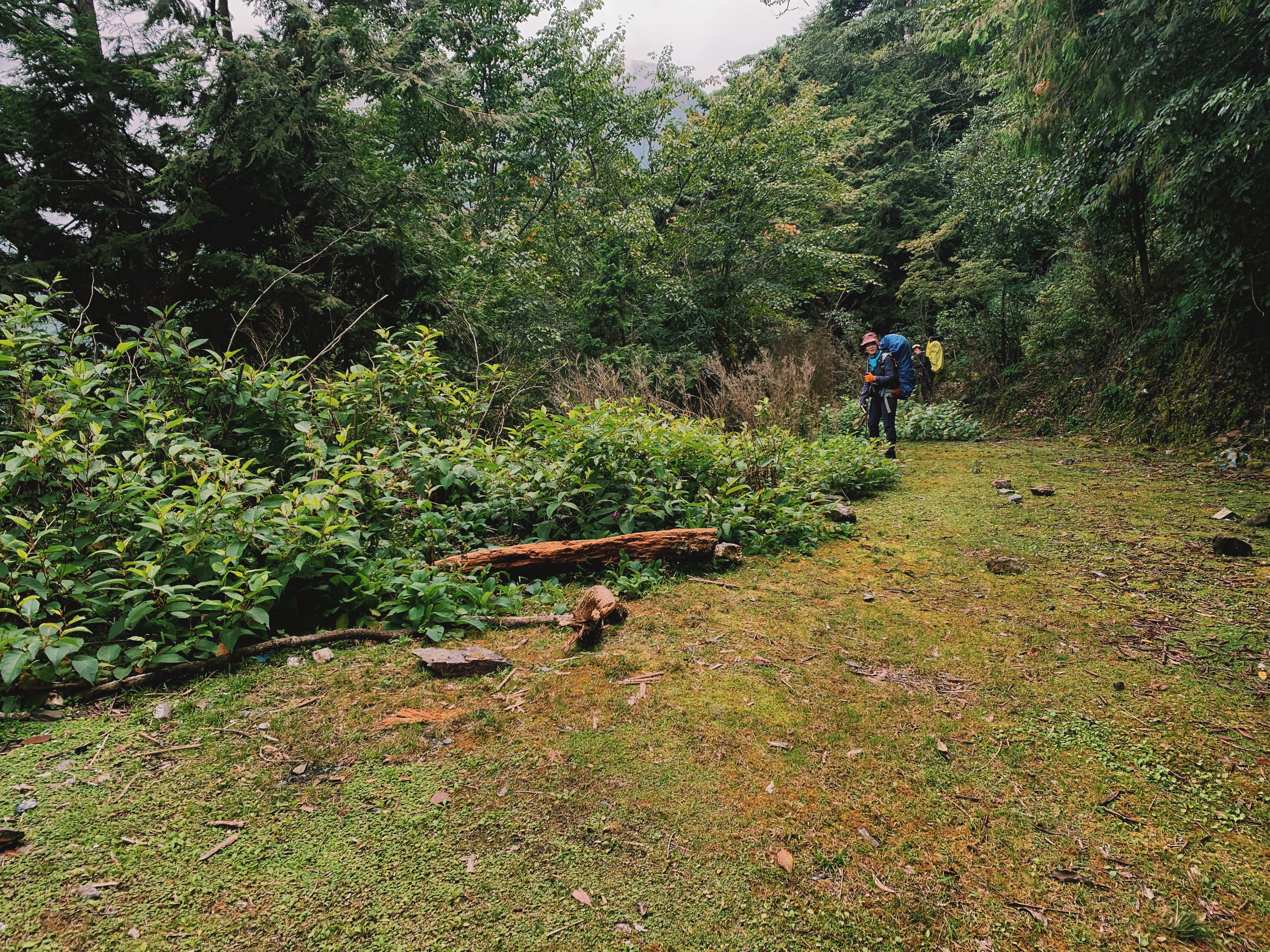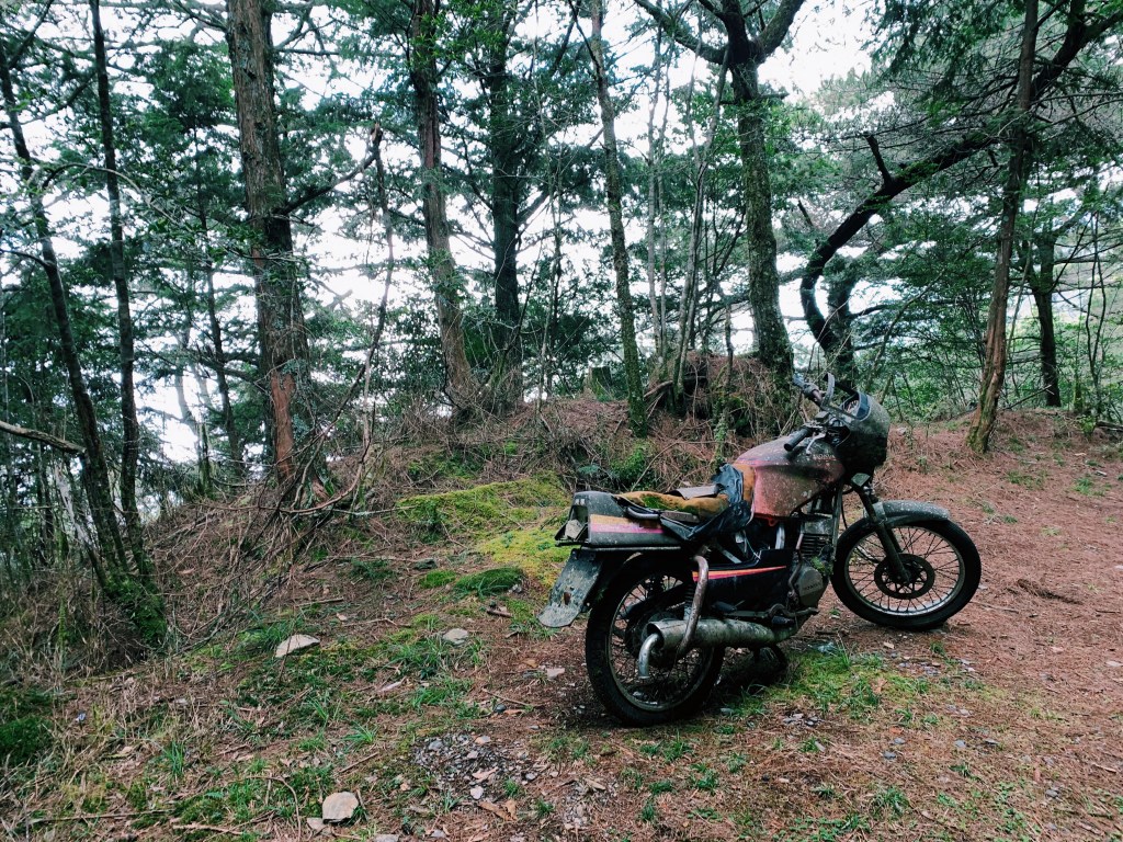 在這個完美的地方怎麼可以不享受一下,我們決定在此好好的吃個午餐. 剛好又有天然的樹幹當桌子還有石頭椅子,在這裡真的好舒服,如果可以在這睡午覺真的是很奢侈. 在這裡大休息一番後依依不捨的離開,面向停機坪往右穿越整片的毛地黃後繼續往上. 看到一小片綠衣上點綴著藍色小花好浪漫, 不知為何林道上總是會有廢棄的復古舊機車,一台Honda的擋車就這樣矗立在此成為登山客的路線指標之一. 眼前出現一個廢棄建築,周圍散落著遺留的垃圾.