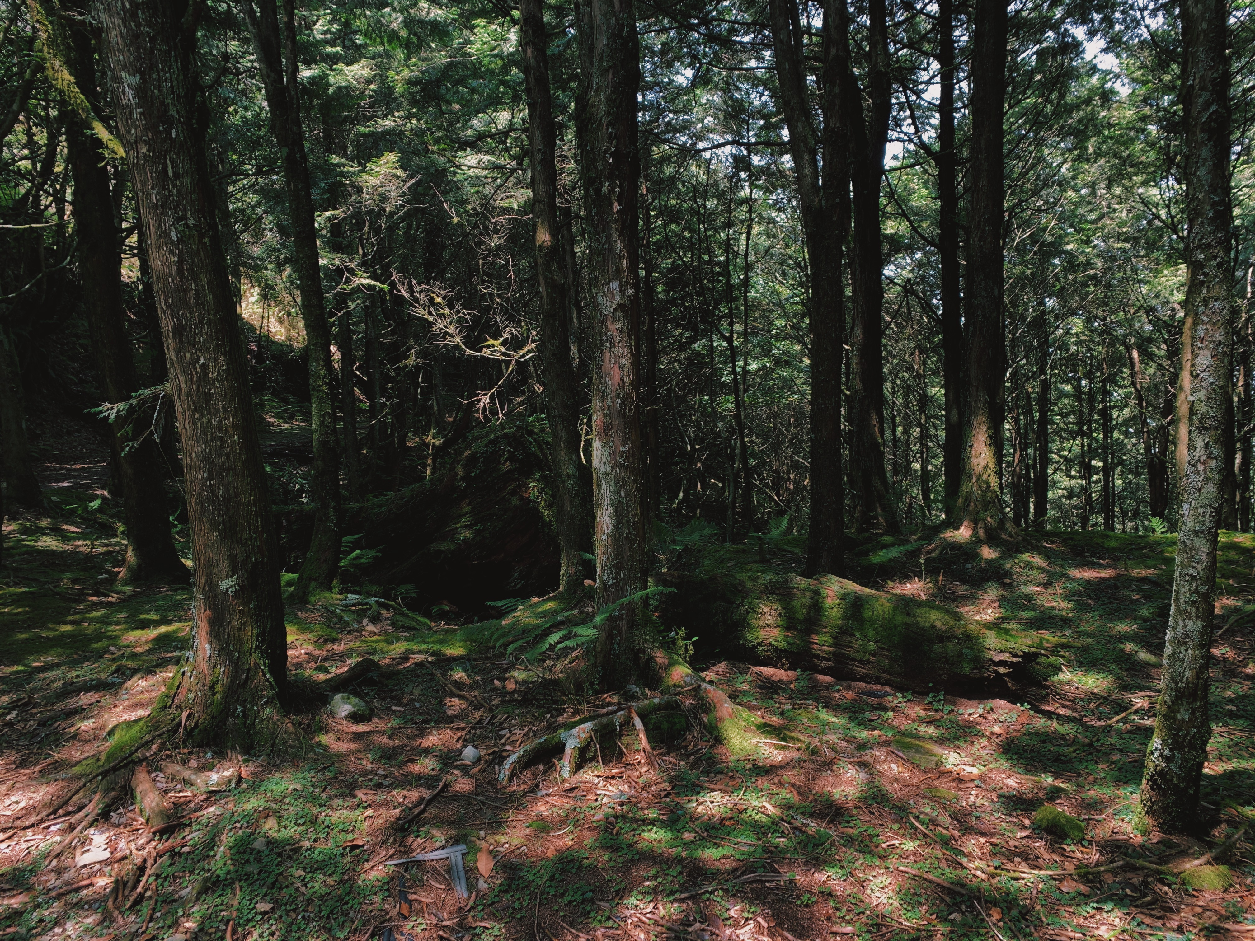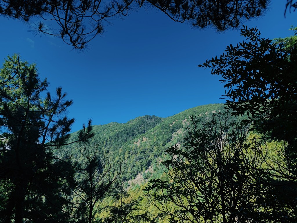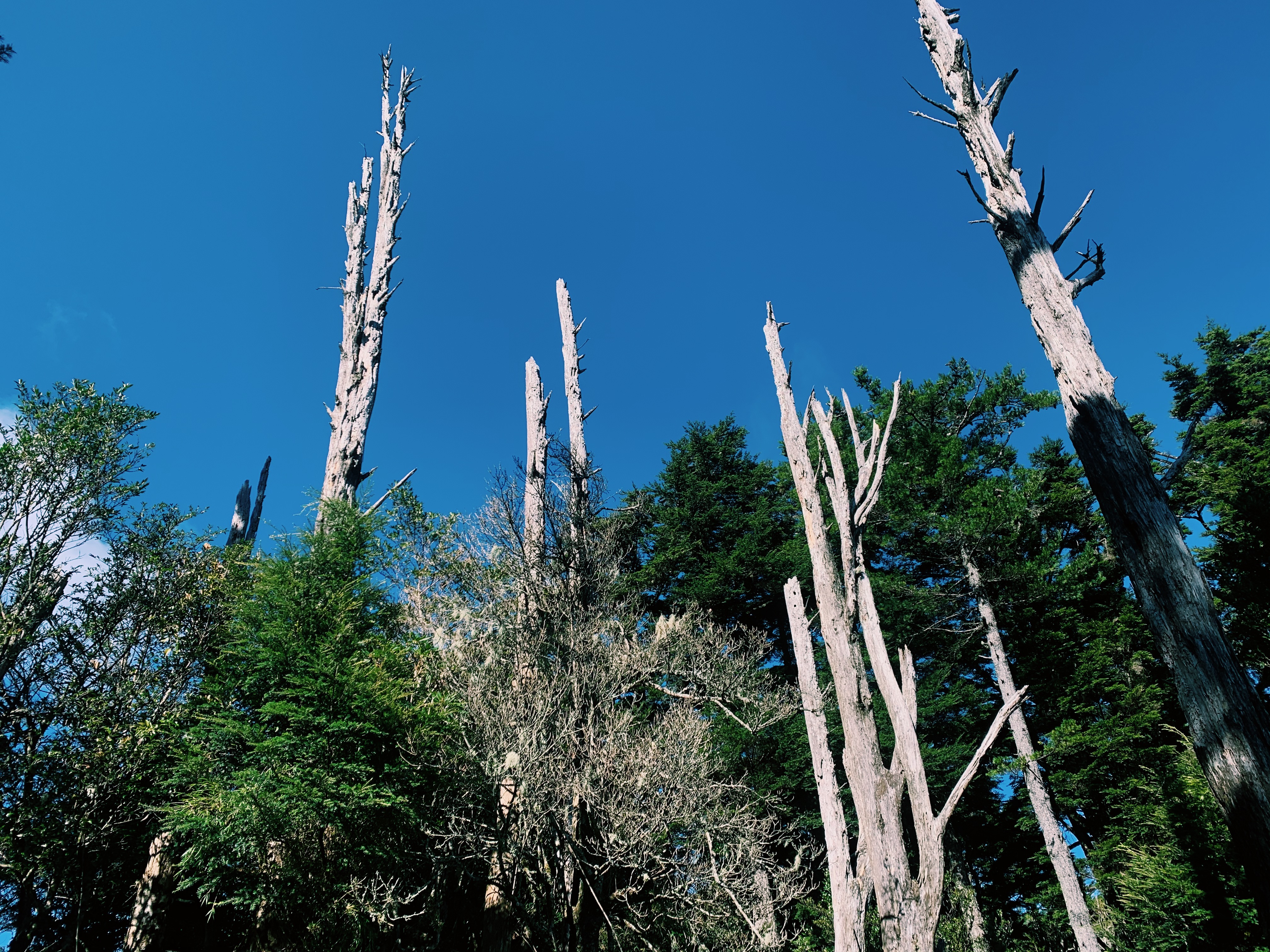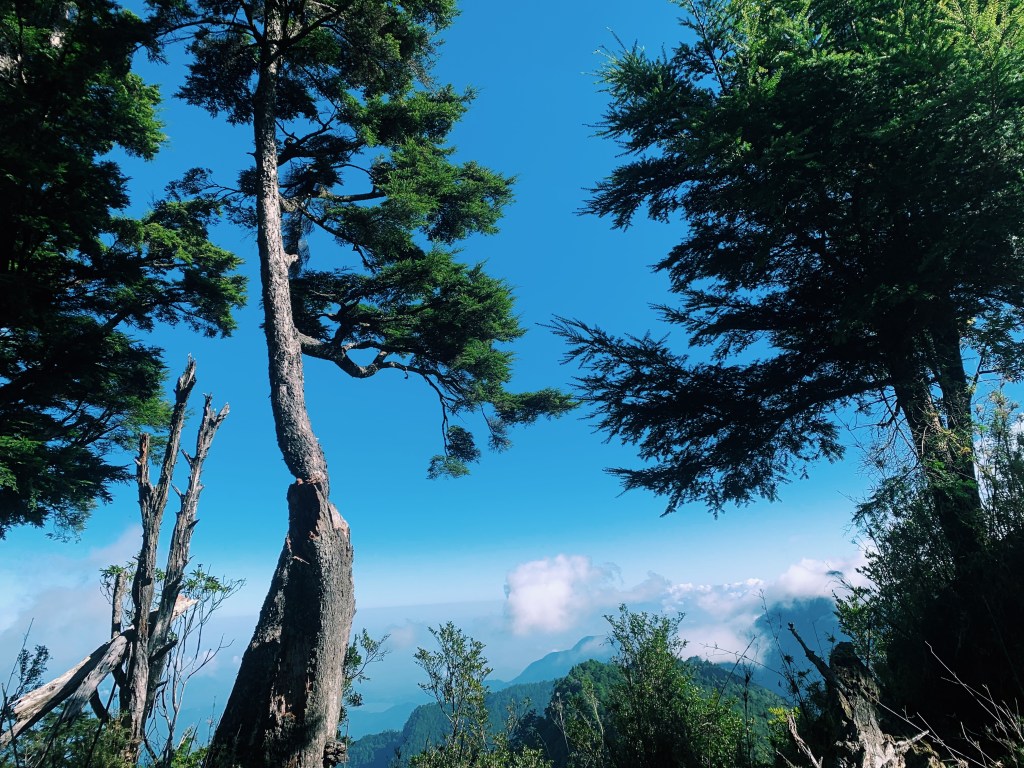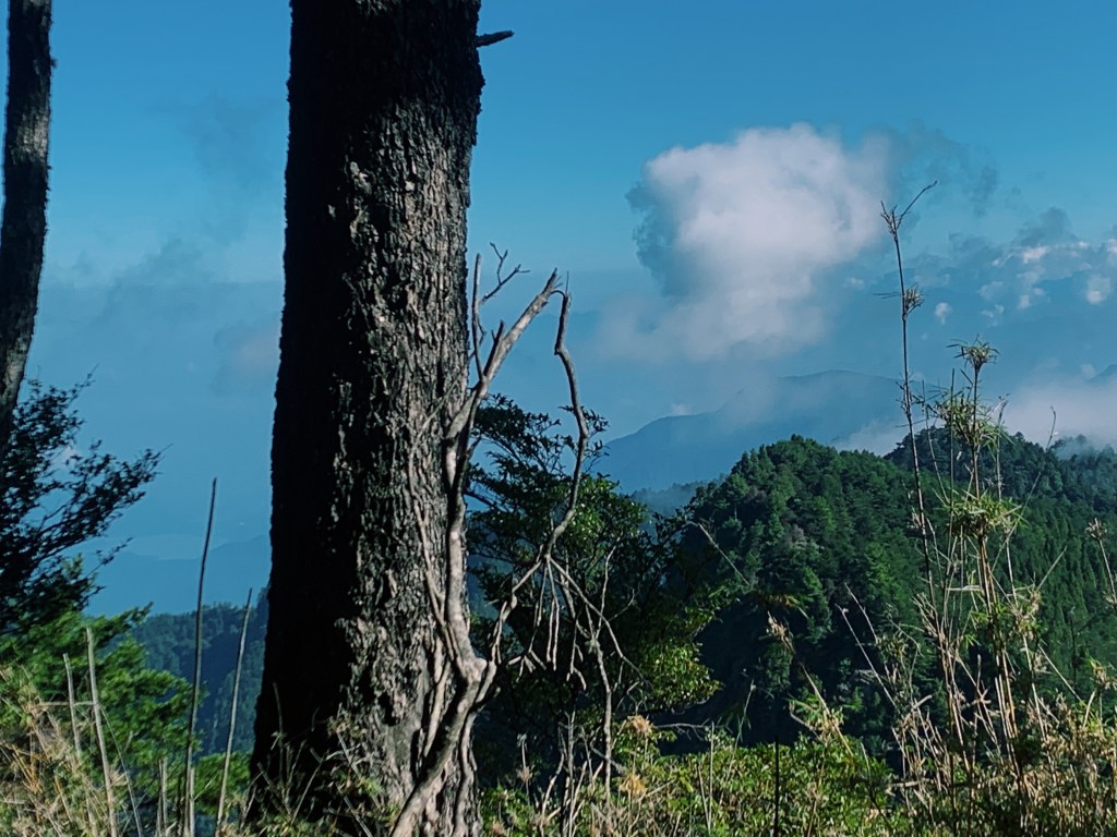 隔日從帳篷往外看到明亮的陽光從樹林透出來,今天看起來也是個好天氣. 在吃早餐的時候也聽到其他登山客從旁經過,通往西巒大山的路徑就在不遠處. 我們也在溫暖的陽光下收拾帳篷準備整裝出發, 上切樹林之字形的方向往上走,跟著沿路的布條路徑走. 漸漸地可以看從樹林看到對面的山巒,湛藍的天空讓人看了神清氣爽. 投射在樹幹上我的影子,也如影隨形. 白色的高聳枯木群聚著,越往上就有不錯的展望, 我們也從這裡看到遠方的日月潭,從這個角度看還真是神奇.