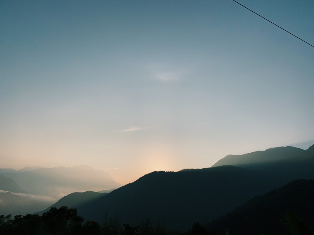 此時天色已經亮起,要載我們的得利卡貨車也抵達. 我們坐在後面開始一段搖搖晃晃的路程,今天的天空是如此的清澈,太陽也從遠方的山頭緩緩探出,橘色的光暈四散,照在朦朧的雲霧上. 隨著太陽升起,天空也轉藍,坐在後座上欣賞這片美景之餘也要不時的注意避開頭頂的樹枝. 車上也來了蚱蜢搭了快速便車,陪同我們開啟這趟旅行的開端.