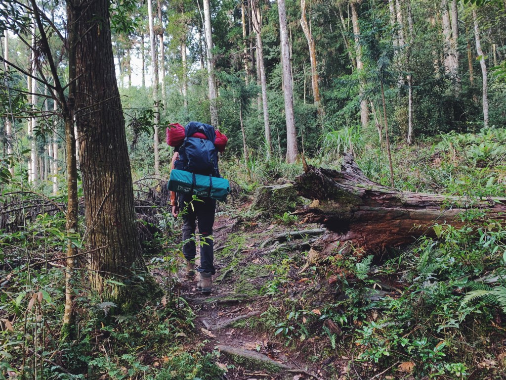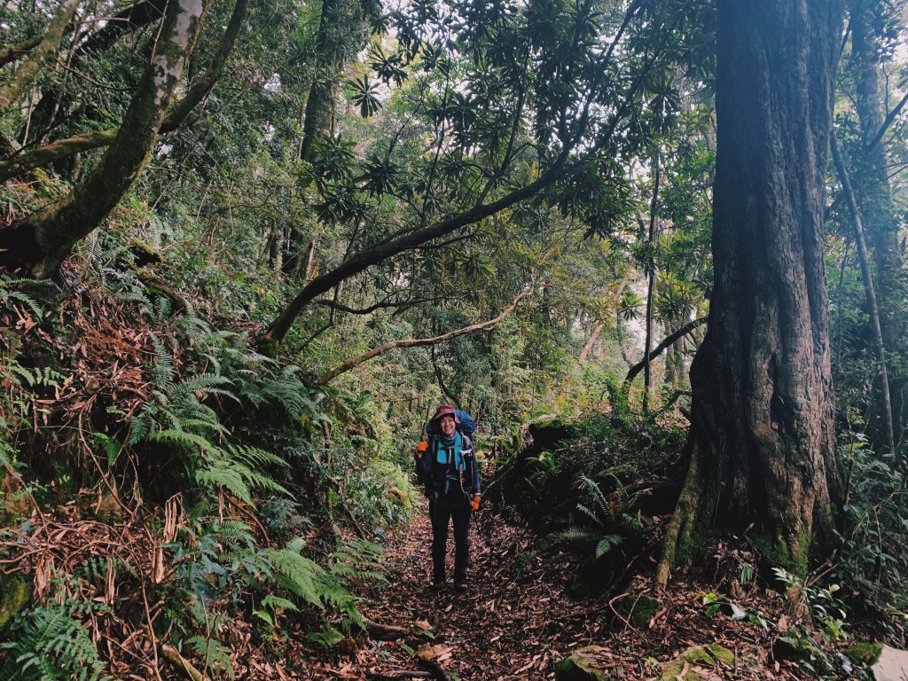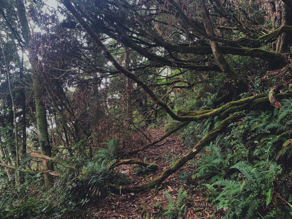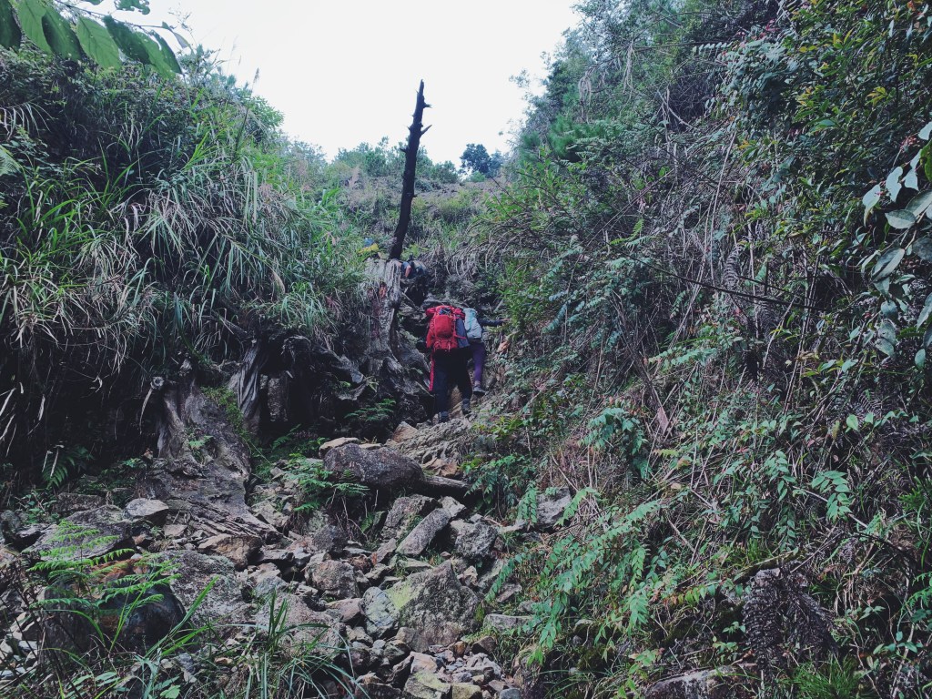 沿途有很多水源,淙淙的泉水順著綠苔落下形成一個小水池,透徹的水浸濕了石壁,被洗的亮晶晶的. 這個林道有著各種地形,讓你像是過關斬將般一點都不無聊.拉著繩行走並小心翼翼的通過水流,因為石面上有水有苔癬特別濕滑. 抓著樹木的枝條往上爬,來到了一片開闊的小小石瀑區,在進入森林內一路往上走. 這一段相較辛苦,開始有比較陡的坡度,需要手腳並用地慢慢往上爬,不過累了也有許多平坦的區塊可以讓我們盡情休息,靠著樹木調整呼吸.