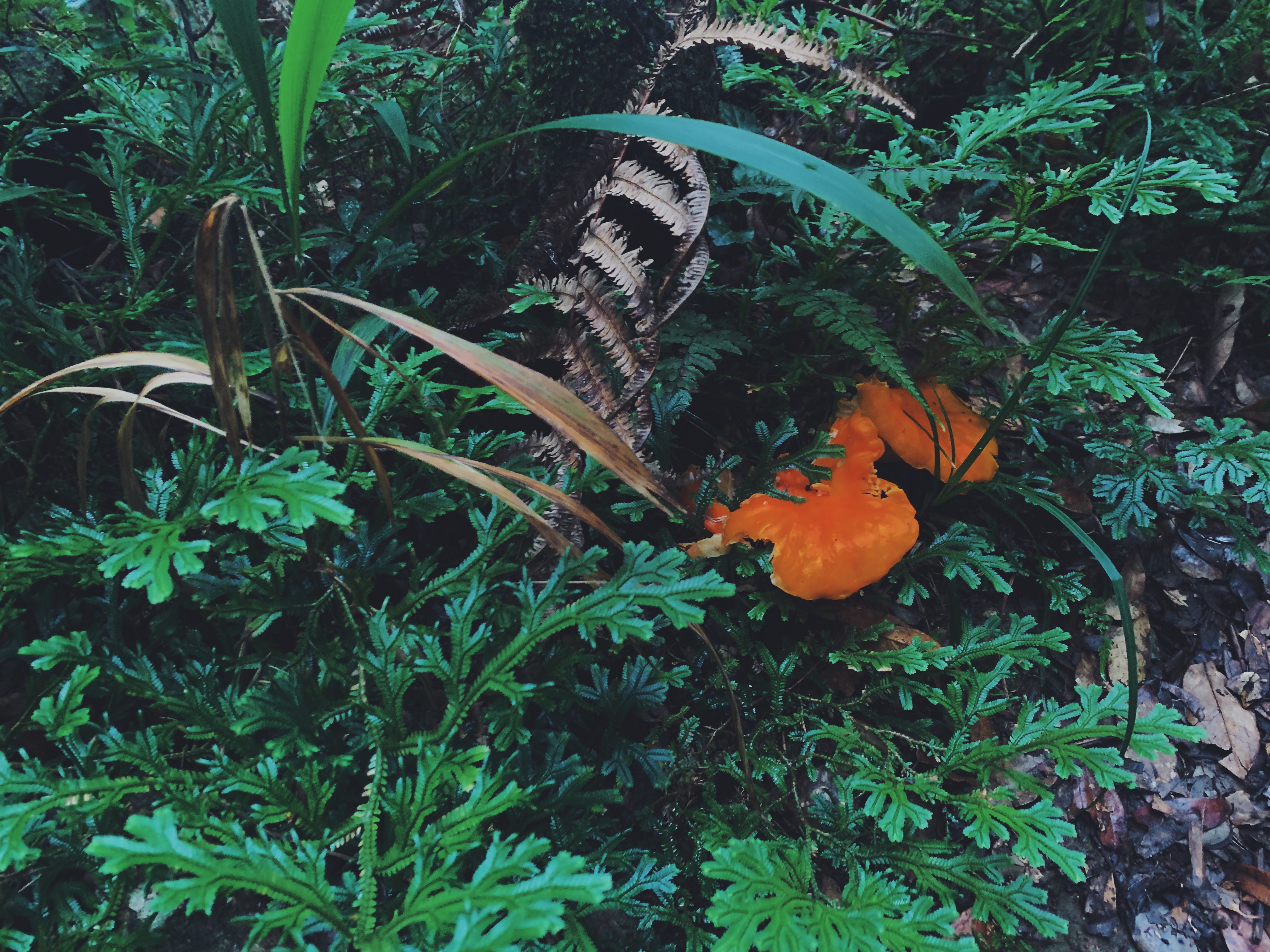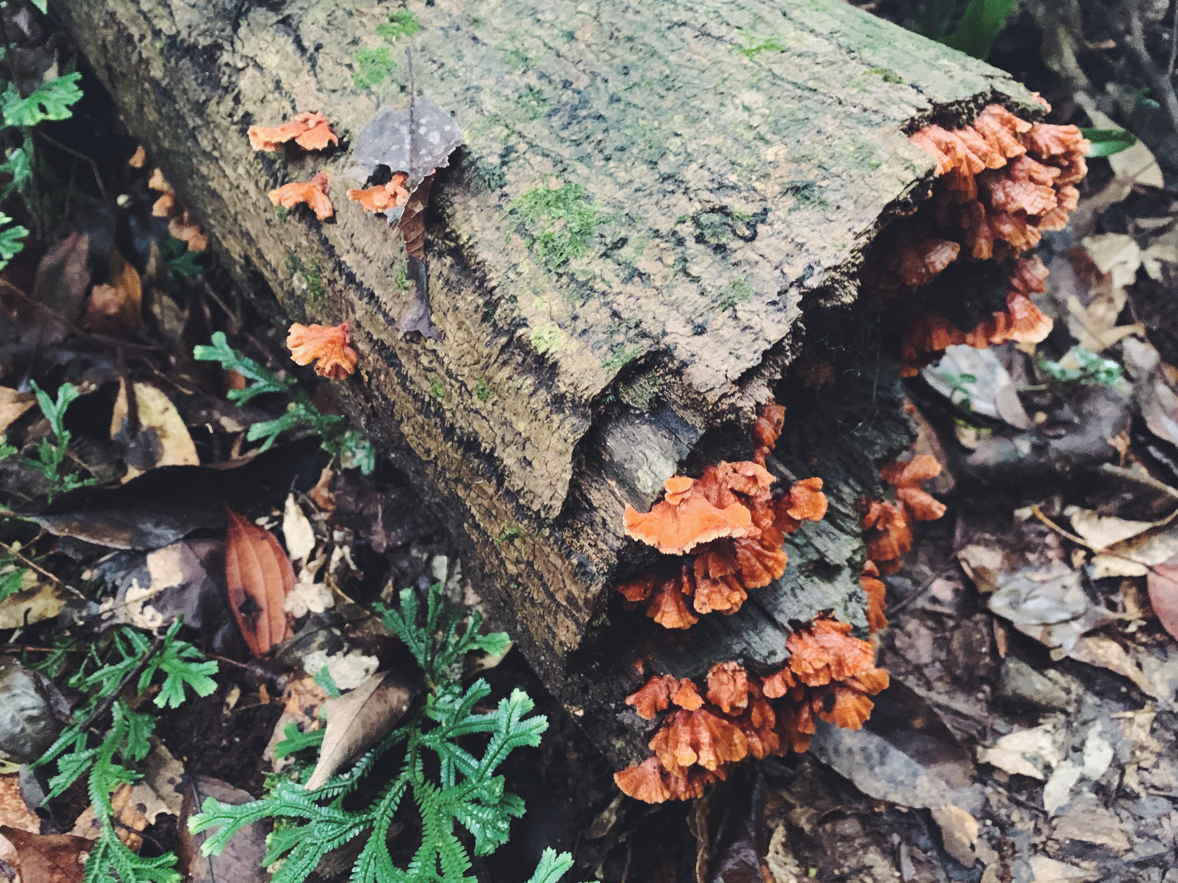 大約一個小時的車程我們到了林道的行車終點,兩邊遍布著高聳的樹林,光線照在樹幹上有著葉子的影子晃動著. 我們從右側起登,開始進入茂密的森林之中. 才剛起登我就無法自拔的欣賞土面上那些蔥綠的植披,環顧周圍生氣蓬勃的植物們. 低身越過蜿蜒的樹枝,那些枝條自由奔放的彎曲生長. 色彩鮮豔的菇類從倒木或濕潤的土地中長出,在這一片綠中如此搶眼. 才剛開始走就如此目不暇給,完全讓人沉浸在這個綠意盎然的森林裡.
