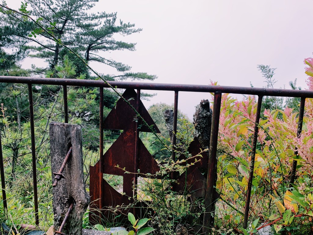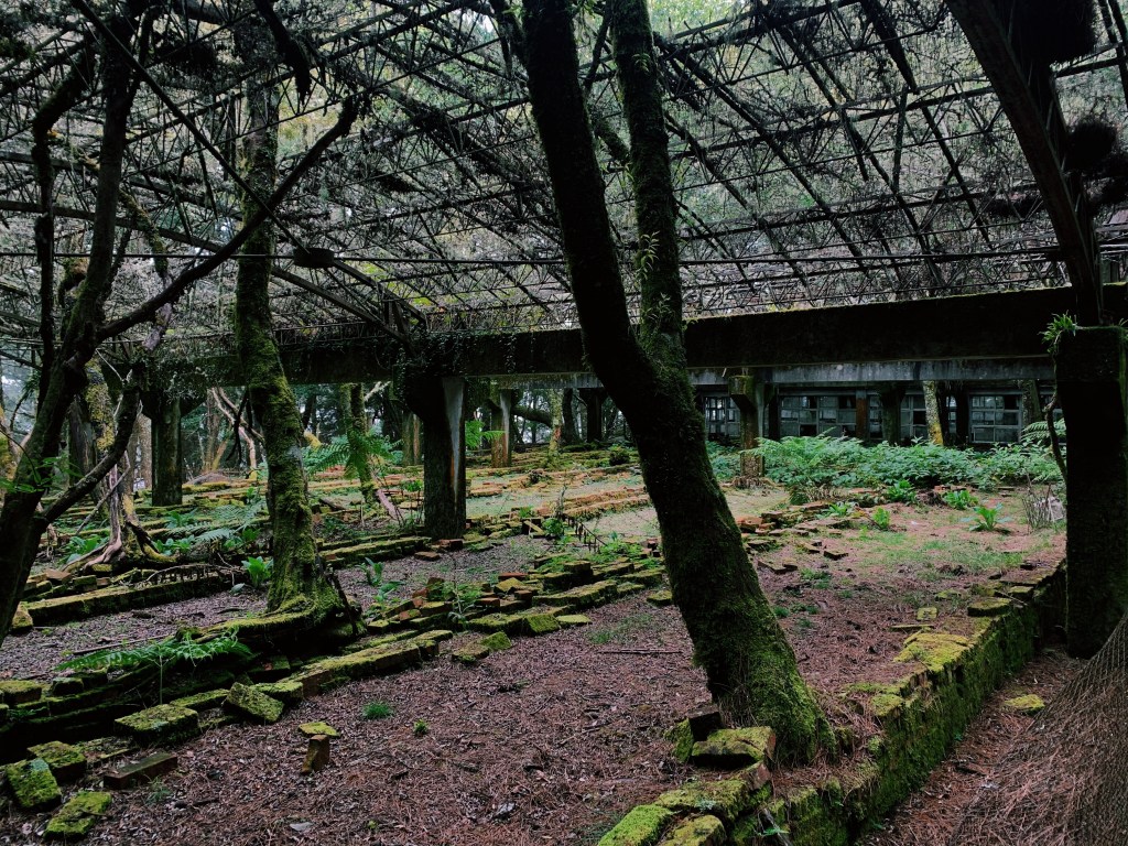 過了大水管與大小落石堆疊的低窪處,又回到了林道. 斑駁的指標上有人用了麥克筆畫了4.0,有植物就這樣在丟棄的保特瓶裡棲息,偶爾看到那些散落的垃圾有時不禁感到可惜,人類可以這樣來匆匆去匆匆,不負責任的留下這些破壞環境東西拍拍屁股走人,讓山林繼續承擔這些本來不屬於這裡的物品. 往上走一段後,整片廢墟牡丹園出現了,林務局曾在此種植400多棵牡丹樹,現在剩下的是溫室的鋼架,樹木穿越破碎的屋頂網架,滿滿的青苔覆蓋著磚瓦. 在此我們也要抵達巒安堂的人倫工作站.