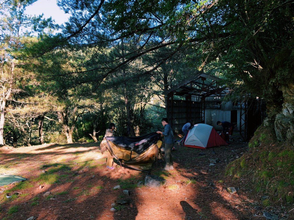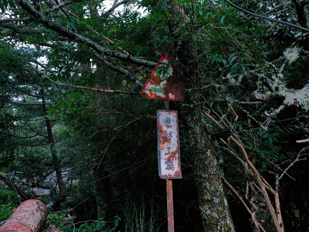 這裡從牡丹園由下而上約有五層,從中央大道上往上走旁邊都是鐵皮,這裡原本是員工宿舍的所在地. 到了第三層斑駁的登山注意事項看板還歪斜的佇立在此, 我們開始找適合紮營的地點,大家幾乎都在第一層的破損辦公室內紮營,幾乎都被占滿. 所以我們決定清幽的在第三層過去的撞球間鐵皮屋旁邊紮營. 平坦的地勢也很舒服, 搭好帳篷後我們先去小溪水源取水,經過了廢棄的發電室,林地也有廢棄的電纜. 我們抵達這裡的時間約下午三點,取完水還可以悠閒的探索一下這裡.