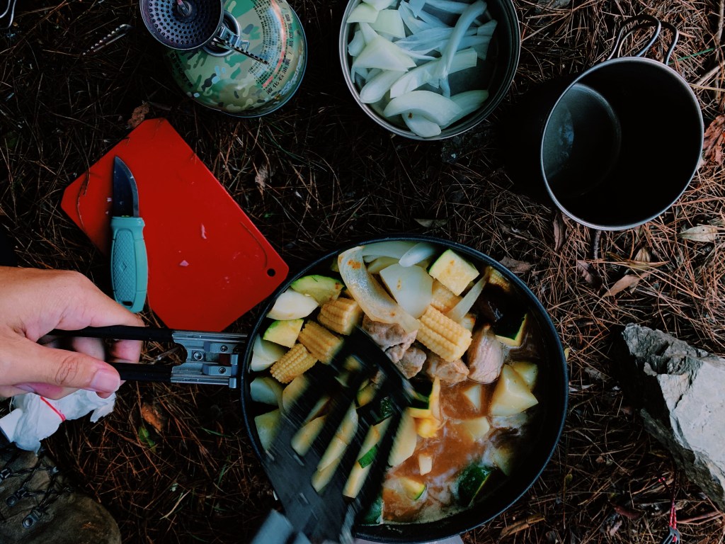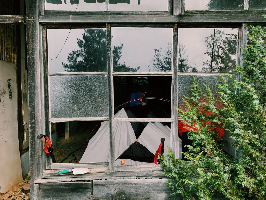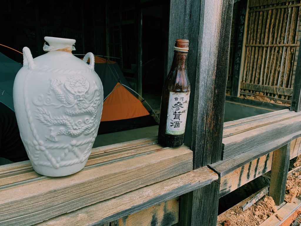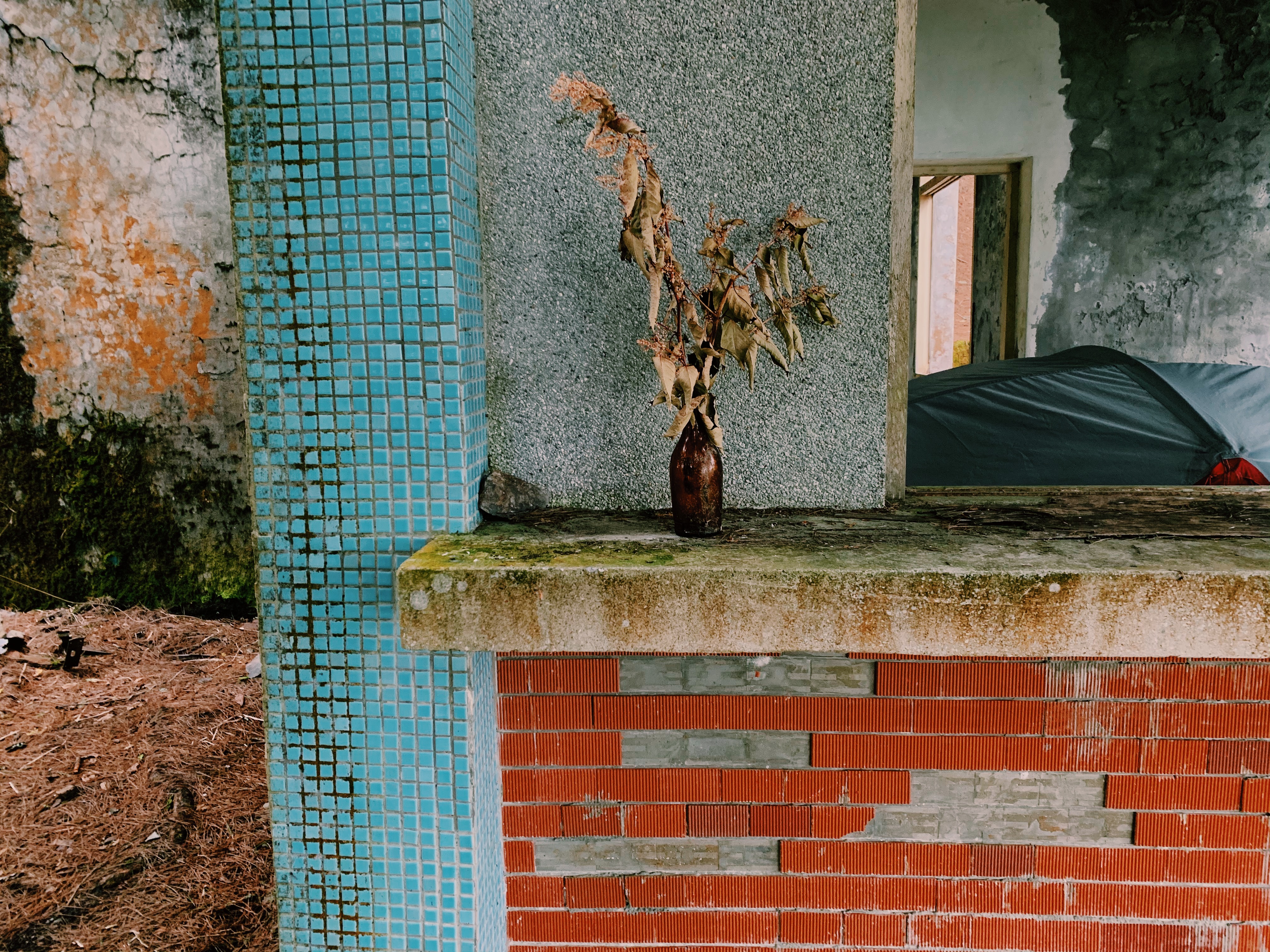 我們沿著鐵鏽色的欄杆走上第一層, 辦公室內紮營的各自找到舒適的角落聊天煮飯泡茶, 我左側走有個水泥建築,這裡曾是福利社,外觀鑲著水藍色的馬賽克與紅色的磚瓦,外頭的玻璃瓶不知是誰插了一個斑駁的葉子看起來很有味道. 第一層最左側就是曾經供奉福德正神的巒安堂,廟宇外頭的彩繪已經淡化,但是還可以清楚看到圖樣, 木造的小廟宇在當時守護著這裡的人們. 探索完畢後我們回到我們的營地去煮晚餐,今天的晚餐極為豐盛,有松阪豬蔬菜湯咖哩之外還有椒麻雞胸肉炒洋蔥,現在用Trangia煮飯神器越來越熟練,都可以順利的煮出香噴噴的米飯.