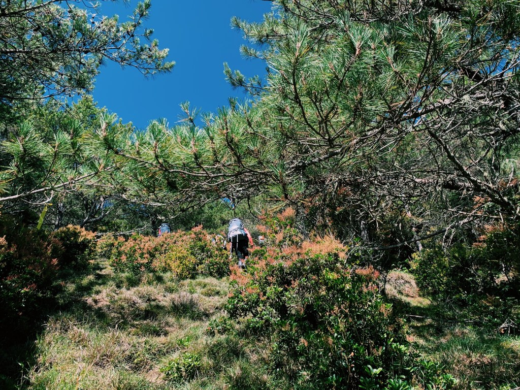 途中有一棵從樹幹上長出茂密樹枝的樹,不清楚那個是什麼樹但是那個外型很帥. 水坑在光線的照耀下捕捉了反光的彩虹. 繼續往上經過一欉欉的馬醉木,垂墜著紅色花朵, 這時候開始有點氣喘吁吁, 但慢慢地聽到山頂的人聲, 終於抵達了山頂. 山頂的腹地很小,有一個半倒塌的瞭望台和一個水泥的避難所. 山頂上很熱鬧,也有許多從傳統路線上來的人,這裡的展望不多,不過剛剛一路的美景已讓我很滿足,吃著自己做的手工餅乾配上咖啡真享受.