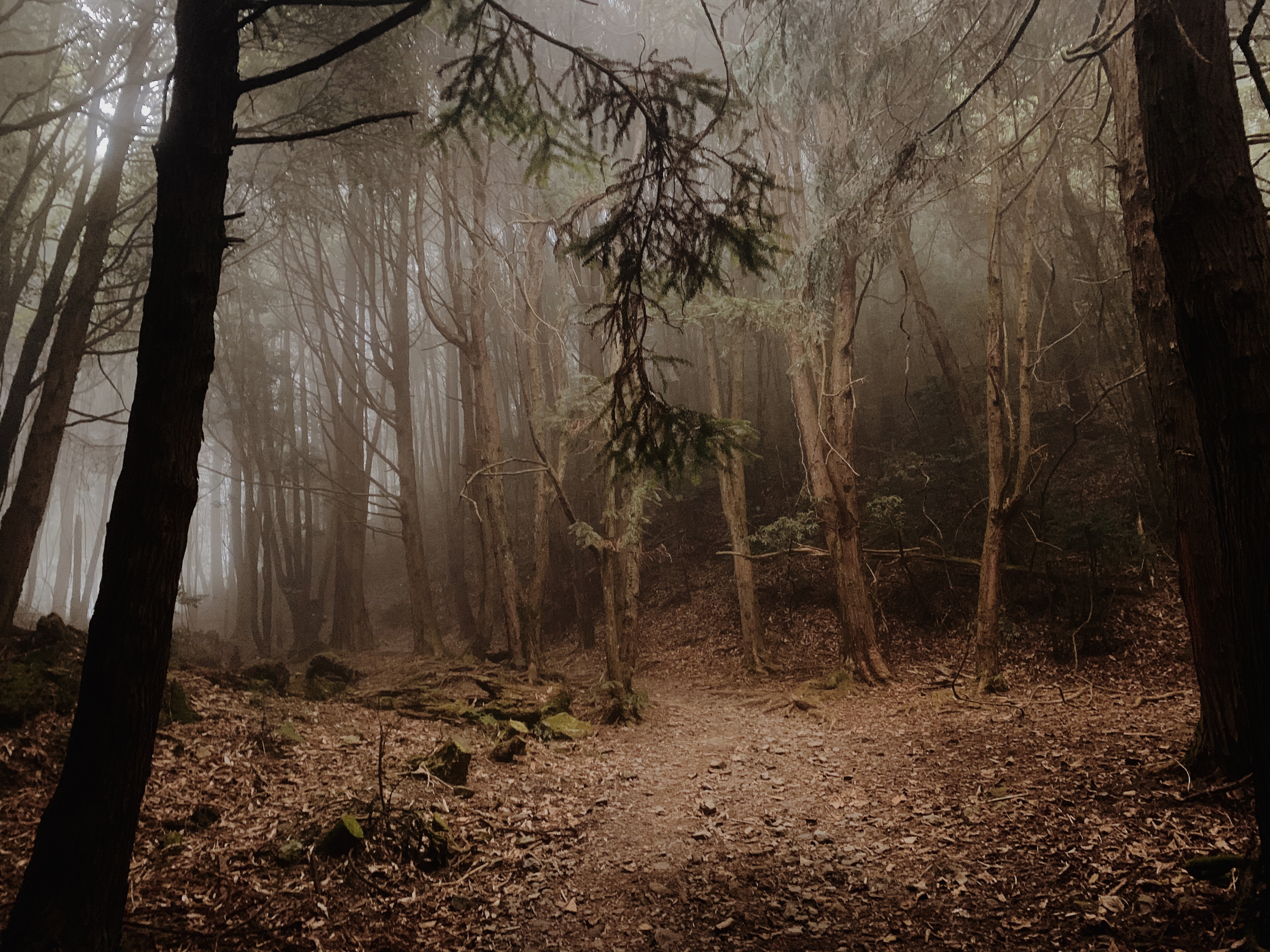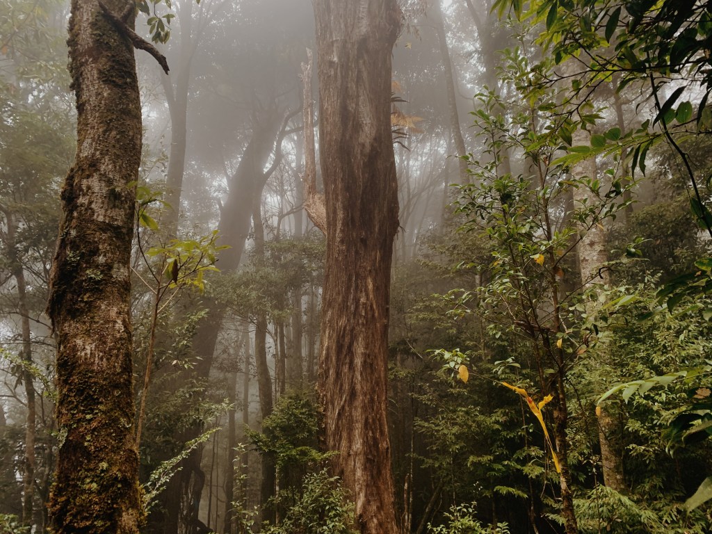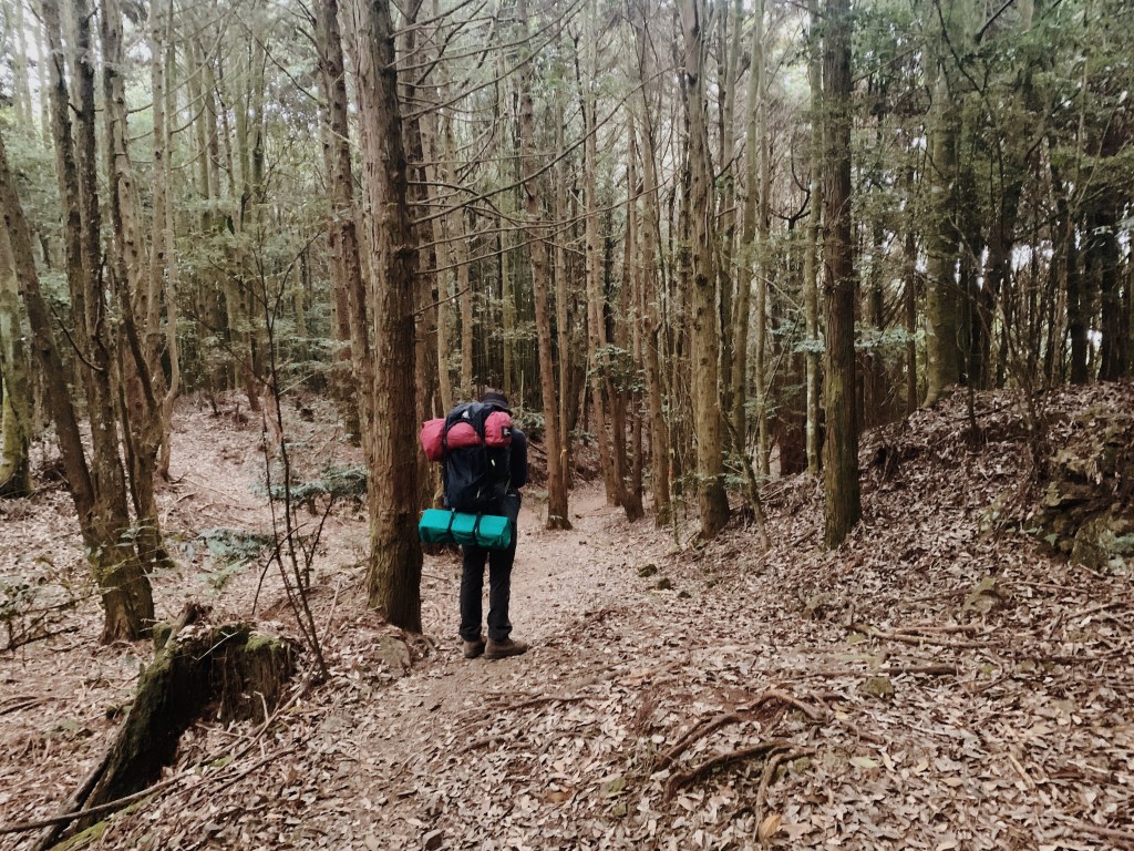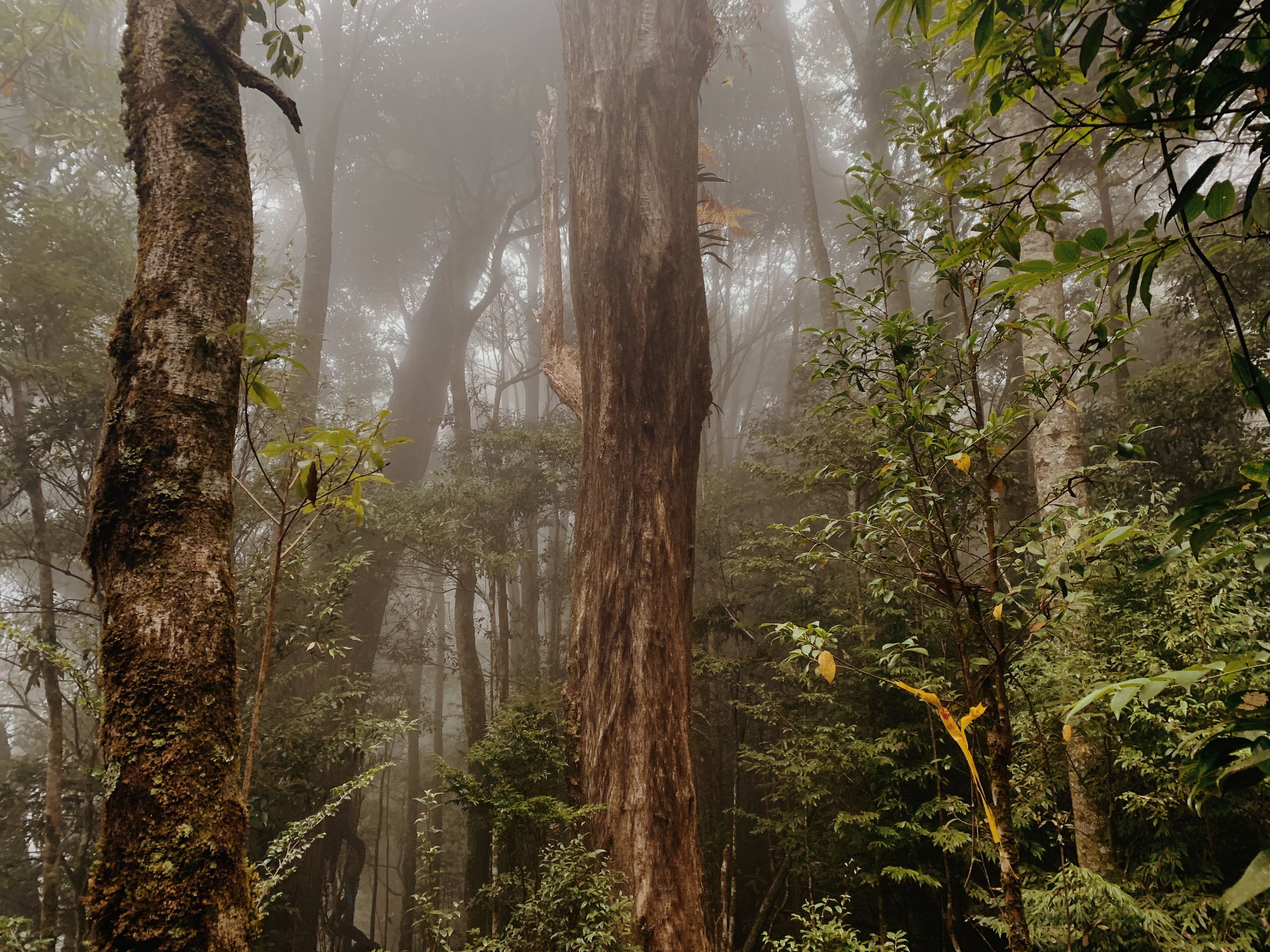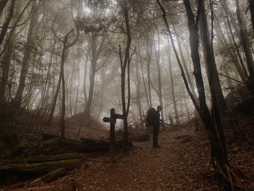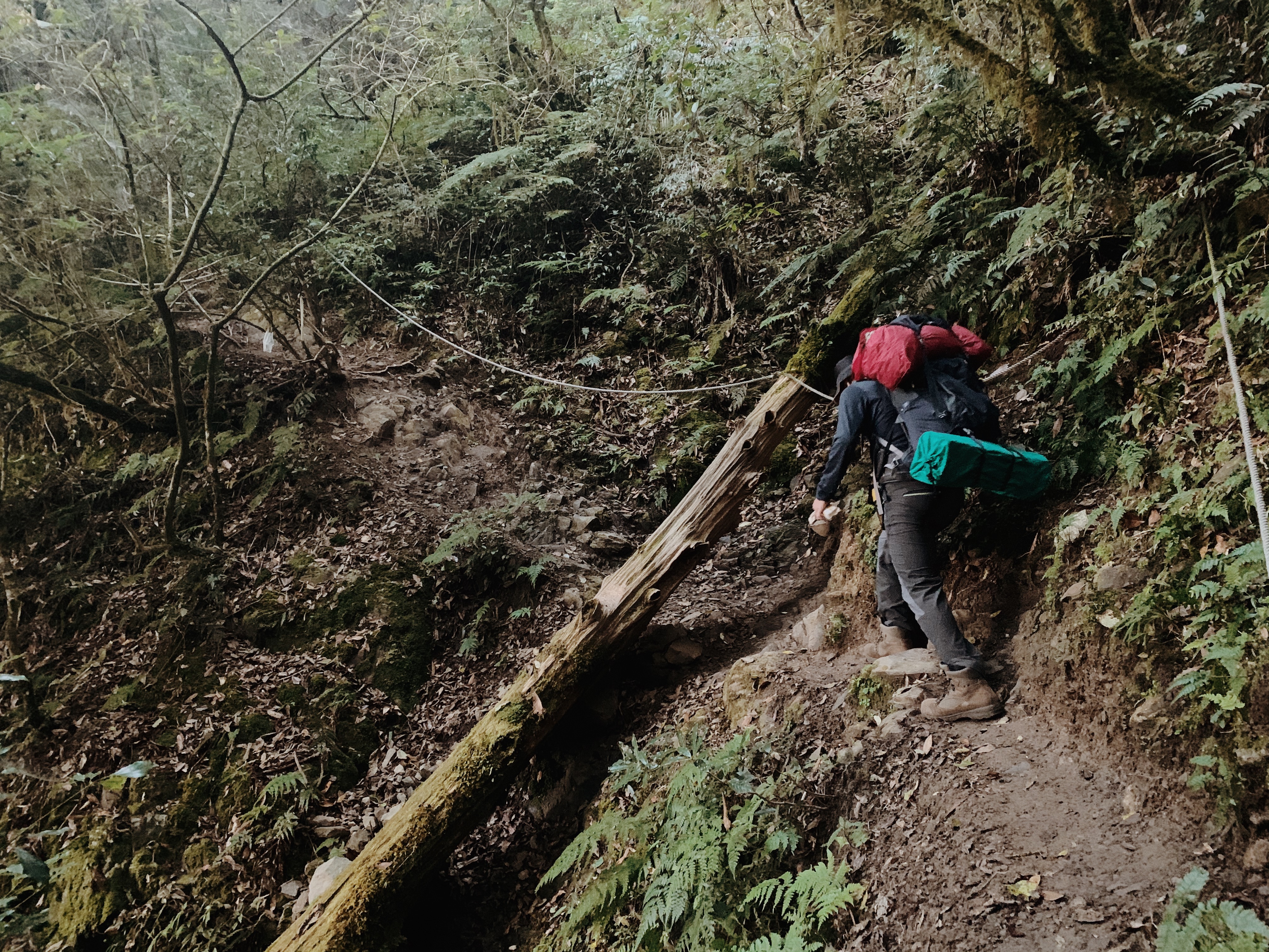 我們抵達了東洗水山的登山口(27.5K),此次並沒有要去登頂東洗水山,所以我們繼續前行. 從這裡我們漸漸的被一整片柳杉和香杉所圍繞, 接近下午的時間霧氣開始濃厚起來,讓整片森林更顯迷幻. 途經有一灘泥濘的水坑,本來還很擔心鞋子是白底會不會立即弄髒,想不到踩過去不僅沒有沾一堆泥土,也不會走起來很濕滑. Gateway Mid登山健行鞋的鞋面的防潑水材質也讓鞋面保持乾爽. 加上我腳很容易流腳汗,除了防水鞋子本身的透氣性對我來說相當重要, 好在這雙鞋透氣度很夠, 不會把熱氣悶在鞋子內部.隨著白霧逐漸瀰漫,我們也到了北坑山的登山口. 一群在木桌休息的人很熱情的邀請我們喝茶,不過我們要抓緊時間趕路,所以沒有多做停留.