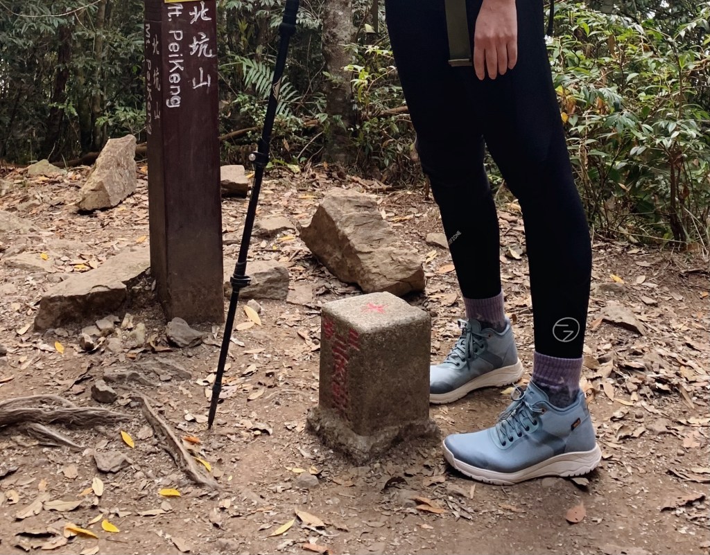 北坑山有兩個路線,其一是登山小徑,約1.38K,距離較短但起伏大. 另一個是木馬道,約1.59K,距離比登山小徑長一些,但較為平緩. 我們選擇走木馬道, 走在幽幽的造林樹中. 在與登山小徑的會合處,開始要走木製陡階上行約280M. 由於鞋子本身不帶任何重量,在上階梯時雖然陡峭,提起腳往上踏的每一步感覺很輕盈. 輕量化設計就是這款鞋子的主打要素,減少不必要的材質讓鞋子一體成形更俐落.抵達了北坑山的山頂,這裡平台不大.