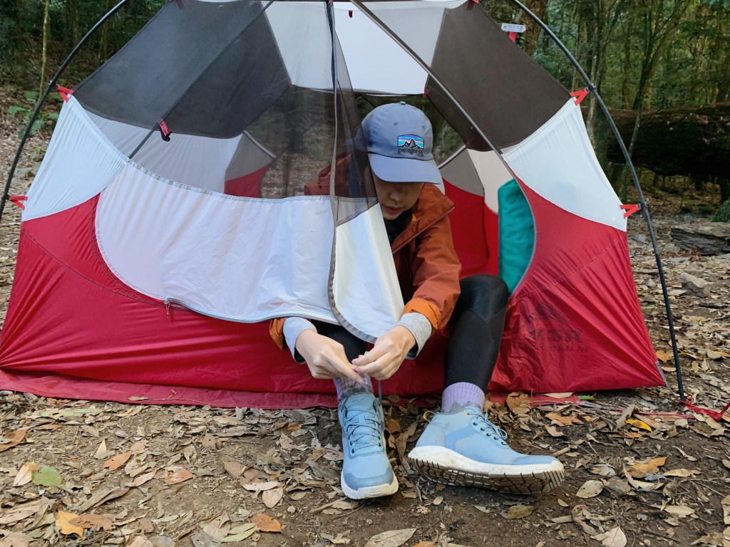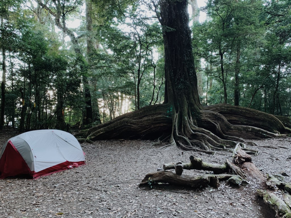 天色逐漸轉暗,我們終於看到大板根了! 心裡不禁讚嘆著這棵神奇巨木,同時也趕快紮營和煮晚餐. 搭好帳篷脫鞋子時赫然發現這次鞋帶都沒有鬆脫耶,鞋帶本身的穩固性蠻夠的,對我這種綁鞋帶有點手殘的感到很有成就感. 重點是鞋子的織帶有個很大的亮點,是環保快乾再生織帶. 我喜歡Teva將環境的「永續發展」放入品牌的核心之中,喜愛大自然也會希望自己使用的東西不會為環境造成負擔. 今晚只有我們在這裡紮營,入夜後聽到葉子與風的沙沙聲,還有像是山羌的叫聲. 我們在大板根的陪伴之下度過了一晚.