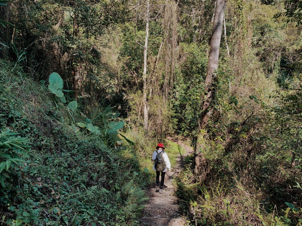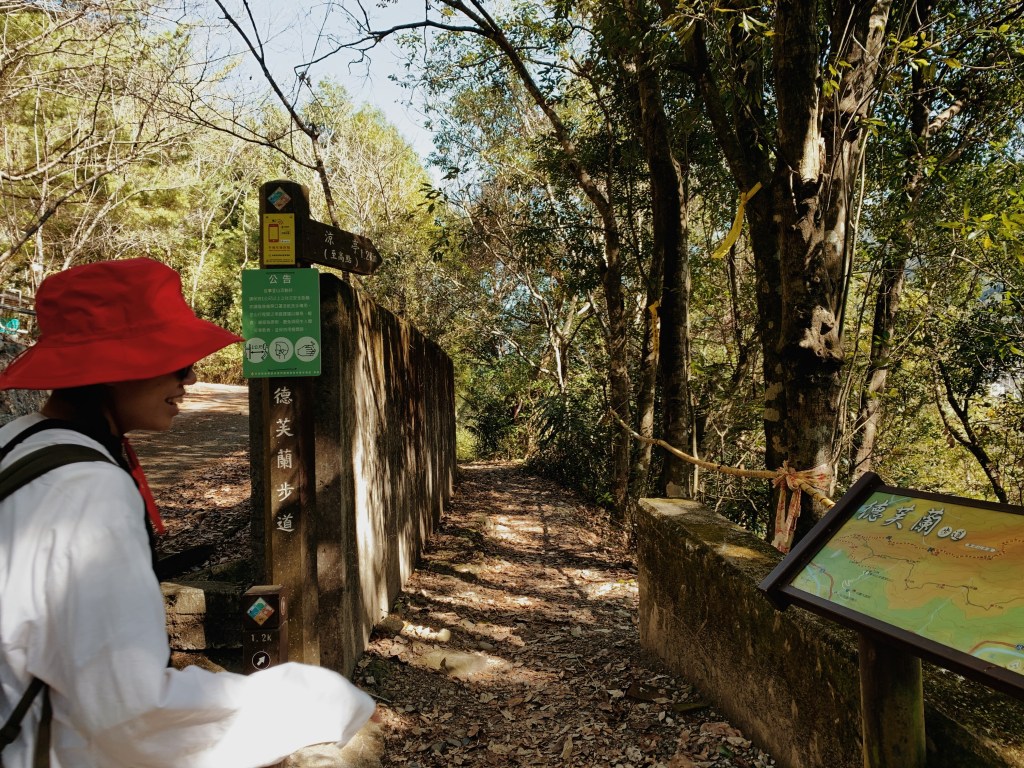 德芙蘭生態步道口有個空地可以停車,且旁邊有個公共廁所很方便. 此步道是由台電保線路下去改建的,當時在921地震後,為了振興當地產業所興建. 我們取右邊的入口開始進入步道,一走進去路徑狹窄往下,立即就進入充滿綠蔭的森林之中. 陽光穿過闊葉林,投射在豐富的植物叢中. 因為這裡海拔比較低,比較適合秋天或冬天來走起來會比較舒服. 沿途欣賞著茄苳等巨木,踩著原始堆疊的石階,葉子在微風中沙沙作響著.