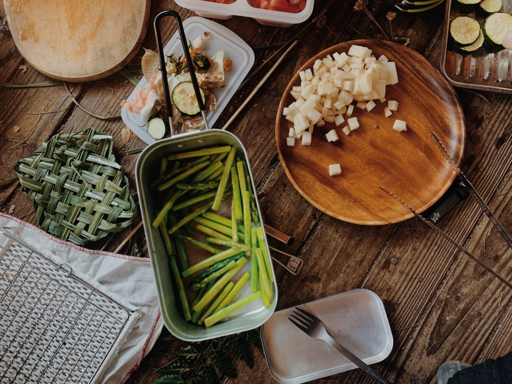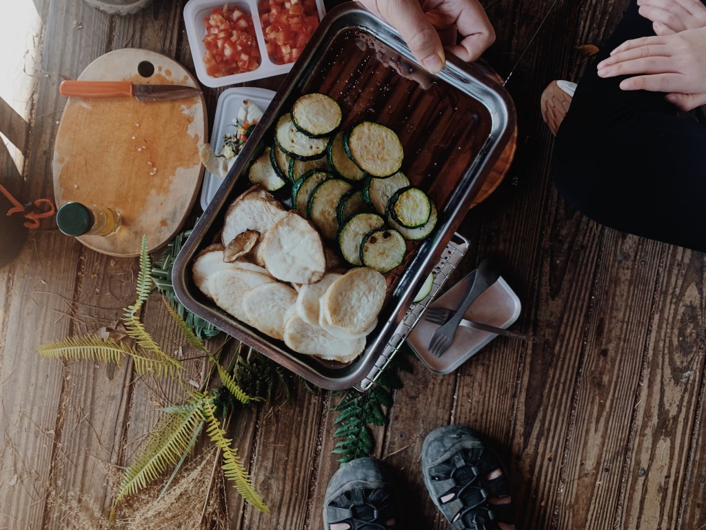 看到高壓電塔後,就回來到木造的涼亭,這裡超舒適的! 只有我們還有另外兩個登山客,沒有吵雜的人群,讓我想到上次在大凍山的山頂那個人潮真的是嚇死我了. 在開始野炊之前我們像是小孩般的到處看看,我朋友甚至用了芒草葉編織了一個小墊子. 自從上次跟朋友一起在野外用了一次陶瓷燒烤網,就也愛上了! 會想要發想各種運用這個烤網的食譜. 我買的是丸十金網京都金網陶瓷燒烤網,此烤網最主要可以烤各種不出水的食材 – 吐司,蔬菜,年糕等自由發揮.