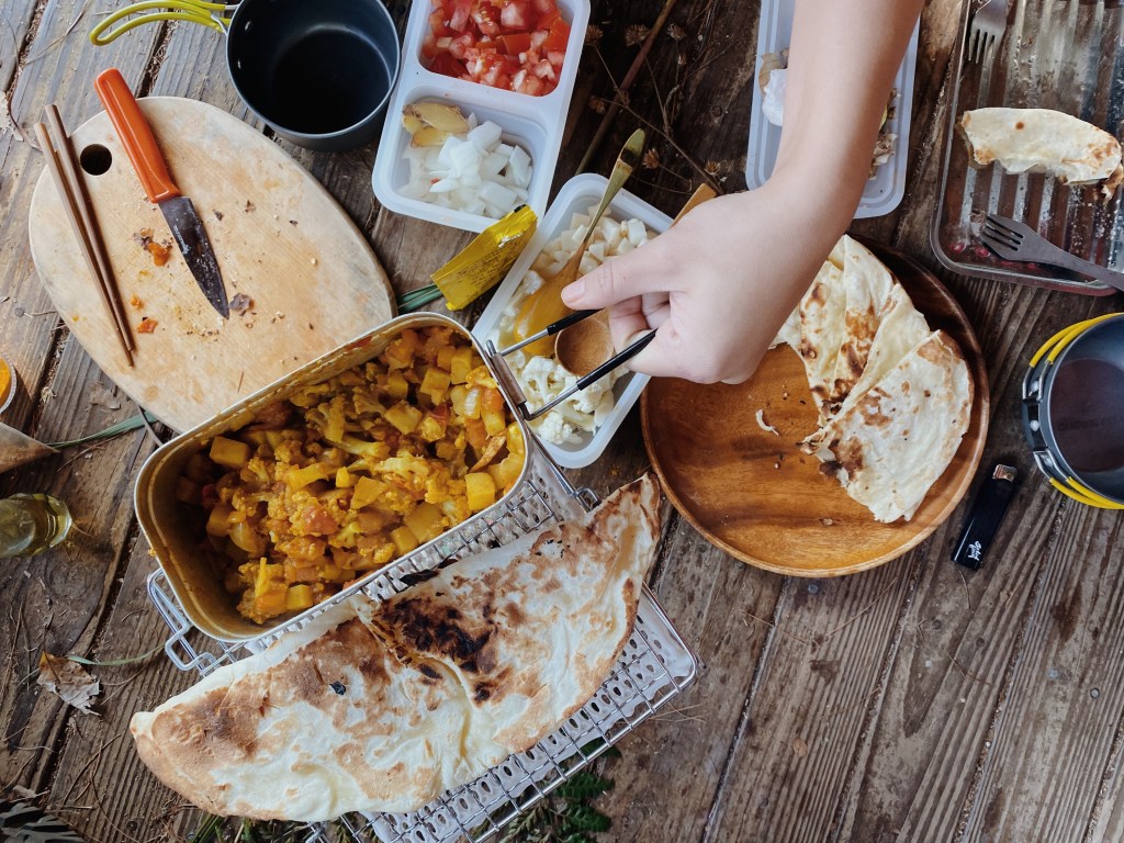 我們這次的野炊料理為烤蔬菜 – 櫛瓜與杏鮑菇, 主食是不用咖哩塊從香料開始煮起的Masala咖哩,至於烤餅的部分是現成的,前一天去台中的香料屋印度料理店購買. 最後在煮蘋果茶配波蘿麵包. 而Masala咖哩是我朋友所提供的食譜,她在英國的時候很喜歡煮這道料理,甚至會到天天煮的程度. 這個咖哩煮起來真的蠻需要時間,基本上我們也是採用簡化的流程. 當我們把開始備料,用準備的用具烹煮時,旁邊的山友看呆想說我們是要煮什麼料理.