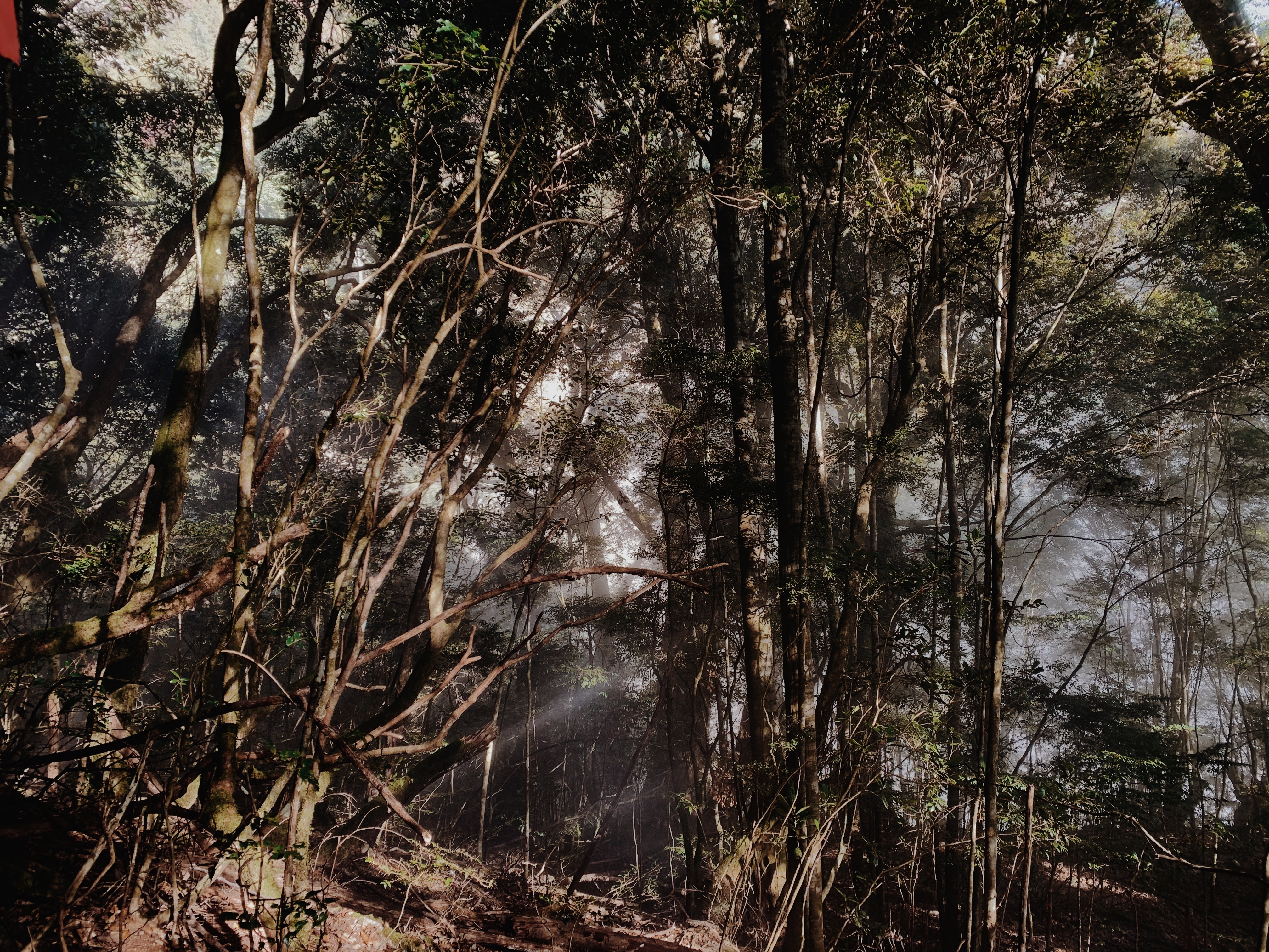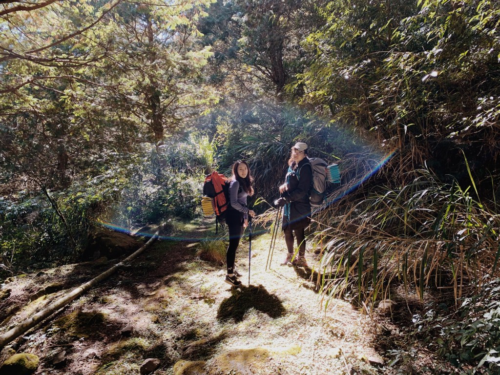 抵達登山口時剛好一行人也準備出發,我們大約下午兩點正式從登山口啟程. 出發時稍有雲霧,滿地的紅榨楓鋪滿了整個地板,像是紅地毯般的迎接我們. 穿越了幾道看似沒有路徑的芒草叢,柳暗花明的鑽了出來走在綠草如茵的林道上. 接下來要上切,應該要從斯拉巴庫山登山口切上去,當時我們是往前走一小段才切上去.不過也隨著布條也切回林道. 這一段比較辛苦,陡上的地形藉由抓著樹木的枝條慢慢的往上走. 樹林是如此的茂密充滿生氣,樹身和石頭都穿起了綠衣裳,大口呼吸吸收森林中的芬多精.