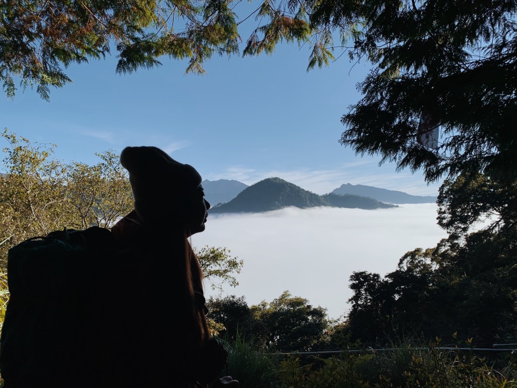 陽光穿越葉間的縫隙呈現一道道的光束,微微的霧氣在光的照耀下飄動著. 在一個樹林開口處,一回頭時我驚嘆:天啊! 太美了!是雲海啊!! 我心裡止不住那興奮的心情,綿綿的雲海一望無際,對面的山頭從雲中探出來,就像飄在天空中 我們在那裏欣賞雲海時忍不住一直發出讚嘆聲,剛好對面那座山就叫出雲山,就在思考著是否是因為這樣而得名呢. 在太陽的照耀下,那一片白雲是如此耀眼. 藍天,雲海,太陽以及山景的襯映下,一路讓我們大飽眼福. 這時候我們也從樹林中走出來了,滾滾的雲海就在眼前展開,這個畫面只能親眼所見才能真正感受.