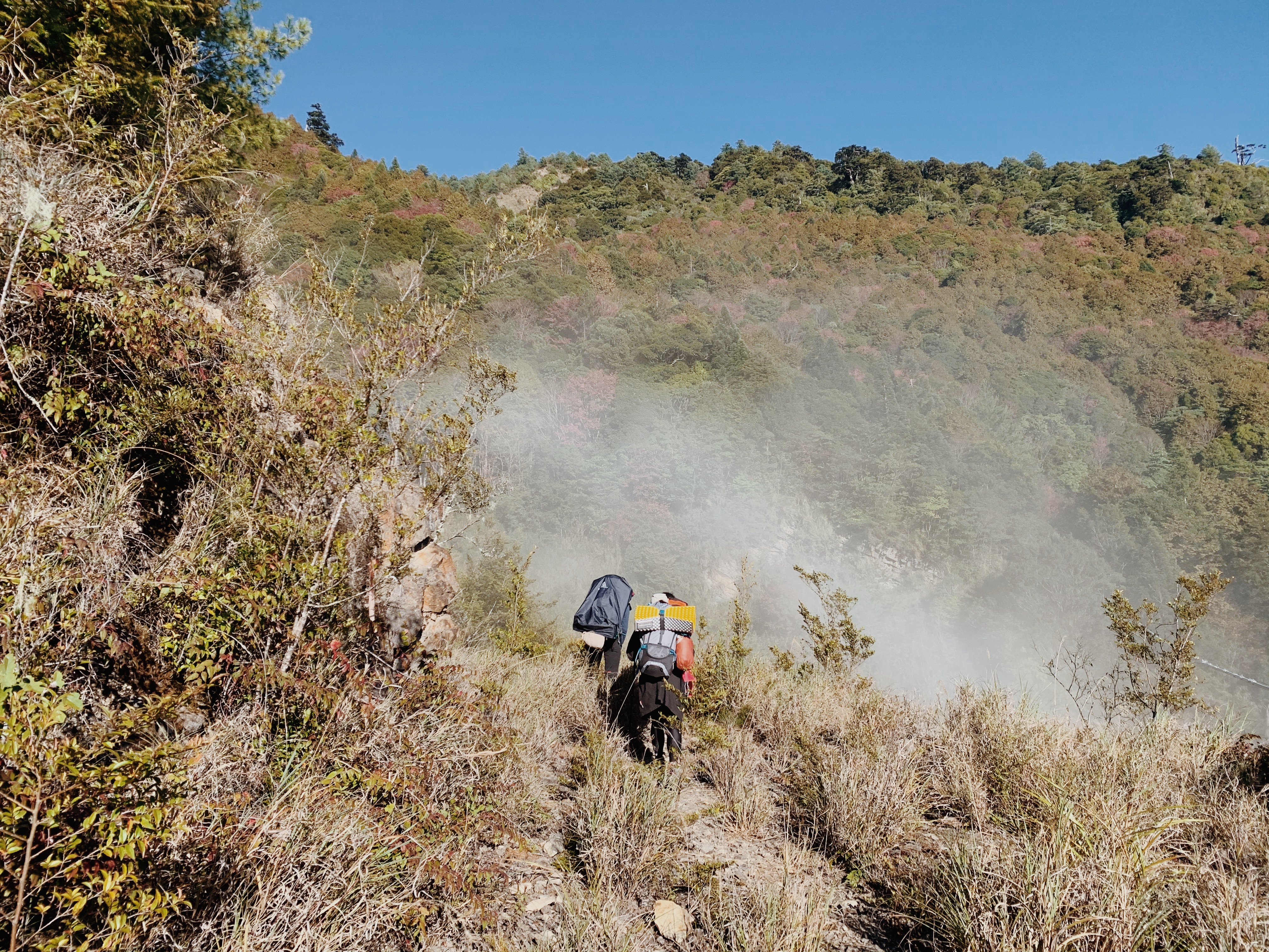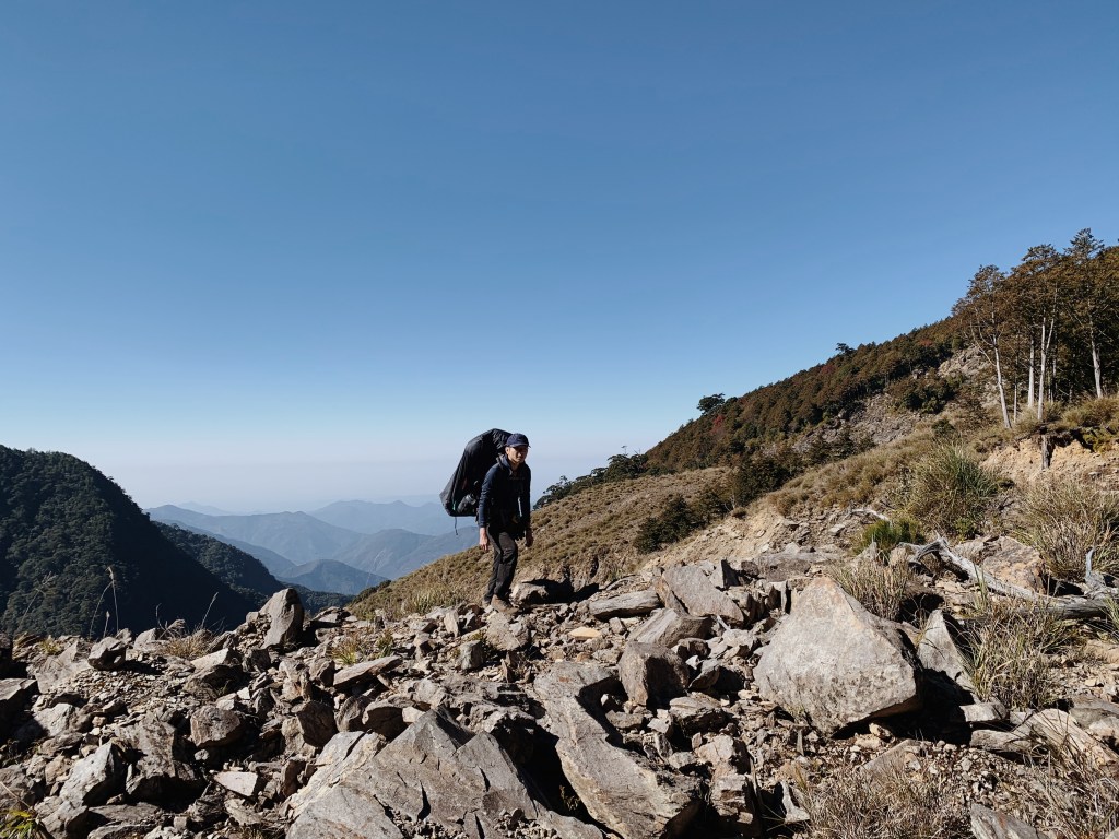 早上大家悠閒的吃著早餐,在開闊的營地裡到處看,而水源就離營地很近,源源不絕的水流就從山上流下來. 太陽也漸漸升起,陽光也覆蓋了整個營地. 曬著溫暖的陽光真的是太舒服了! 將一身的寒氣都逼退. 裝備收拾完畢後,我們開始返程,回頭望那片營地真的猶如一個世外桃源. 回到昨天看夕陽的地方,蔚藍色的天空與層疊的山巒相接. 攀回崩塌處的制高點,耀眼的光芒讓山頭都清晰可見.