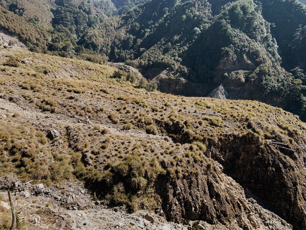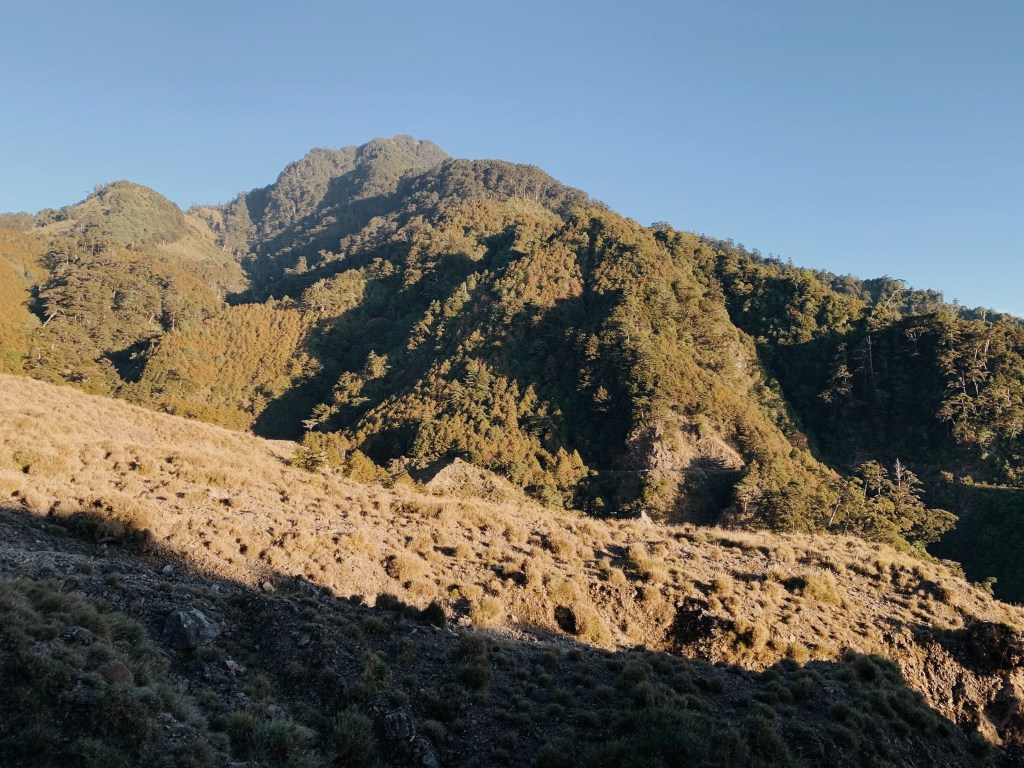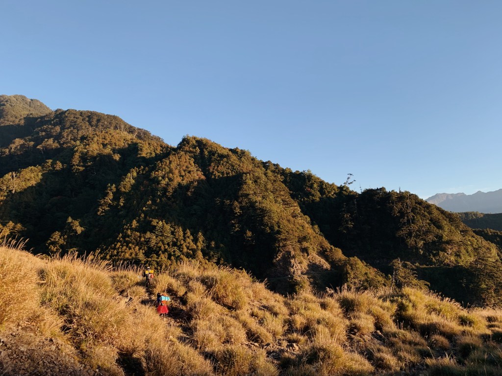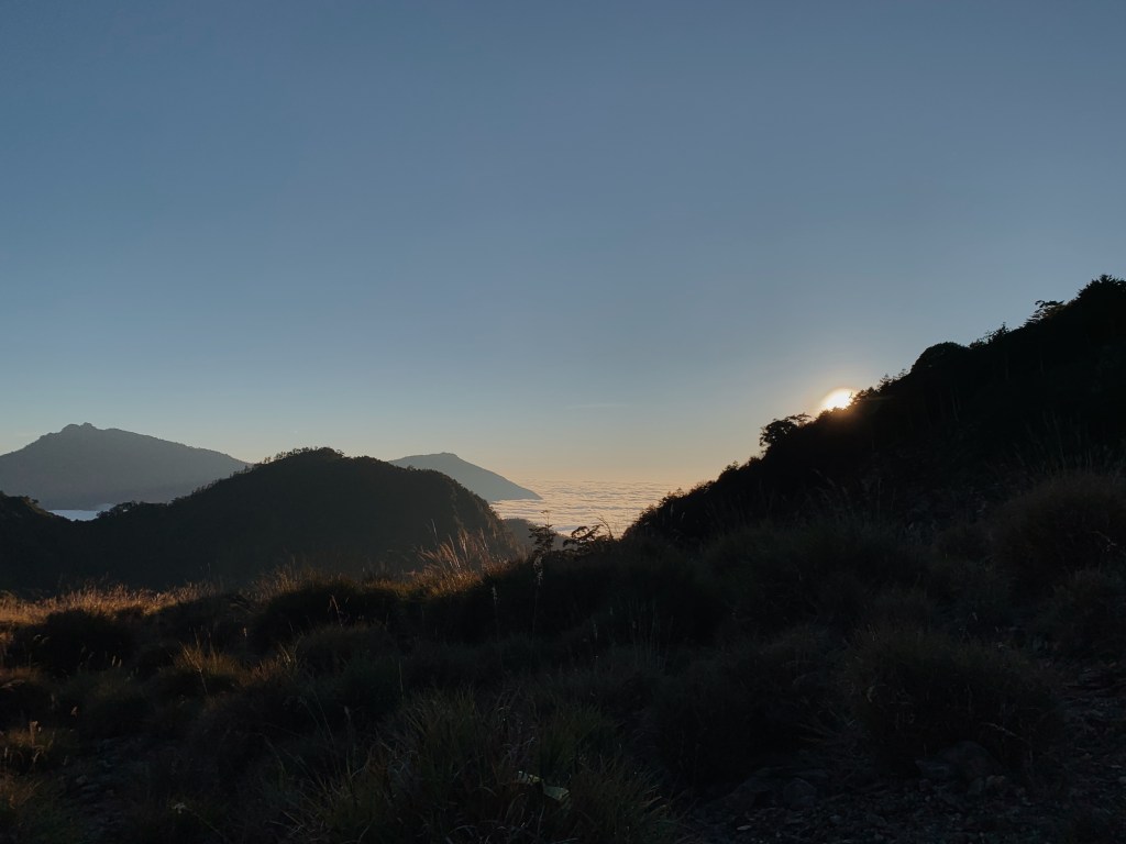 接續腰繞的路徑,這裡有一個小崩塌處,需要拉繩往下踏. 陽光的顏色轉橘,斜射在下方的凹谷上,遠看一叢叢圓滾滾的草像是小精靈一樣. 下到凹谷處,要在各大石頭中穿梭,跟著前人疊石的方向前進. 這時候太陽西下,對面的山頭也在黃昏的映照下,染成金黃色. 這時同行的朋友走到旁邊的山丘上想去看看雲海還在不在,他走在上方時對我們大喊說:你們絕對要上來. 果然那雲海日落美到令人感動,天空從灰藍色到橘紅色的漸層,太陽就懸在天空與雲海的交界處正要緩慢落下,我們揮著手跟2021的第一顆日落說晚安.
